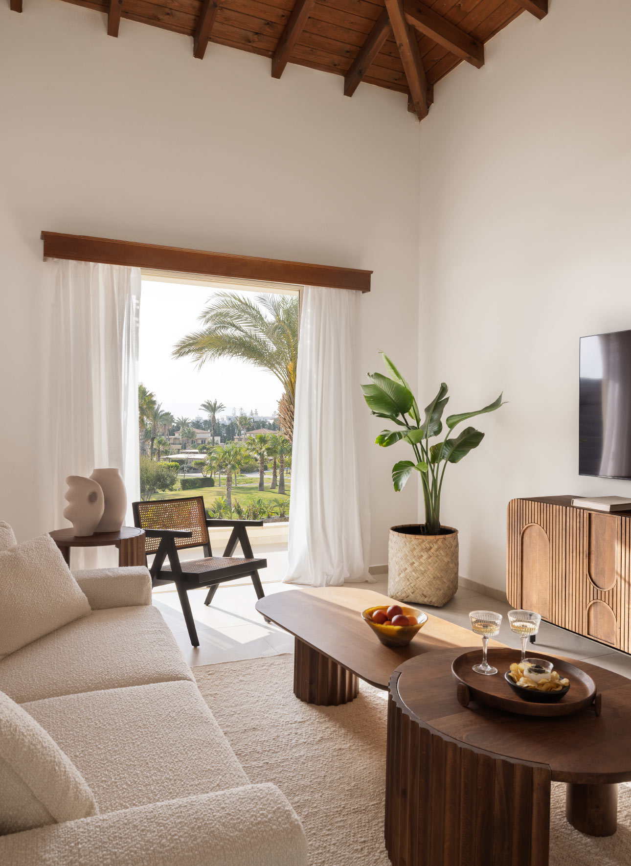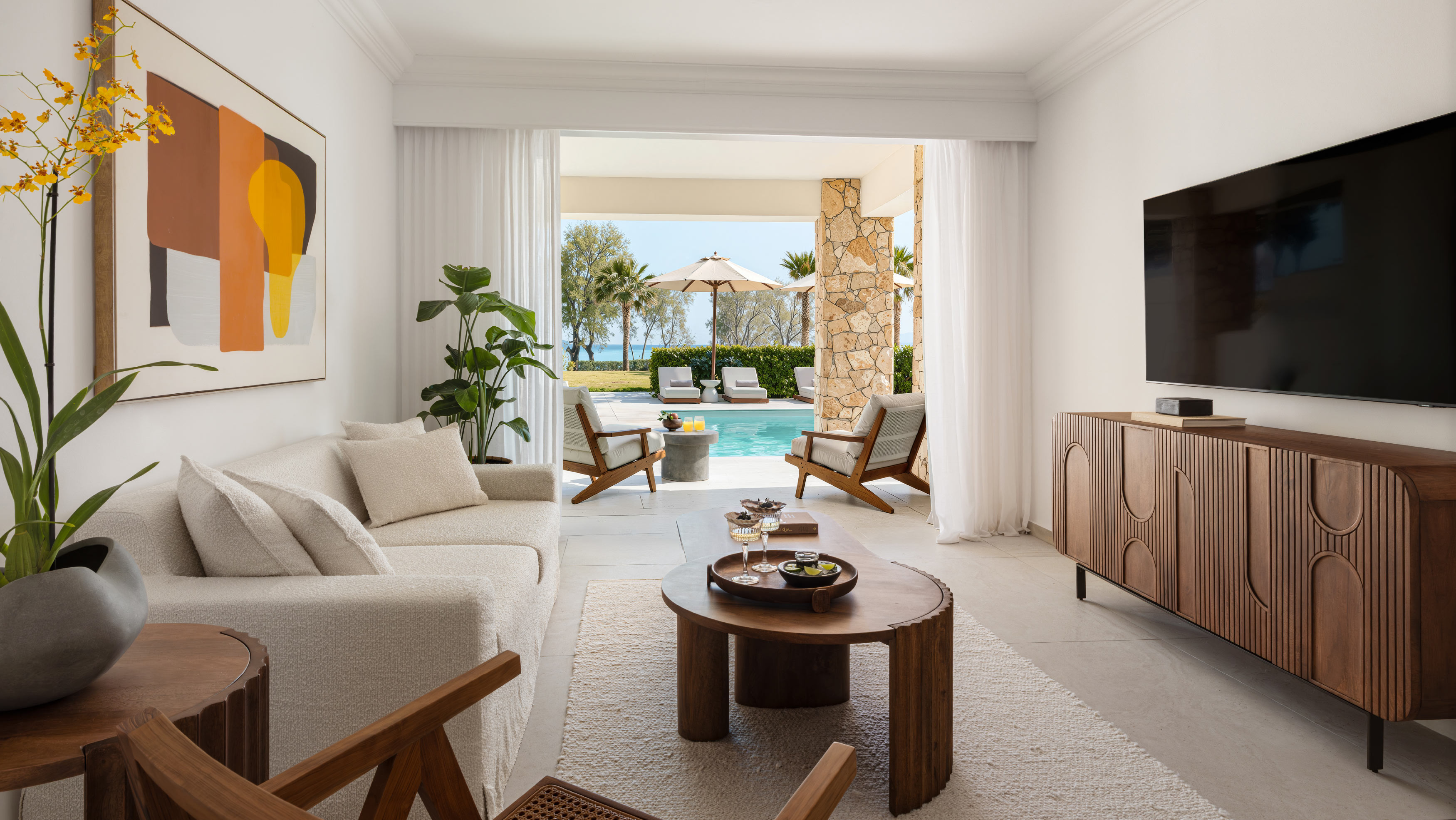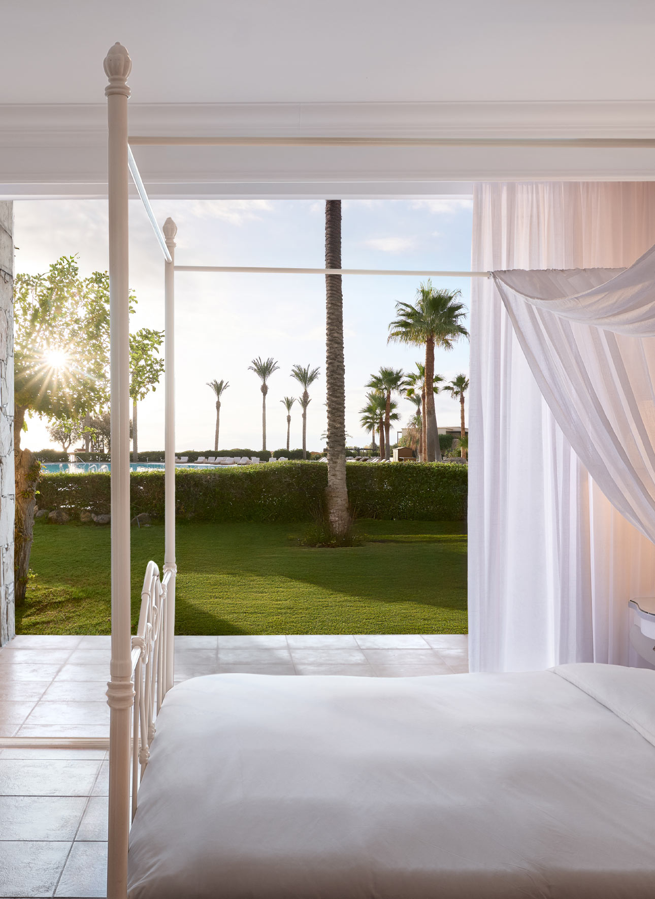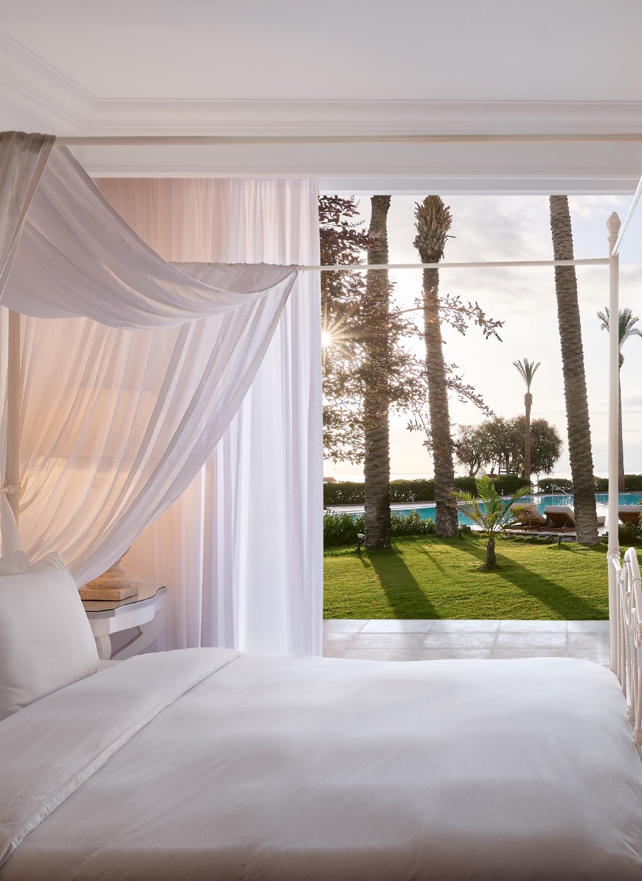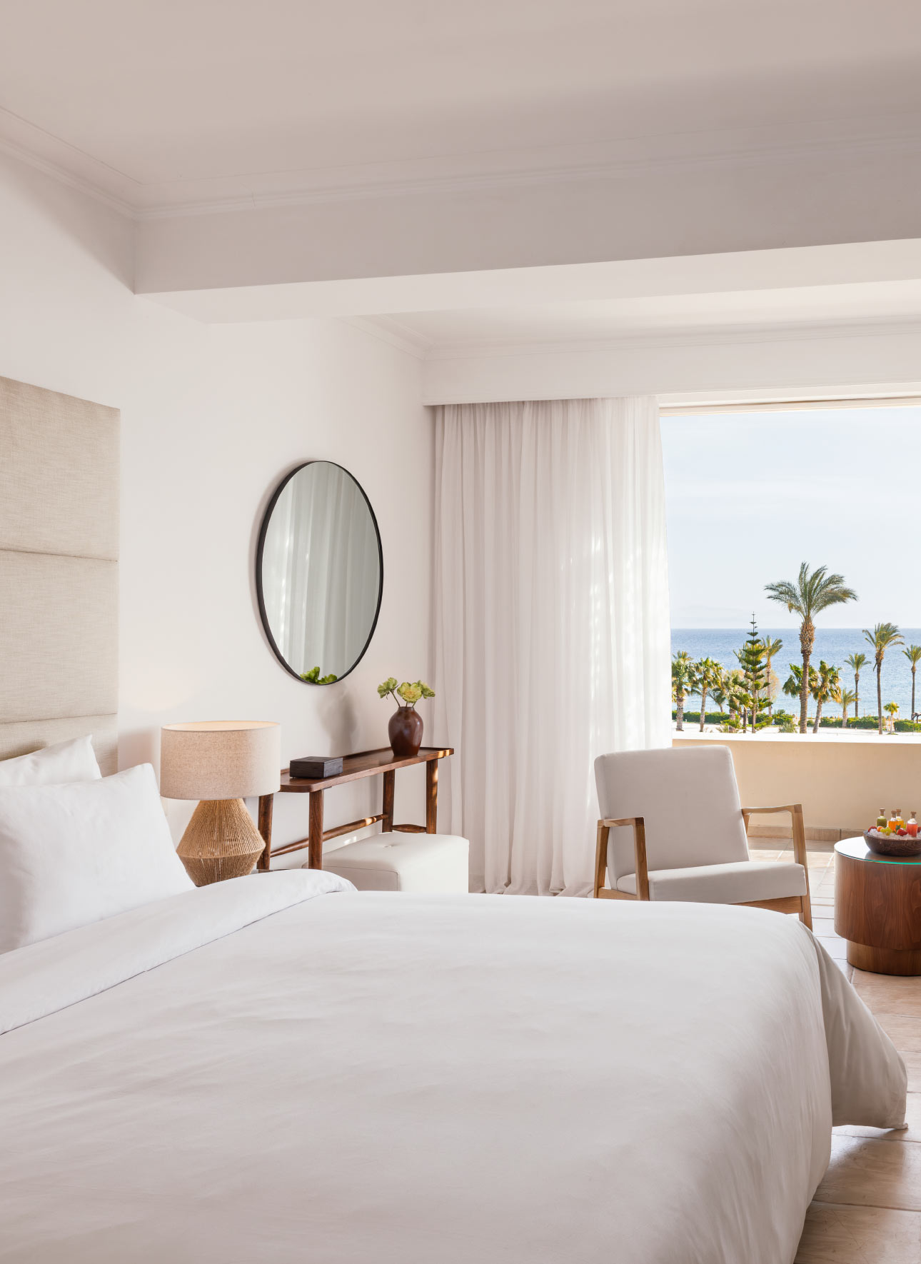 Bright summer hues, airy fabrics, crisp whites, raffia, and bamboo bring a fresh, restyled touch to the elegant guestrooms. Spacious verandas open to sweeping views of the sea and the lush palmerai, offering a serene escape filled with coastal charm.