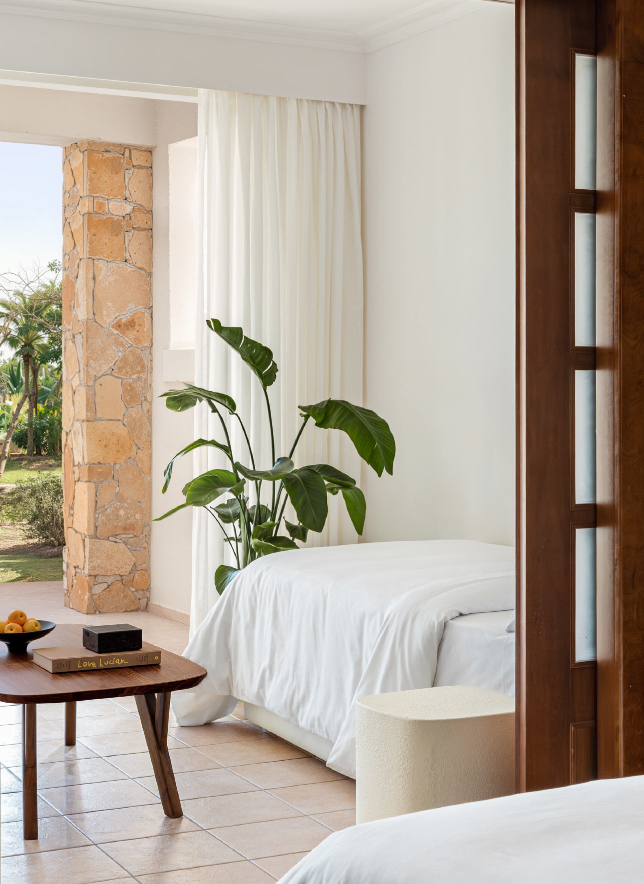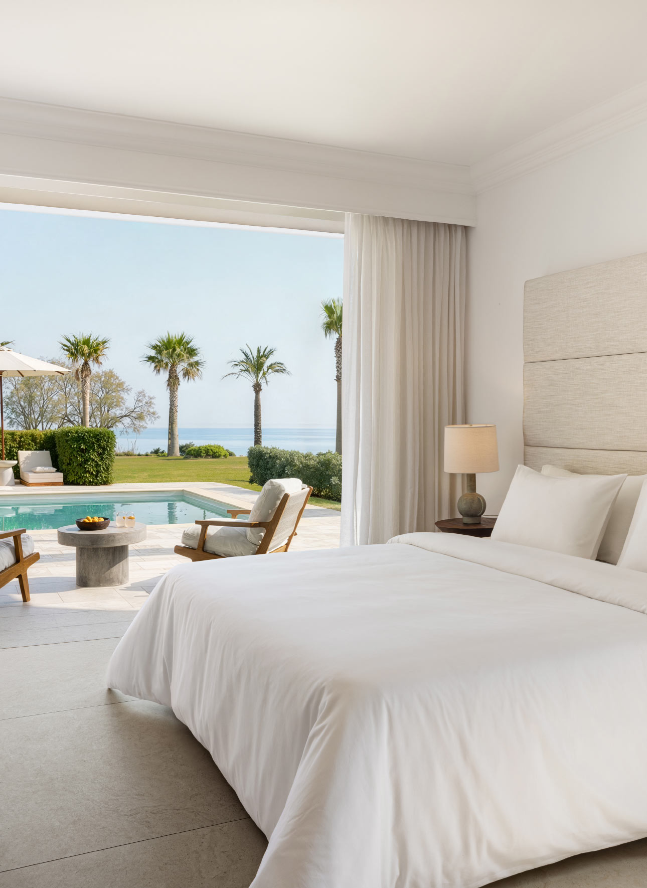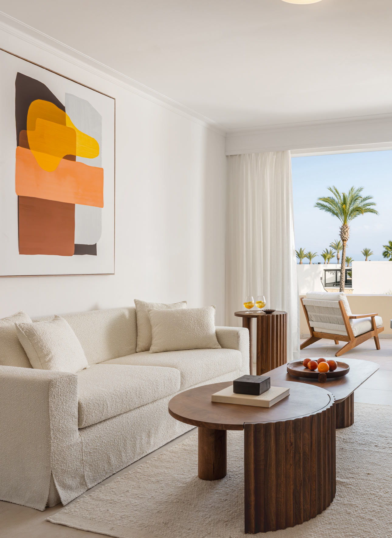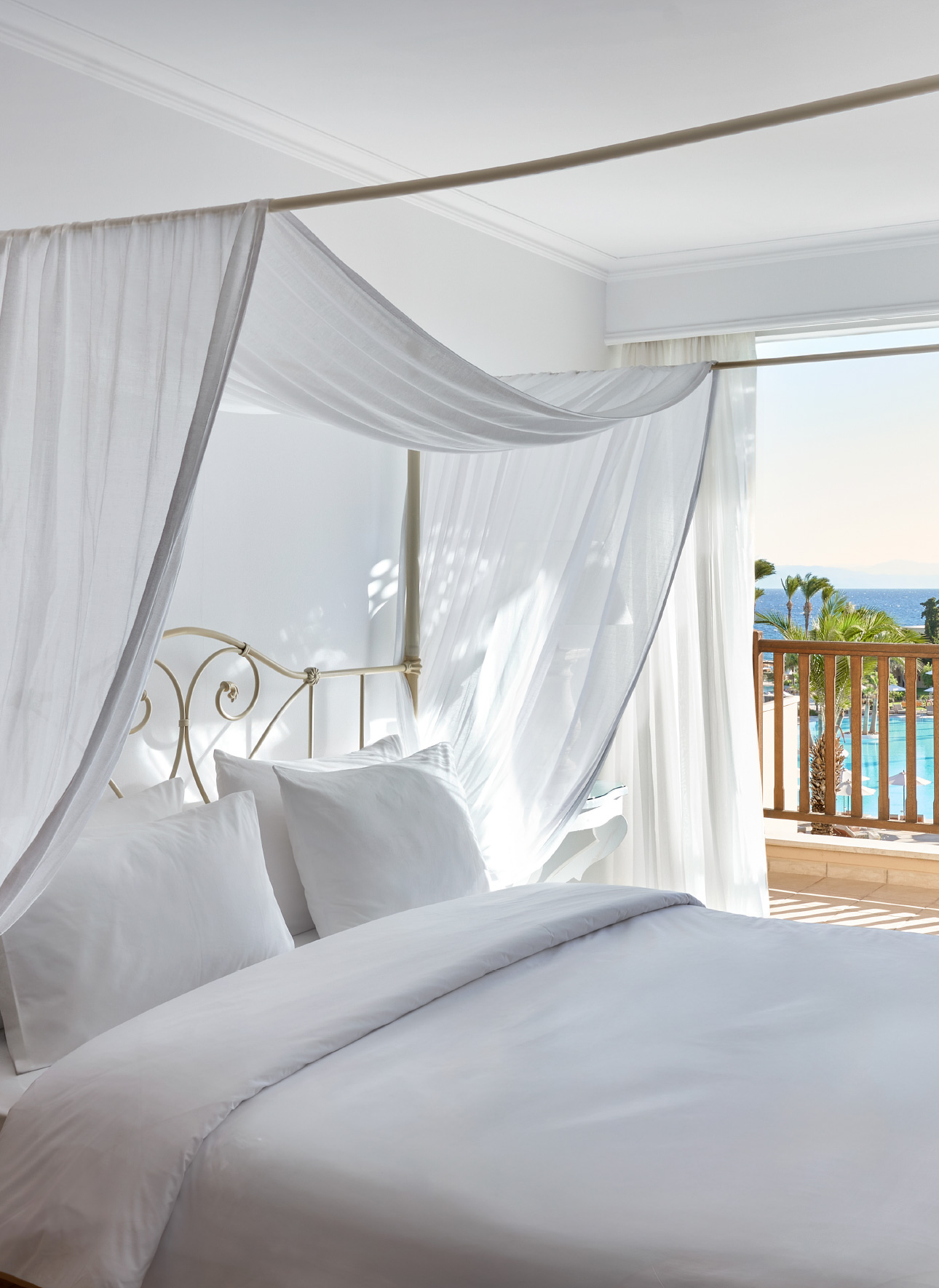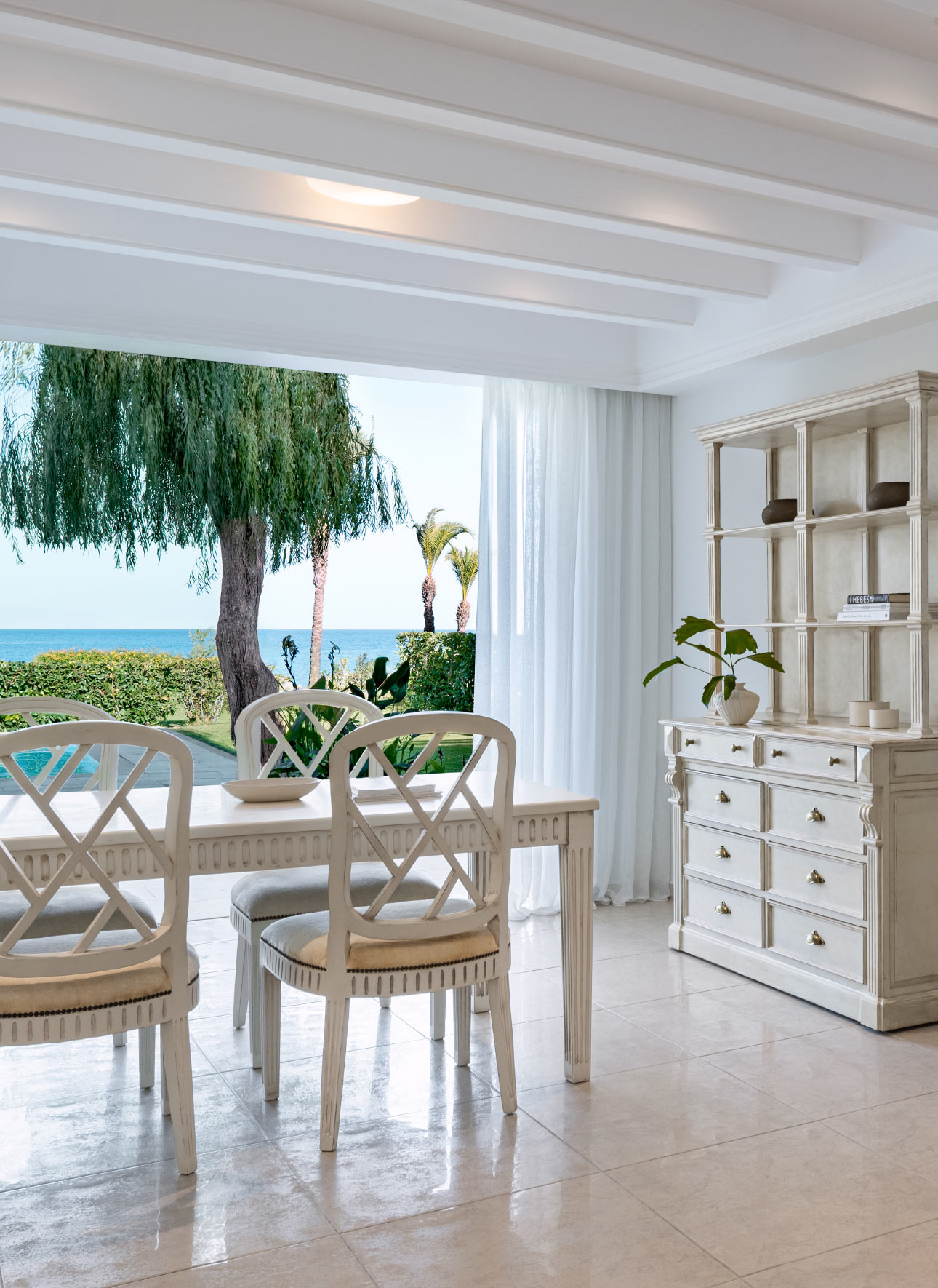 Bright summer hues, airy fabrics, crisp whites, raffia, and bamboo bring a fresh, restyled touch to the elegant guestrooms. Spacious verandas open to sweeping views of the sea and the lush palmerai, offering a serene escape filled with coastal charm.