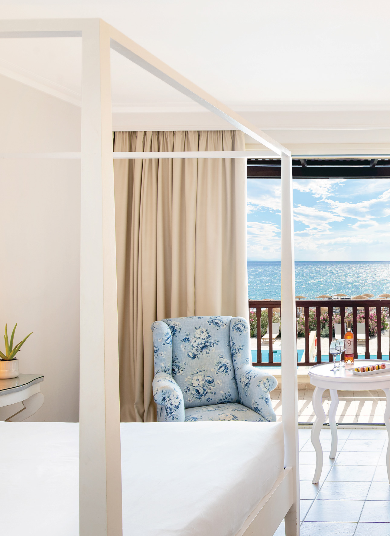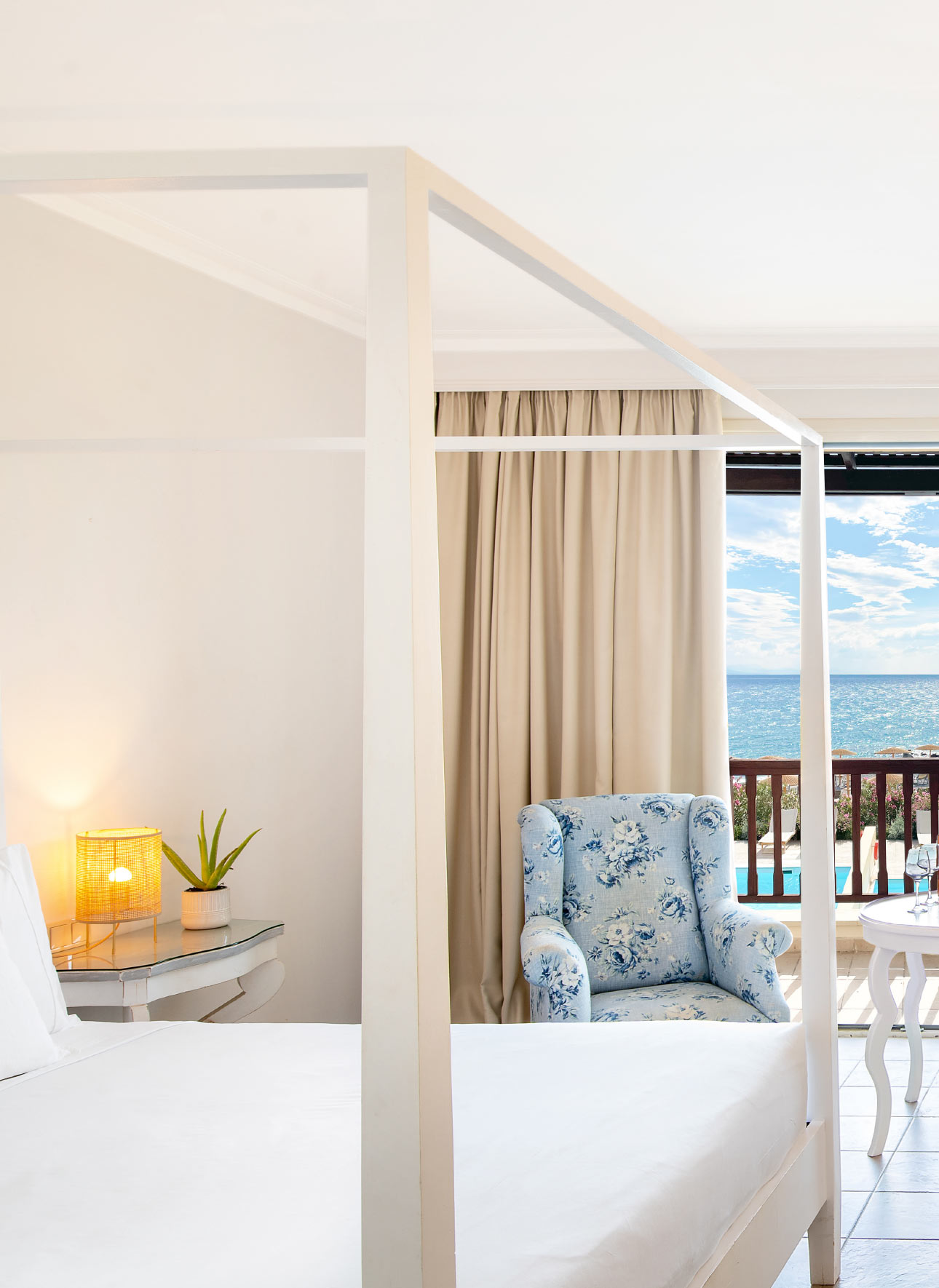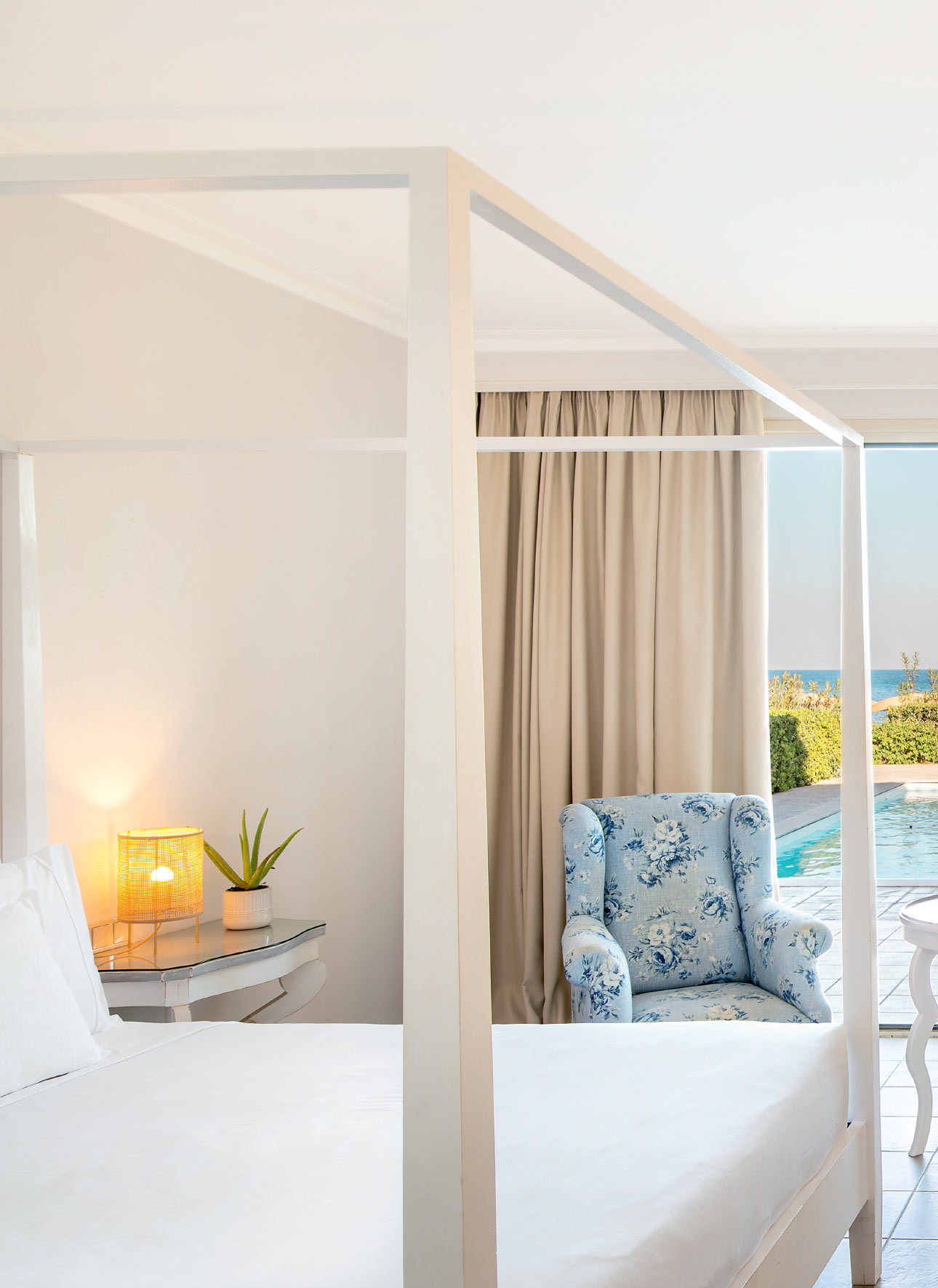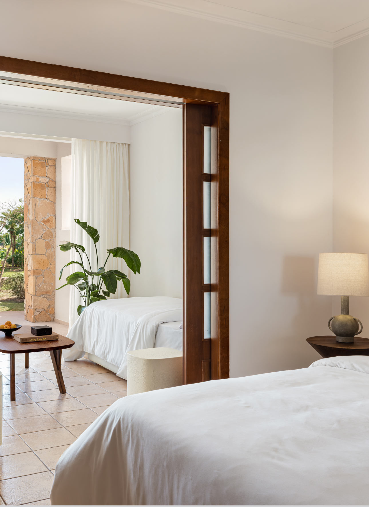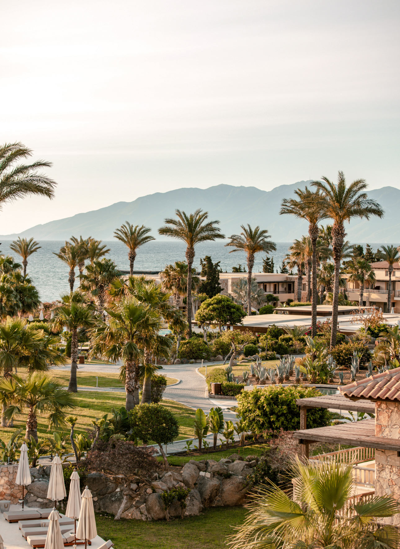 Bright summer hues, airy fabrics, crisp whites, raffia, and bamboo bring a fresh, restyled touch to the elegant guestrooms. Spacious verandas open to sweeping views of the sea and the lush palmerai, offering a serene escape filled with coastal charm.