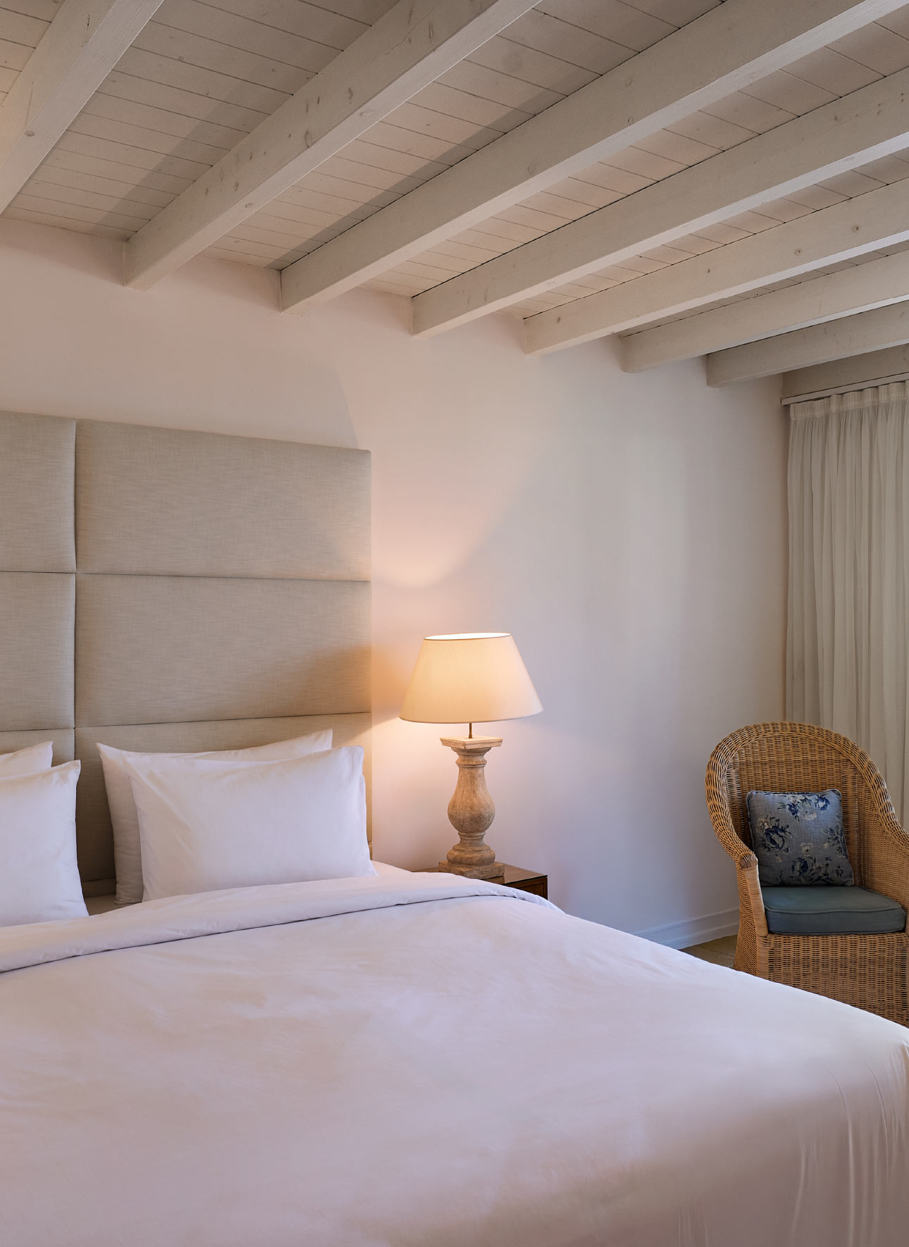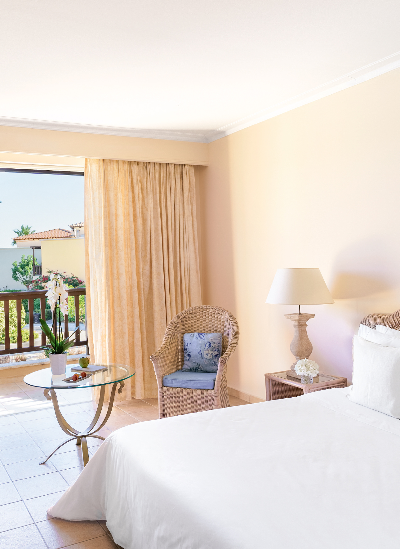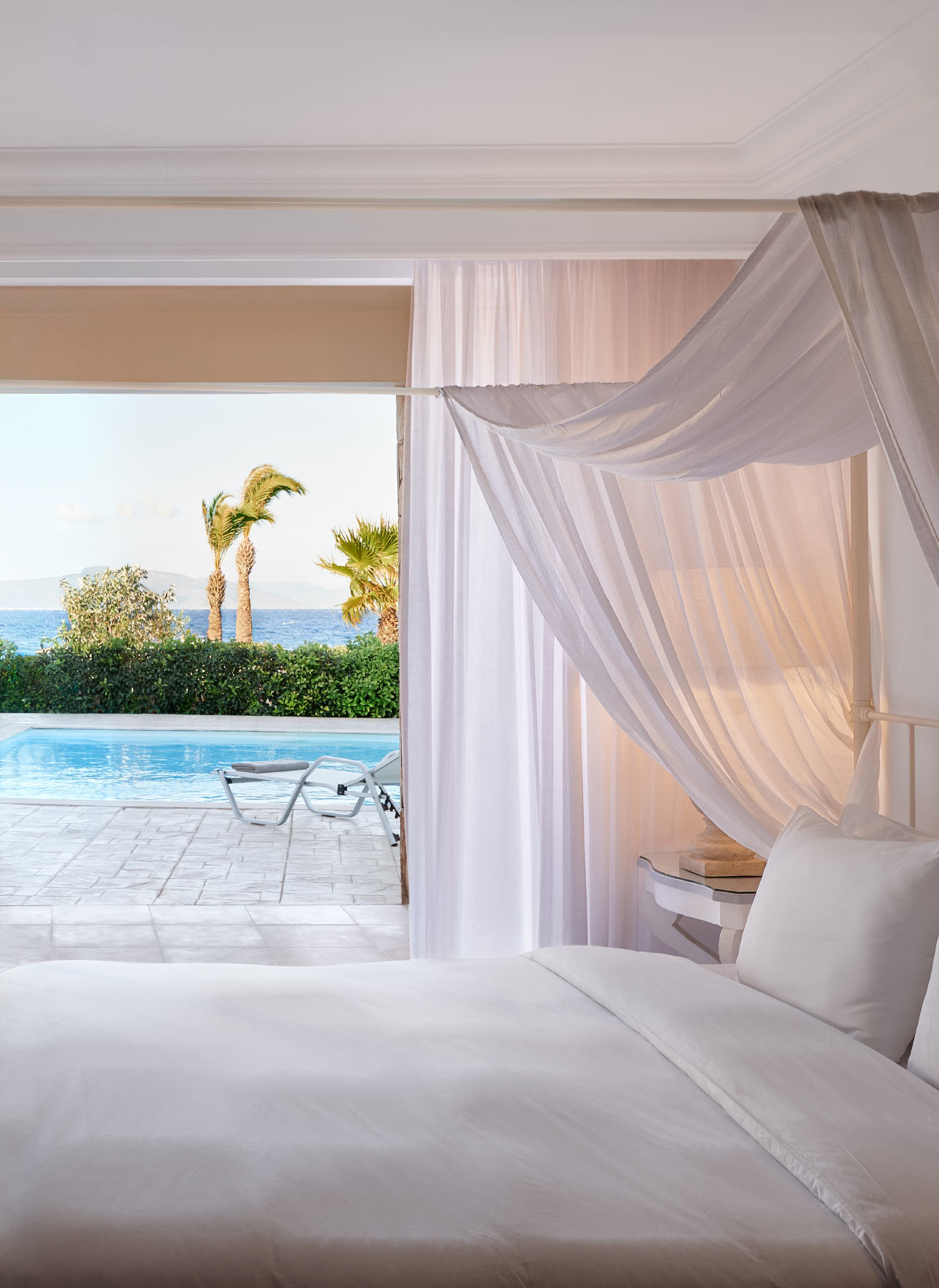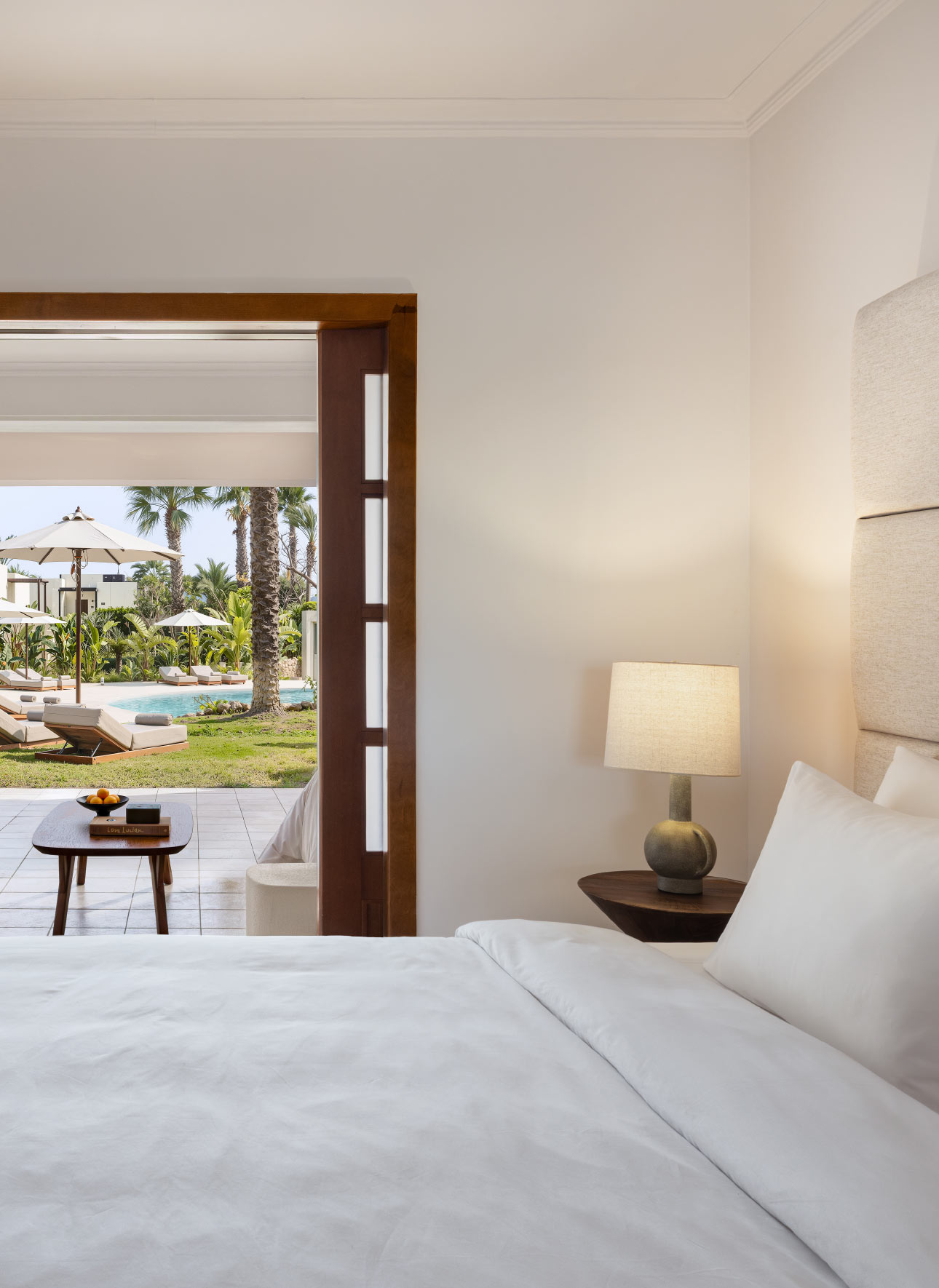 Bright summer hues, airy fabrics, crisp whites, raffia, and bamboo bring a fresh, restyled touch to the elegant guestrooms. Spacious verandas open to sweeping views of the sea and the lush palmerai, offering a serene escape filled with coastal charm.