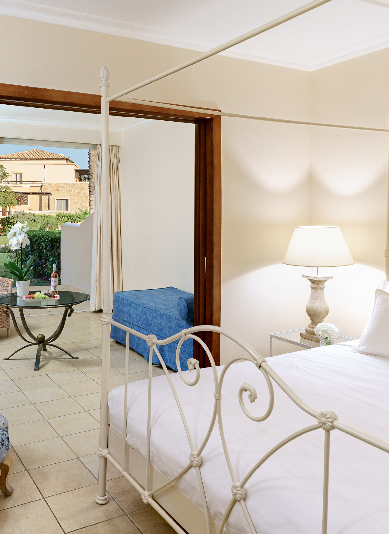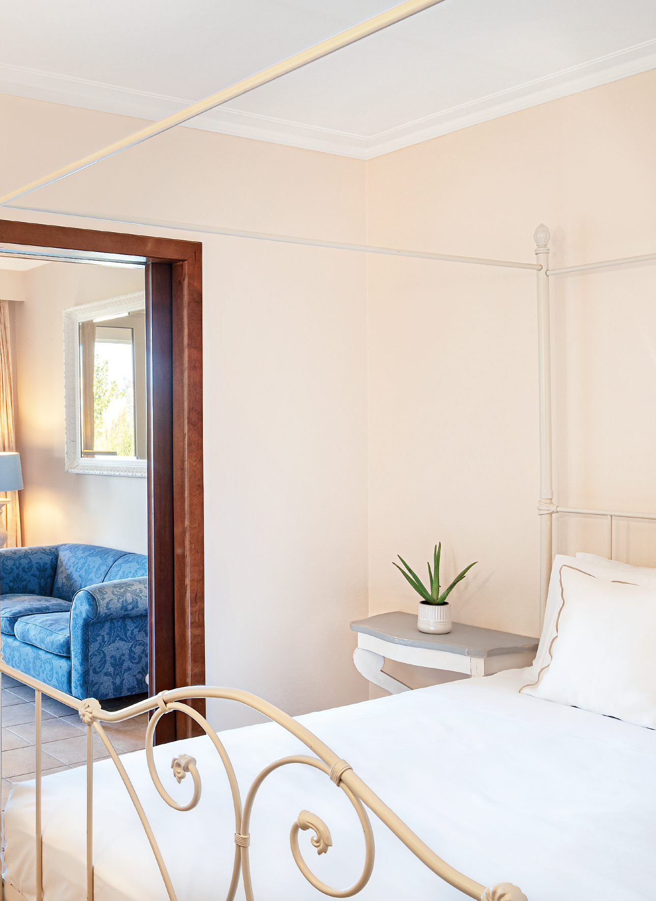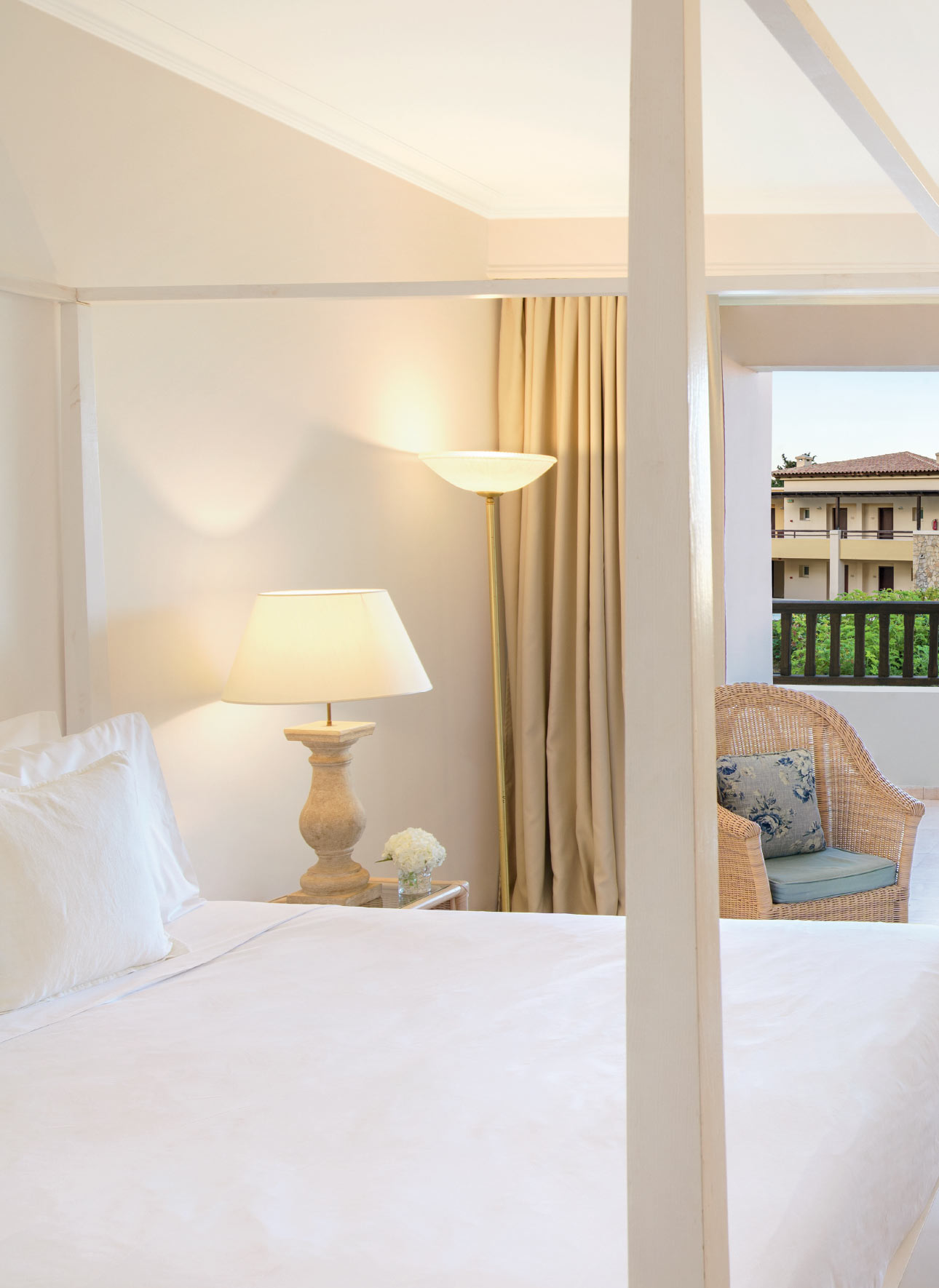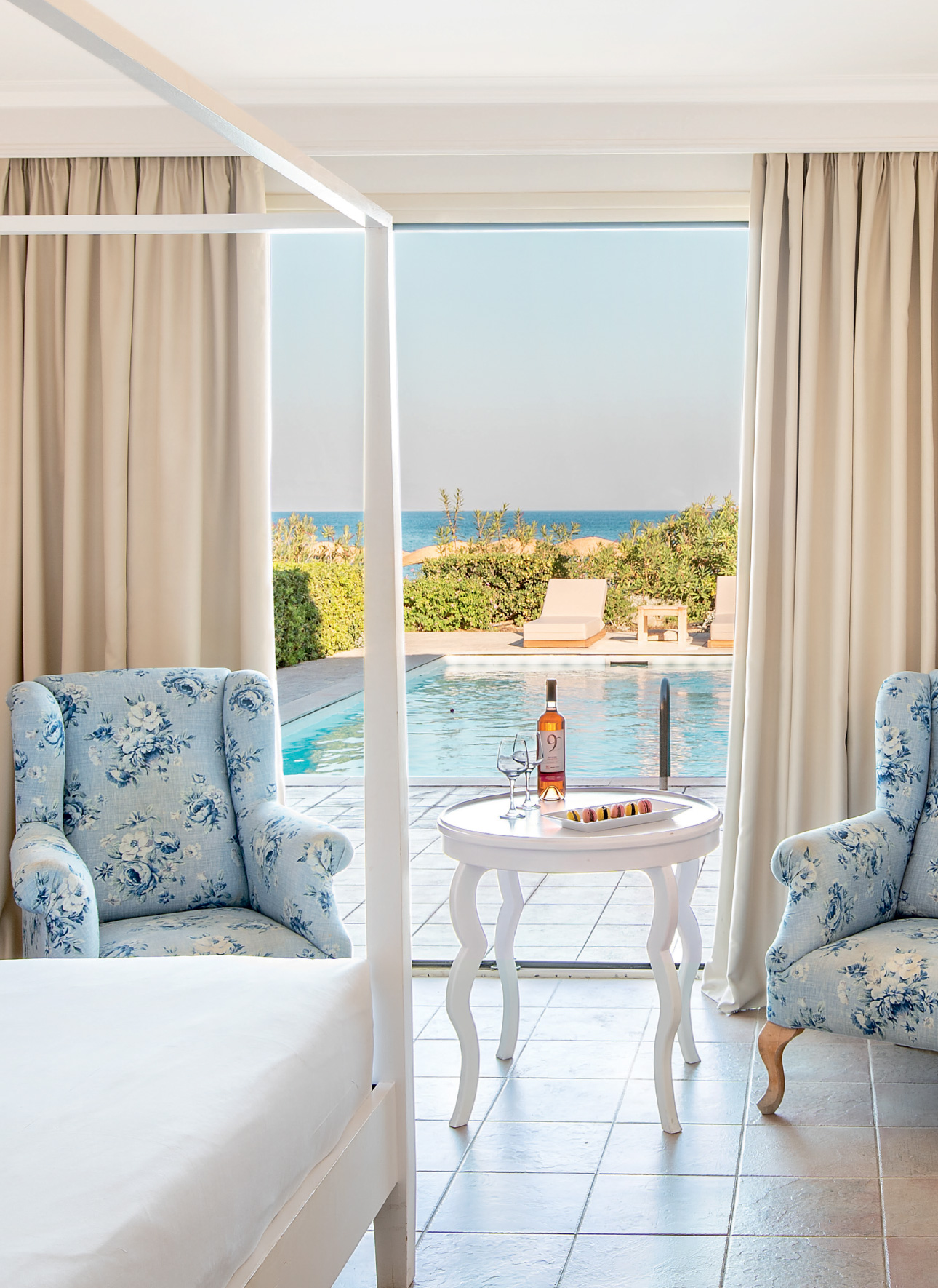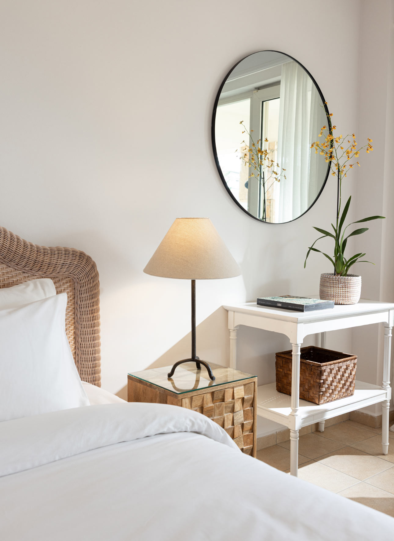 Bright summer hues, airy fabrics, crisp whites, raffia, and bamboo bring a fresh, restyled touch to the elegant guestrooms. Spacious verandas open to sweeping views of the sea and the lush palmerai, offering a serene escape filled with coastal charm.