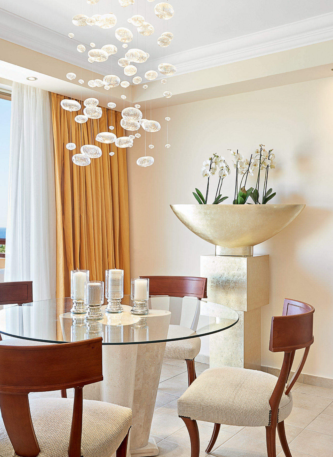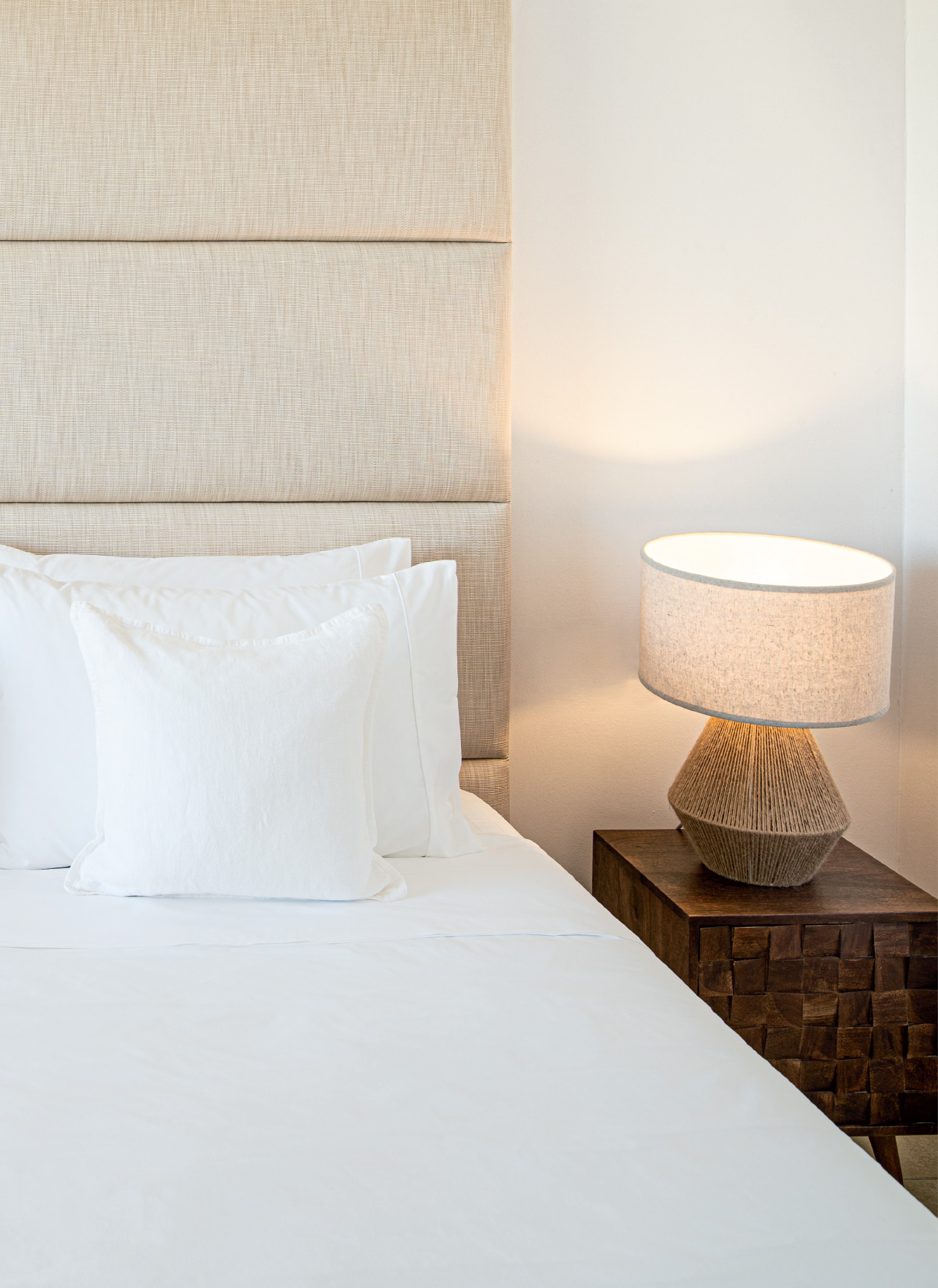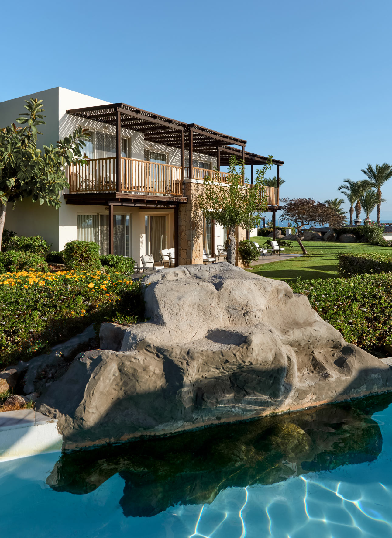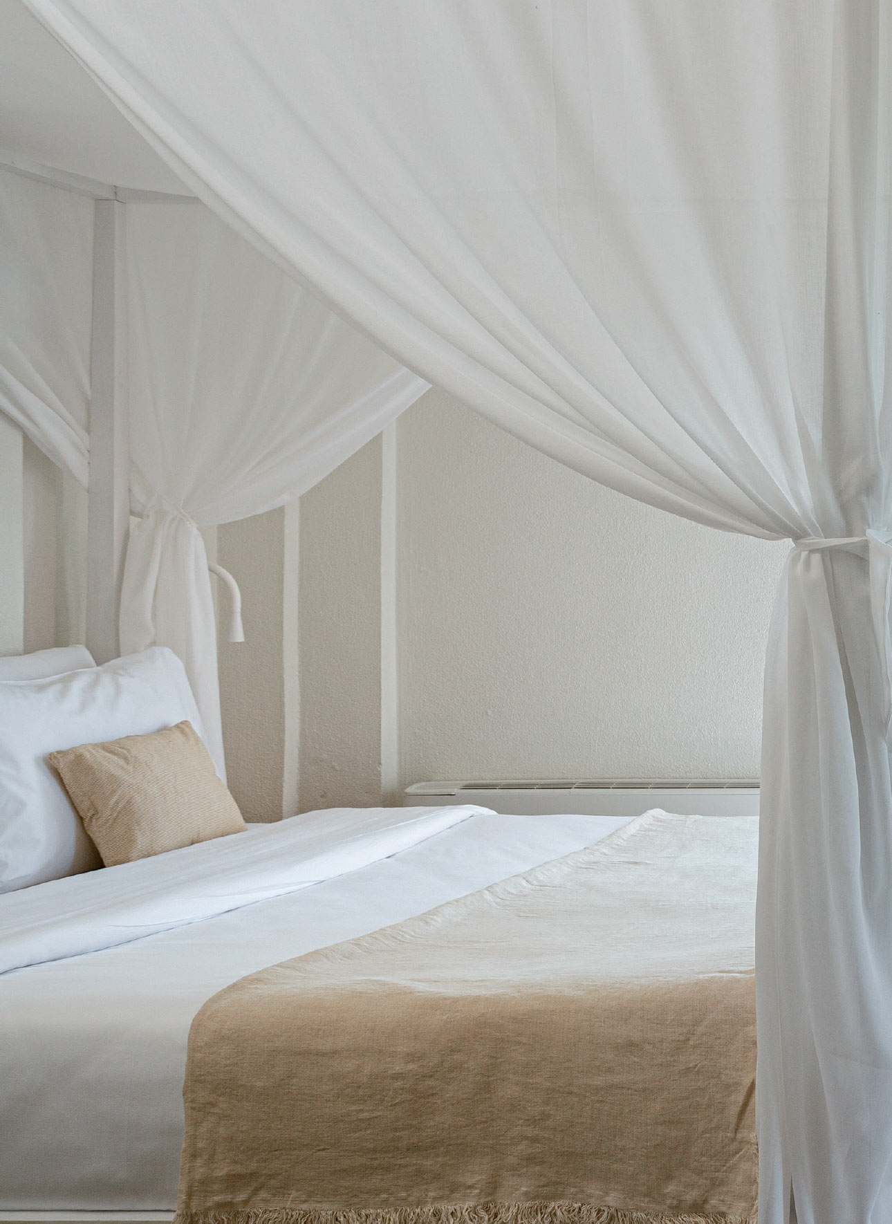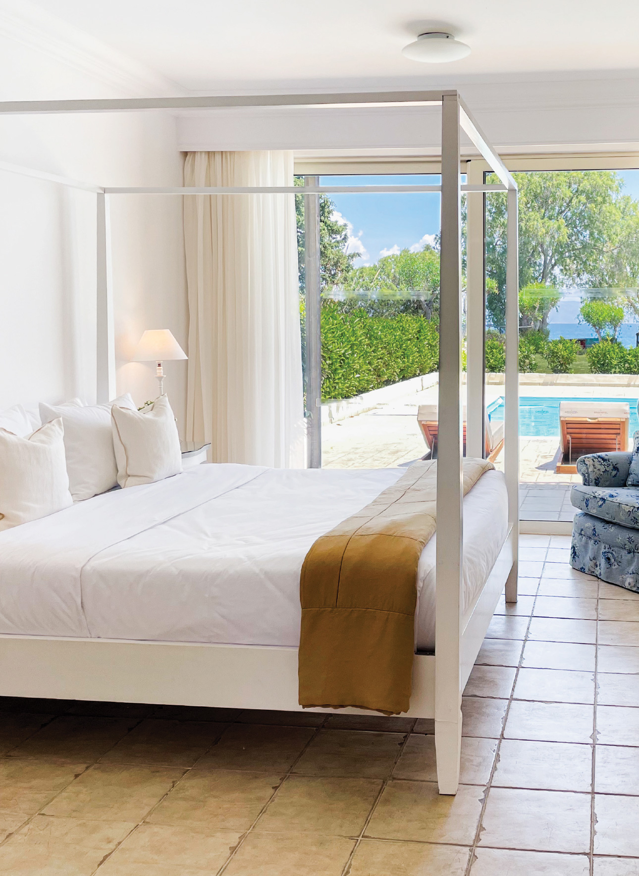 Bright summer hues, airy fabrics, crisp whites, raffia, and bamboo bring a fresh, restyled touch to the elegant guestrooms. Spacious verandas open to sweeping views of the sea and the lush palmerai, offering a serene escape filled with coastal charm.