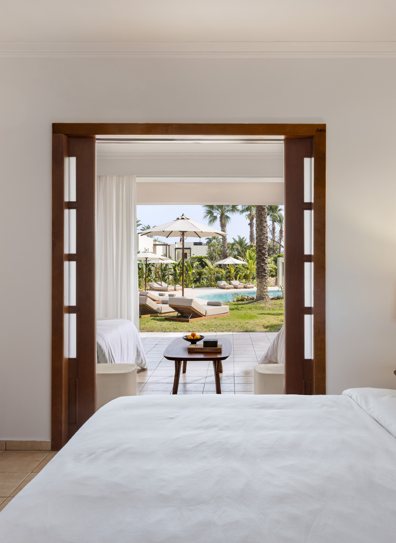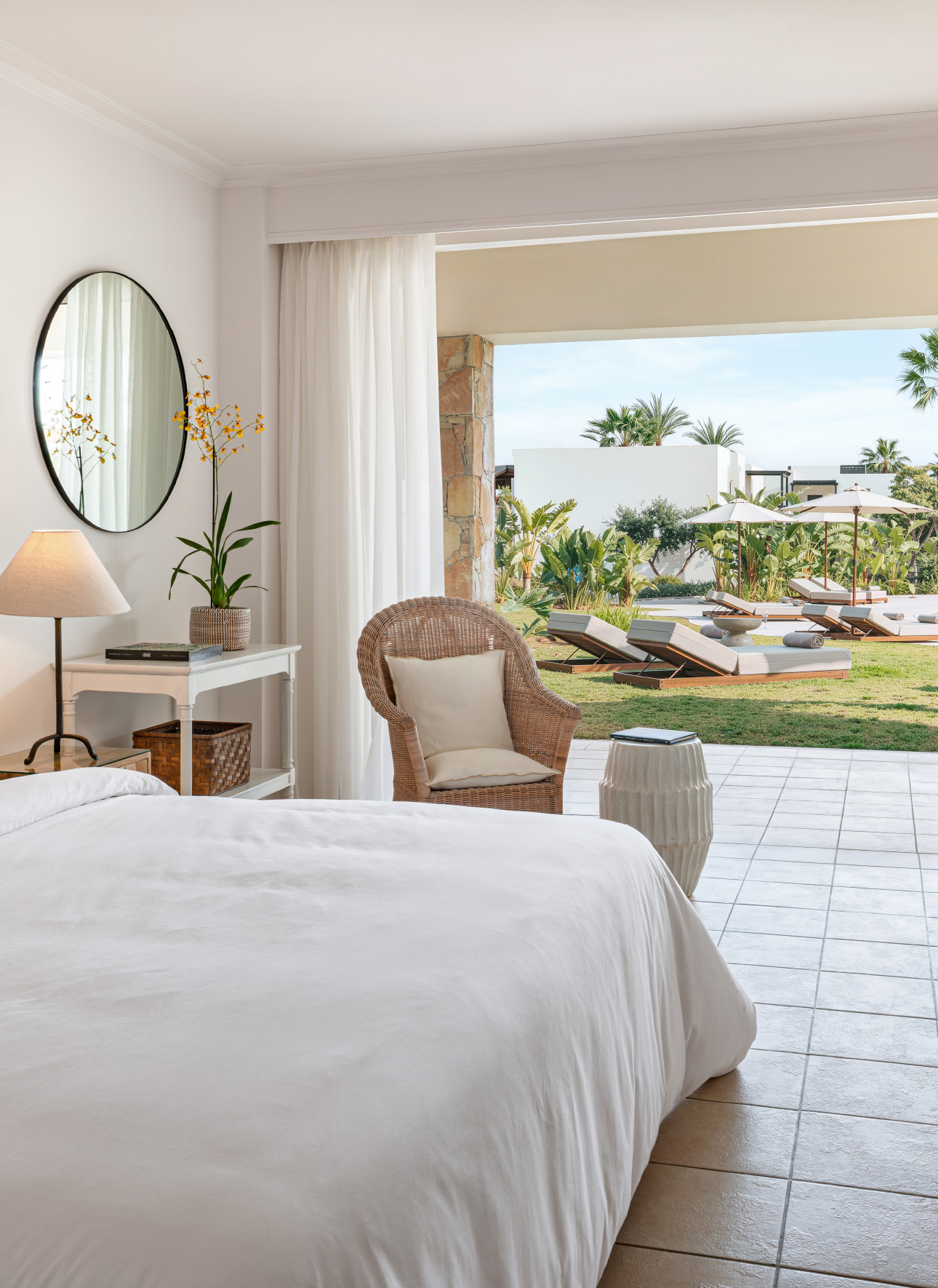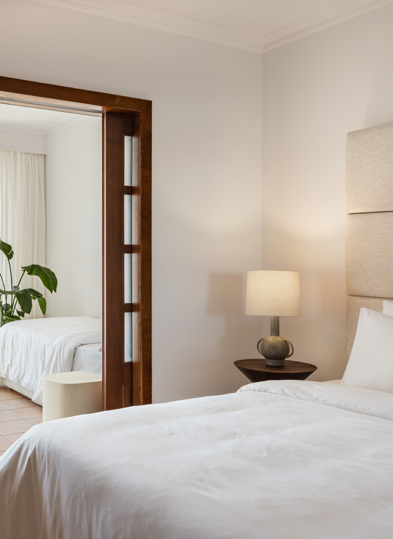 Standout among the collection are the entirely redesigned luxury family suites where sculptural furniture, soft fabrics and travertine-clad bathrooms with freestanding bathtubs bring a cool island aesthetic to life.
