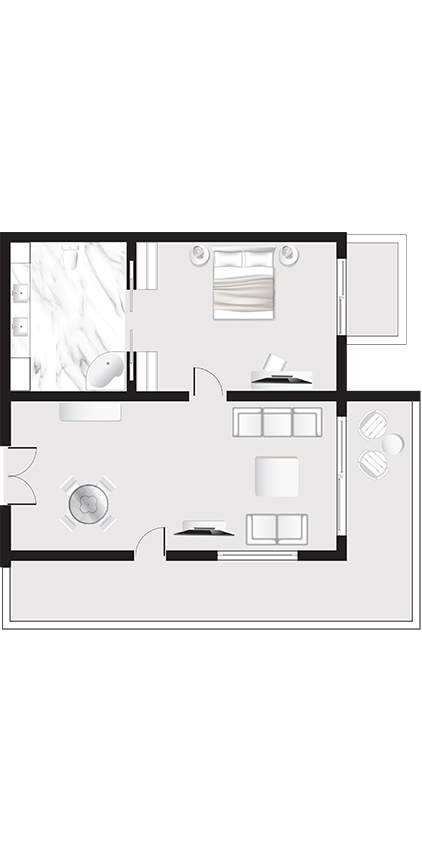 Located on the top floor, this suite combines sophisticated interiors with a spacious veranda offering panoramic sea views.