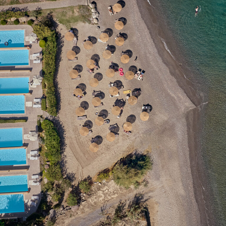 Enjoy sweeping views of the Aegean Sea from this airy Beachfront Bungalow. The outdoor terrace is adorned with a large private swimming pool, setting the tone for luxury holidays.