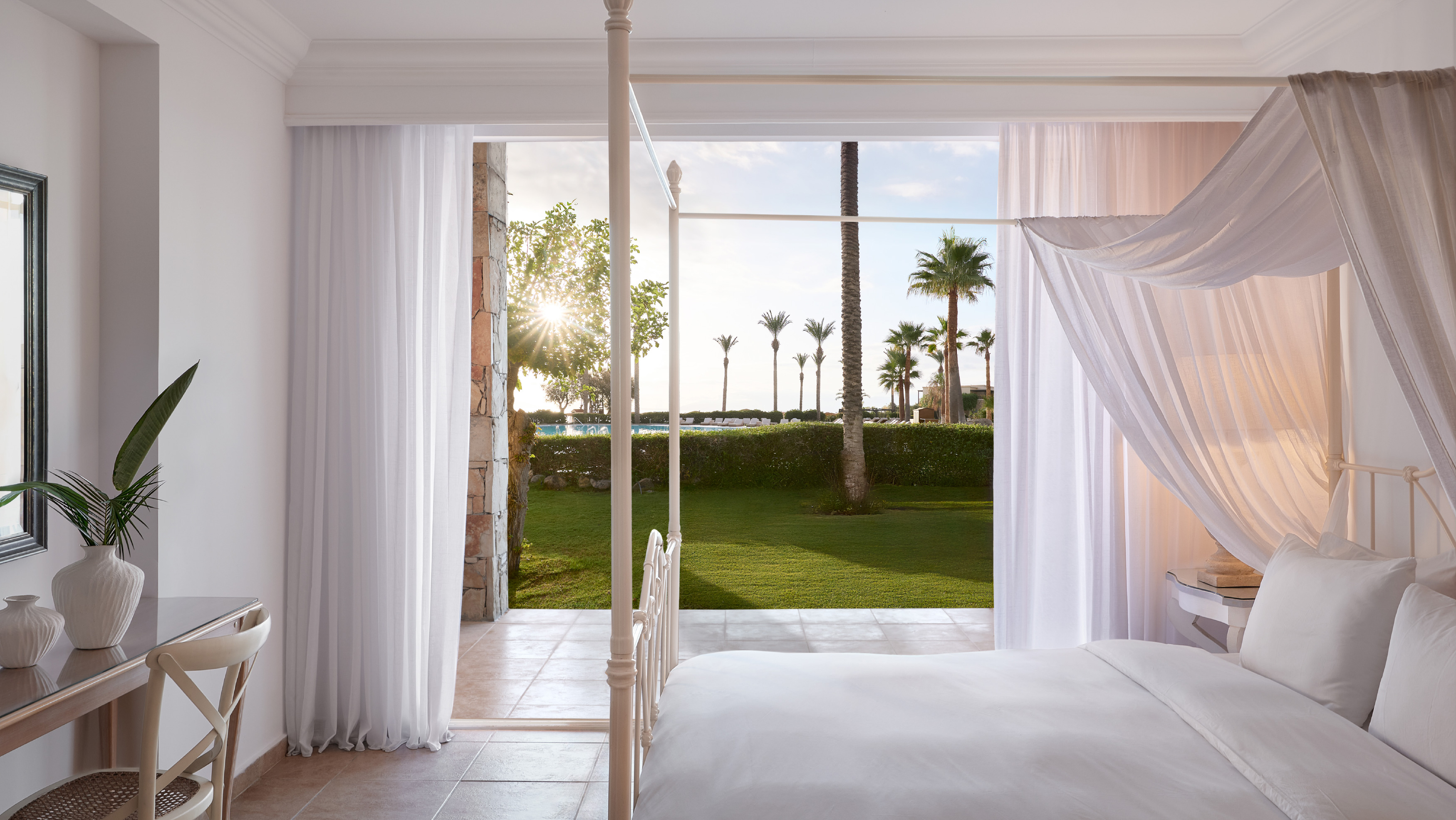 A romantic atmosphere welcomes you in these elegant villas filled with sunlight. Located in the private gardens by the beach, they conveniently enjoy a direct access to the resort’s pools.