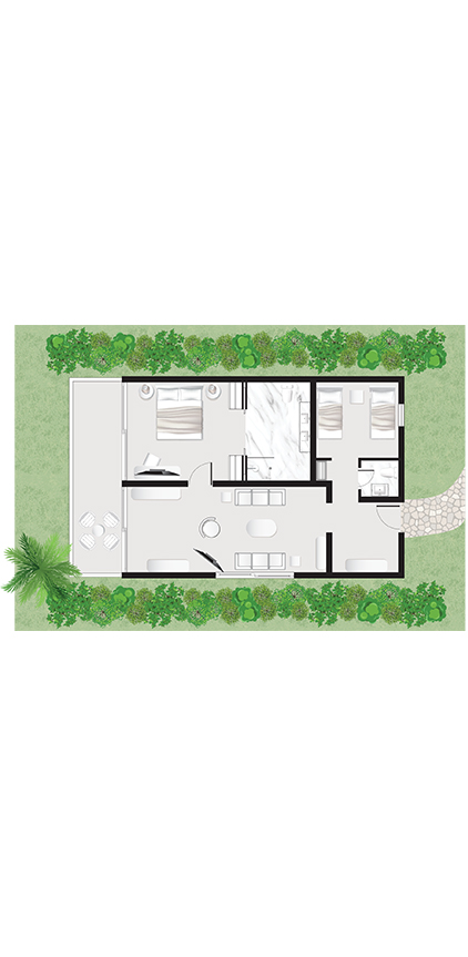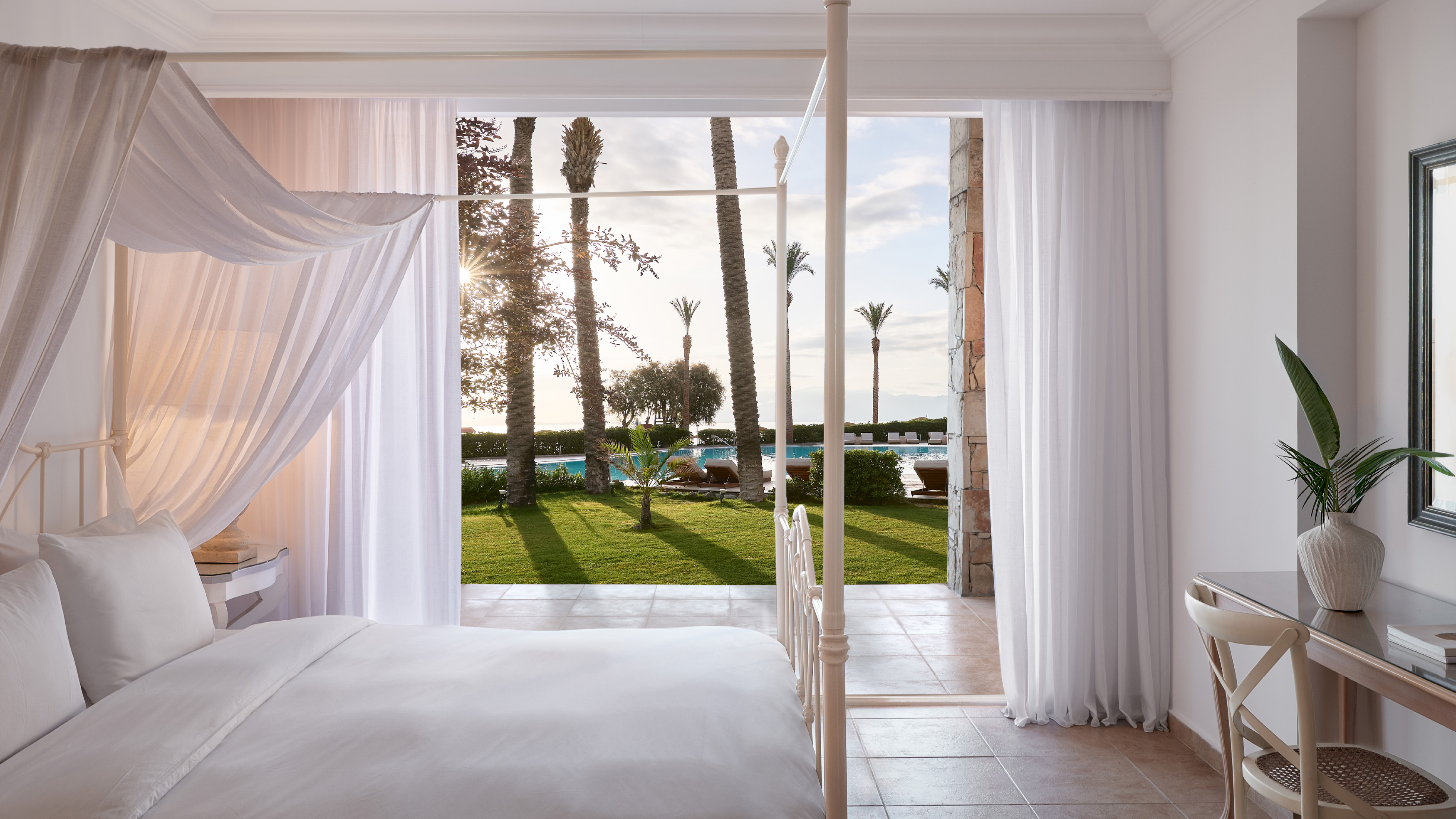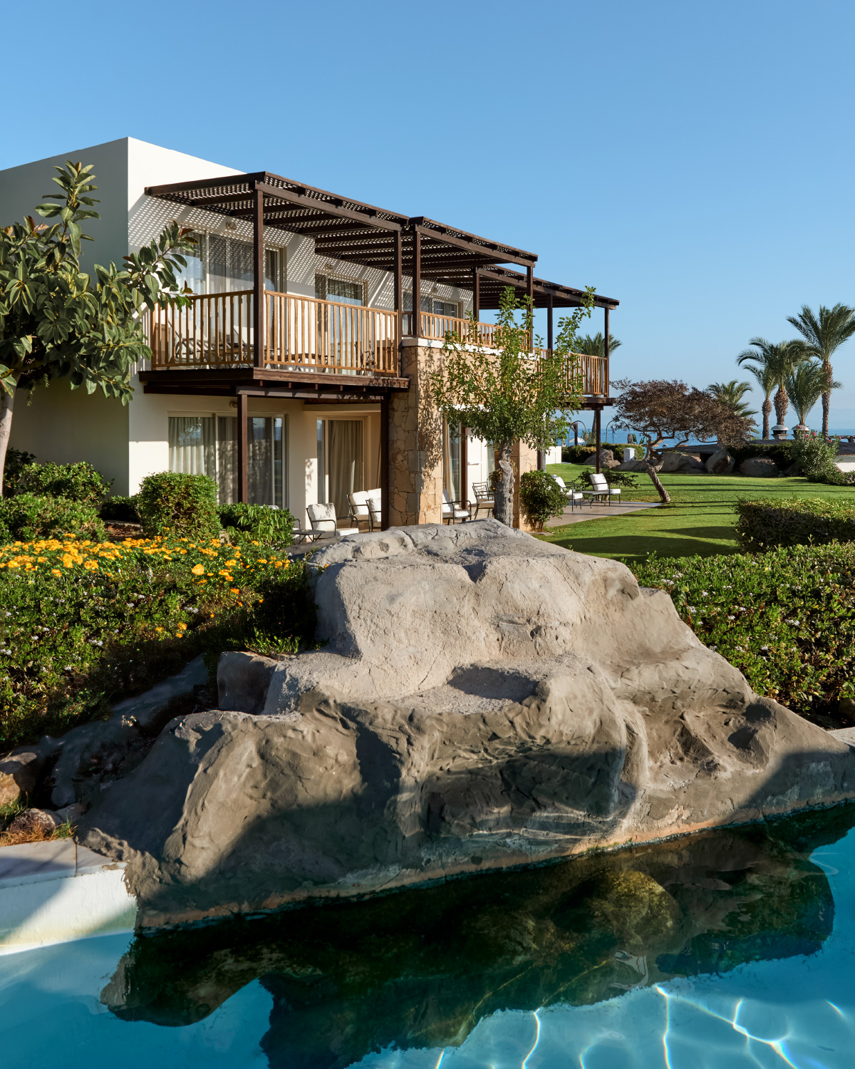 Elegant villa in secluded beachfront gardens, with direct pool access and views of the sea, ideal for families or paired travelers.