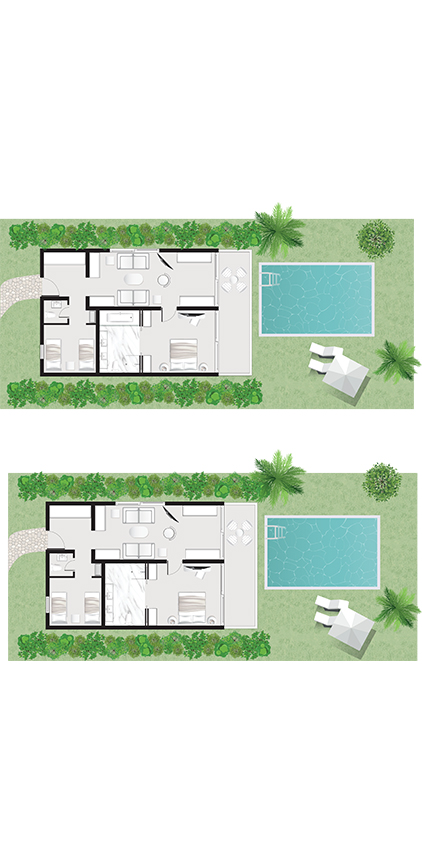 Sublime villa accommodation, equipped with private access to its own swimming pool, combines modern comforts with appealingly luxurious touches and aesthetics. The interiors feature generous living space with two separate sleeping quarters and a spacious lounge area.