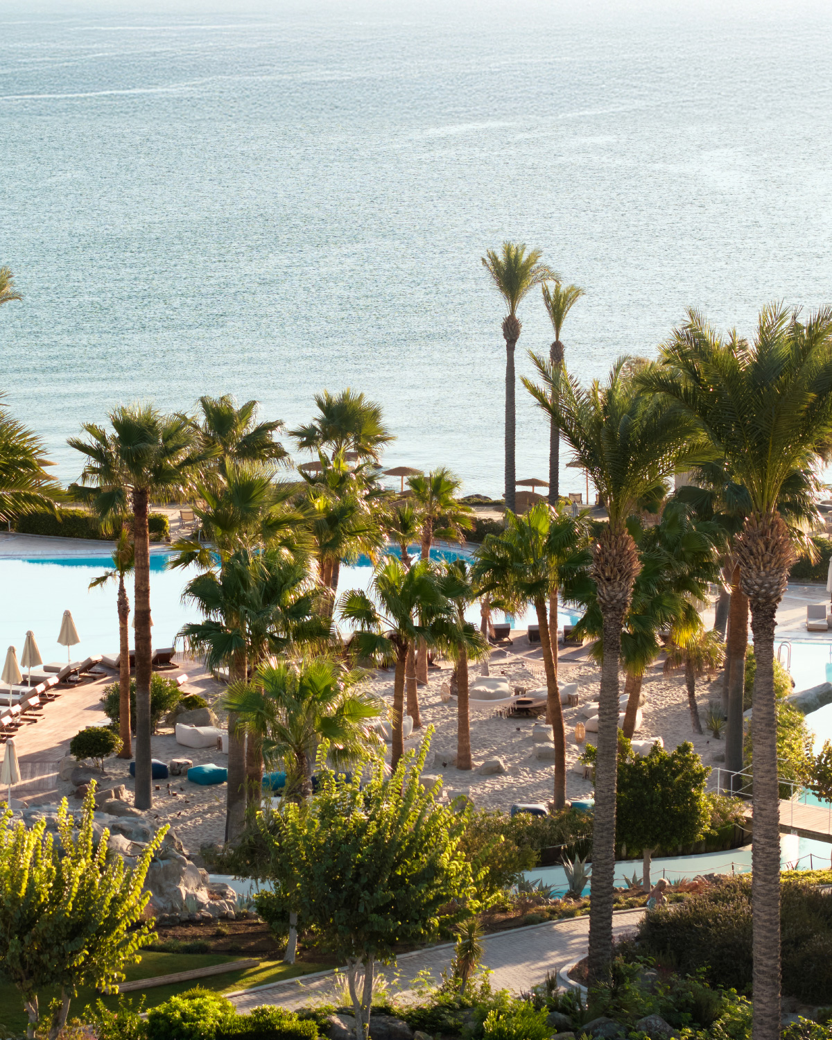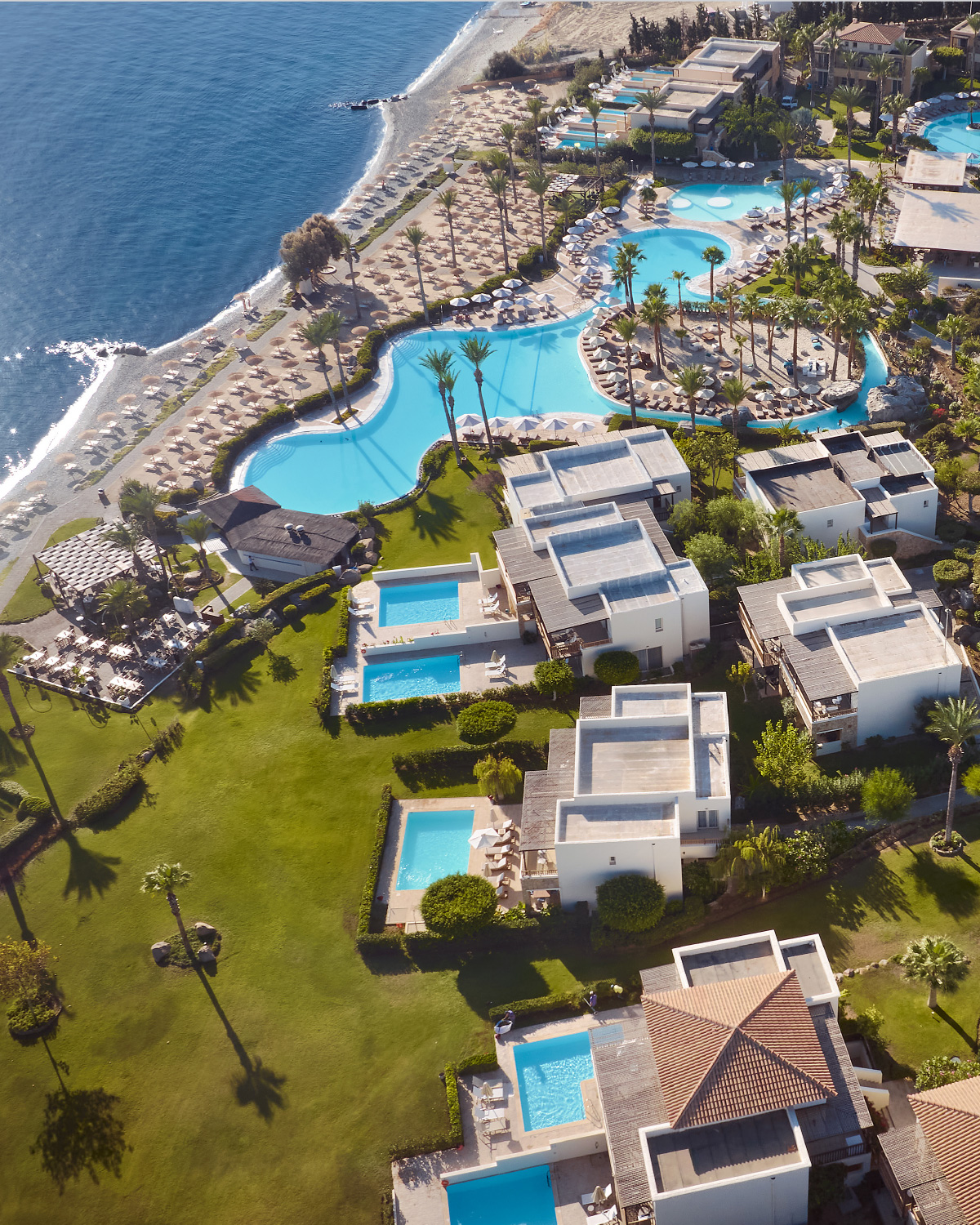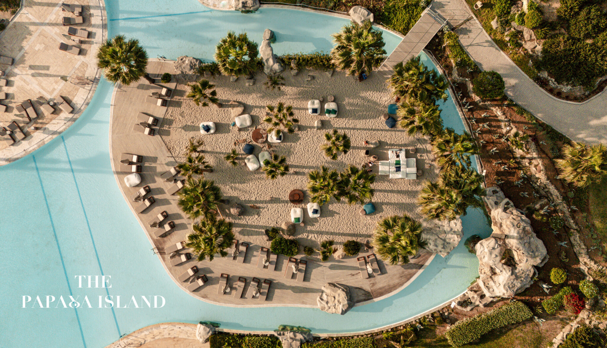 Six pools. A sandy island. A lazy river winding through papaya trees. And beyond it all, the Aegean in its clearest, most inviting blue.