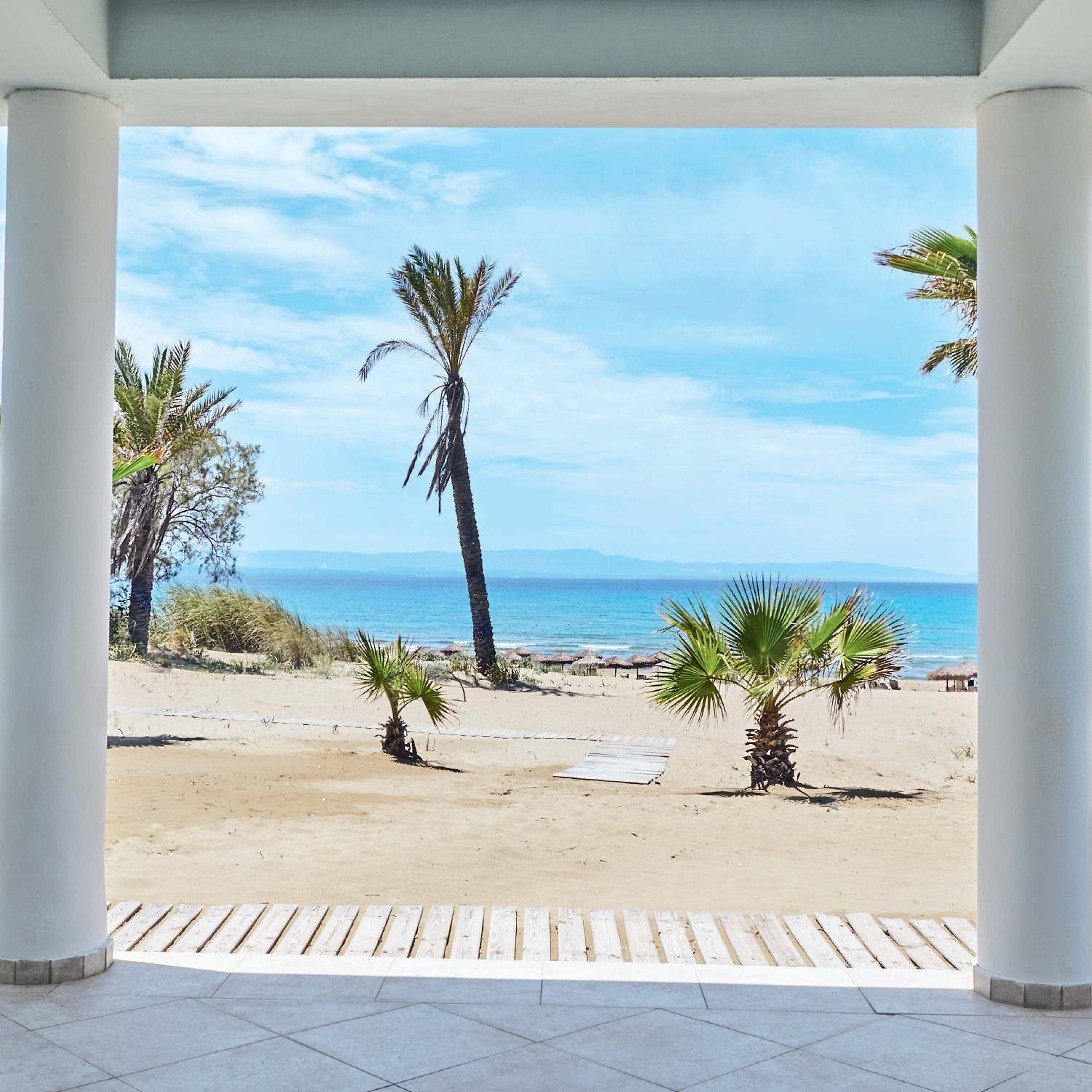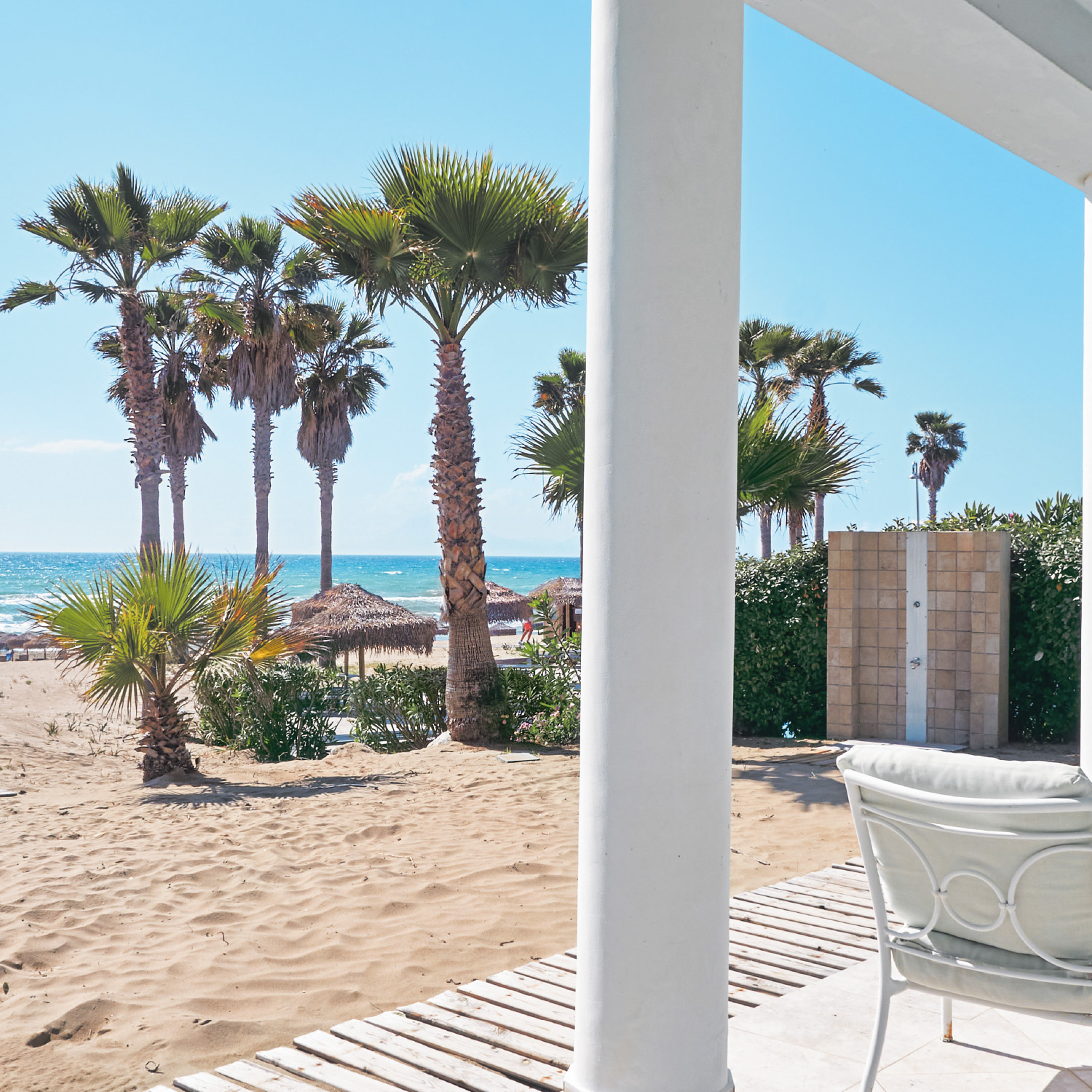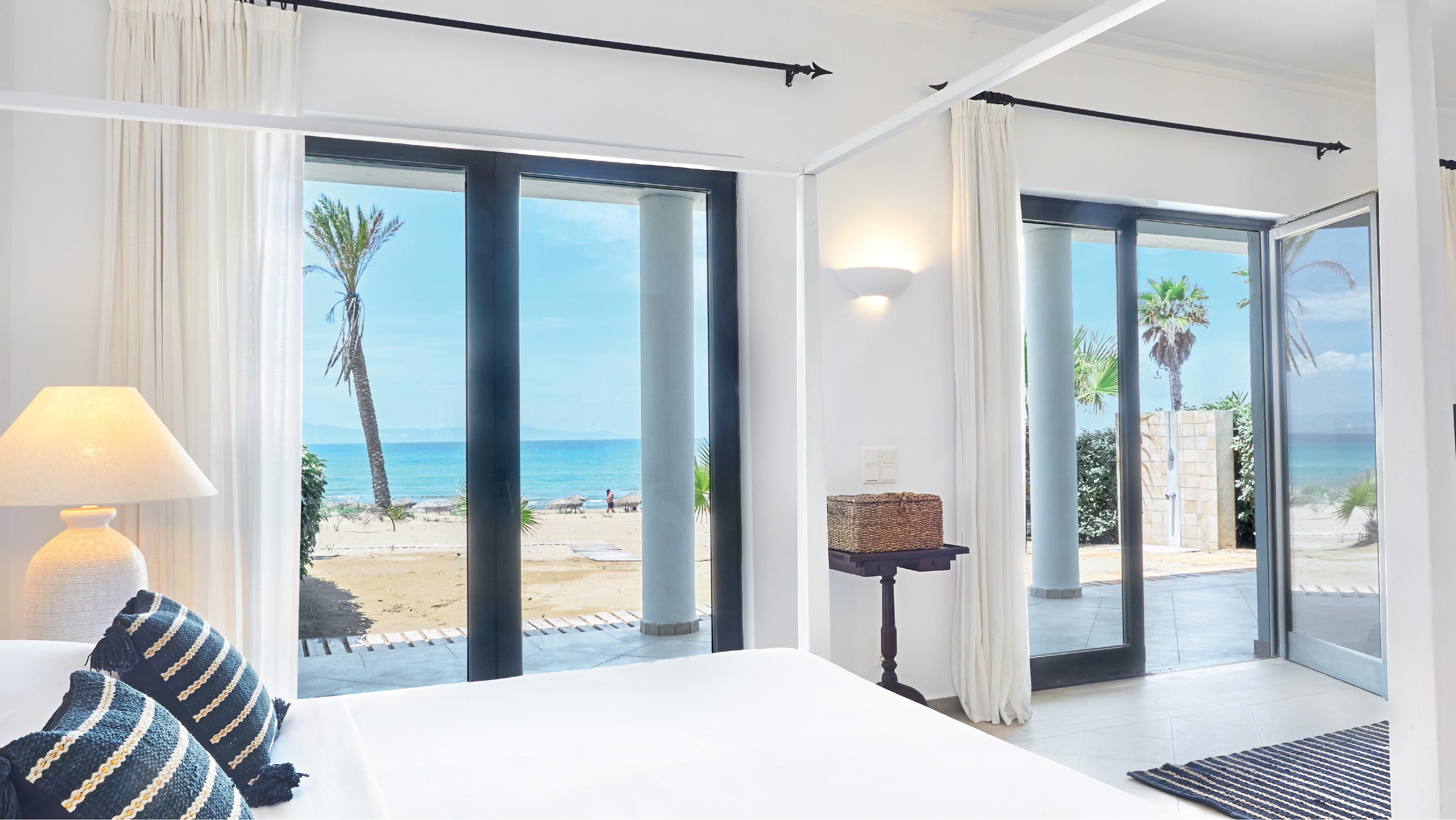Perched on the golden sandy beach and inspired by the ancient Olympian architecture, beachfront accommodations feature two sleeping quarters with en suite bathrooms.