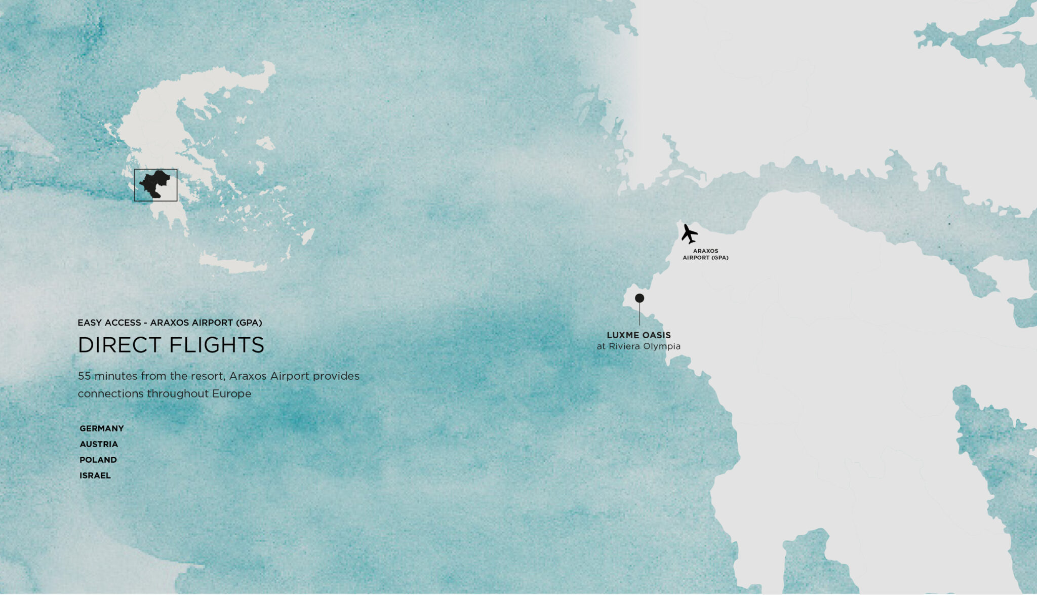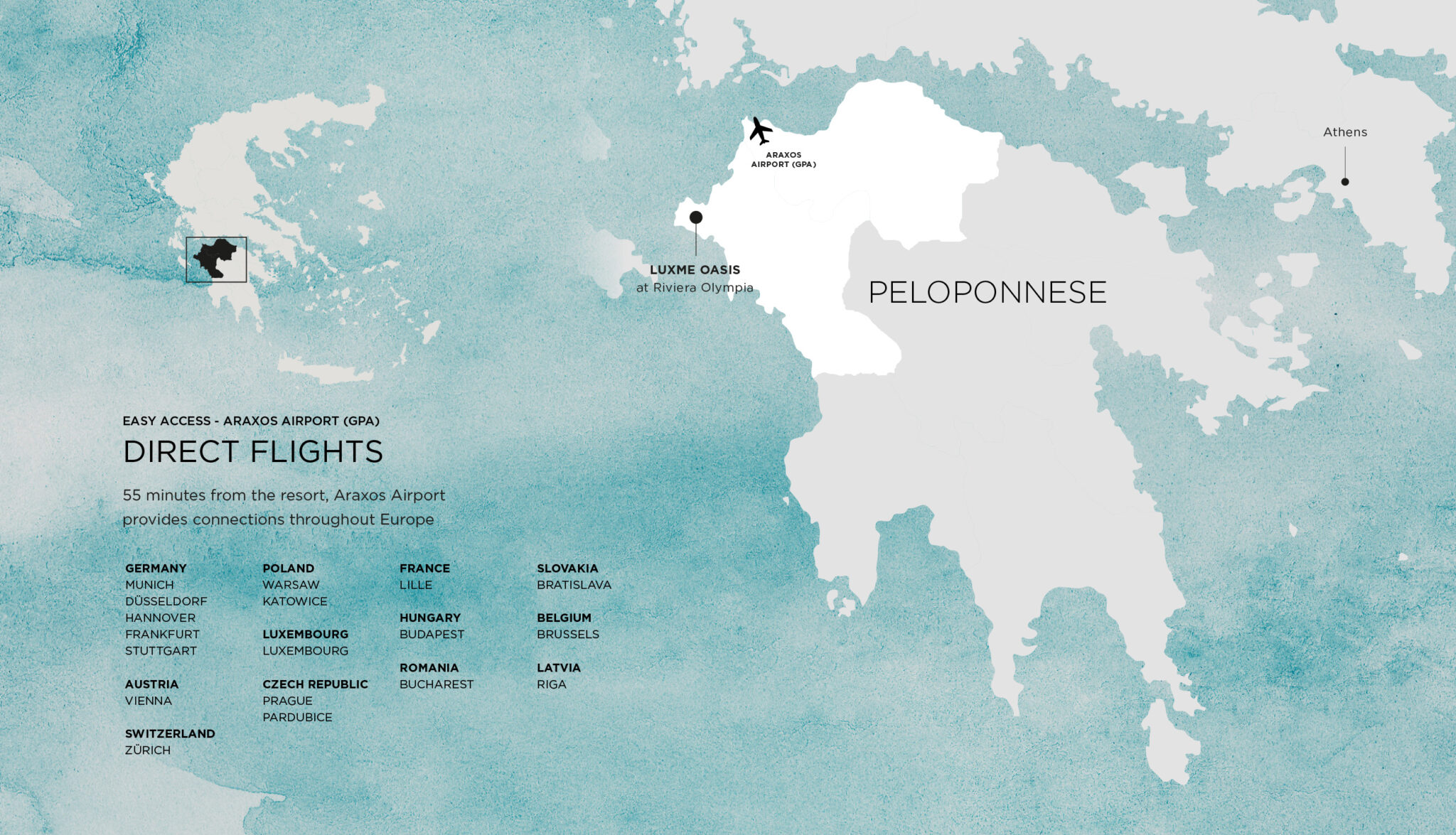 Grecotel LUXME Oasis is conveniently located in Kyllini, on the west coast of the Peloponnese in Ilia. By car, it is approximately 50 km (45 minutes) from Araxos Airport, 154 km (about 2 hours) from Kalamata International Airport, 323 km (around 3 hours 30 minutes) from Athens International Airport, and accessible from Zakynthos Island via ferry or private boat. Wherever your journey begins, LUXME Oasis offers both easy access and a relaxing beachfront retreat once you arrive.