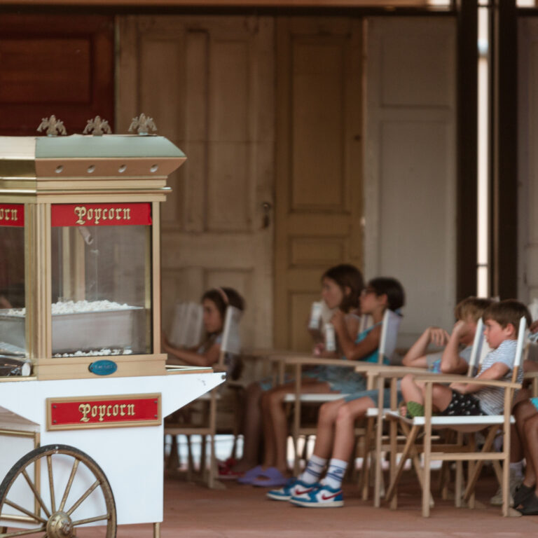 Enjoy a complimentary family movie screening under the stars, complete with popcorn for the perfect cozy movie night.