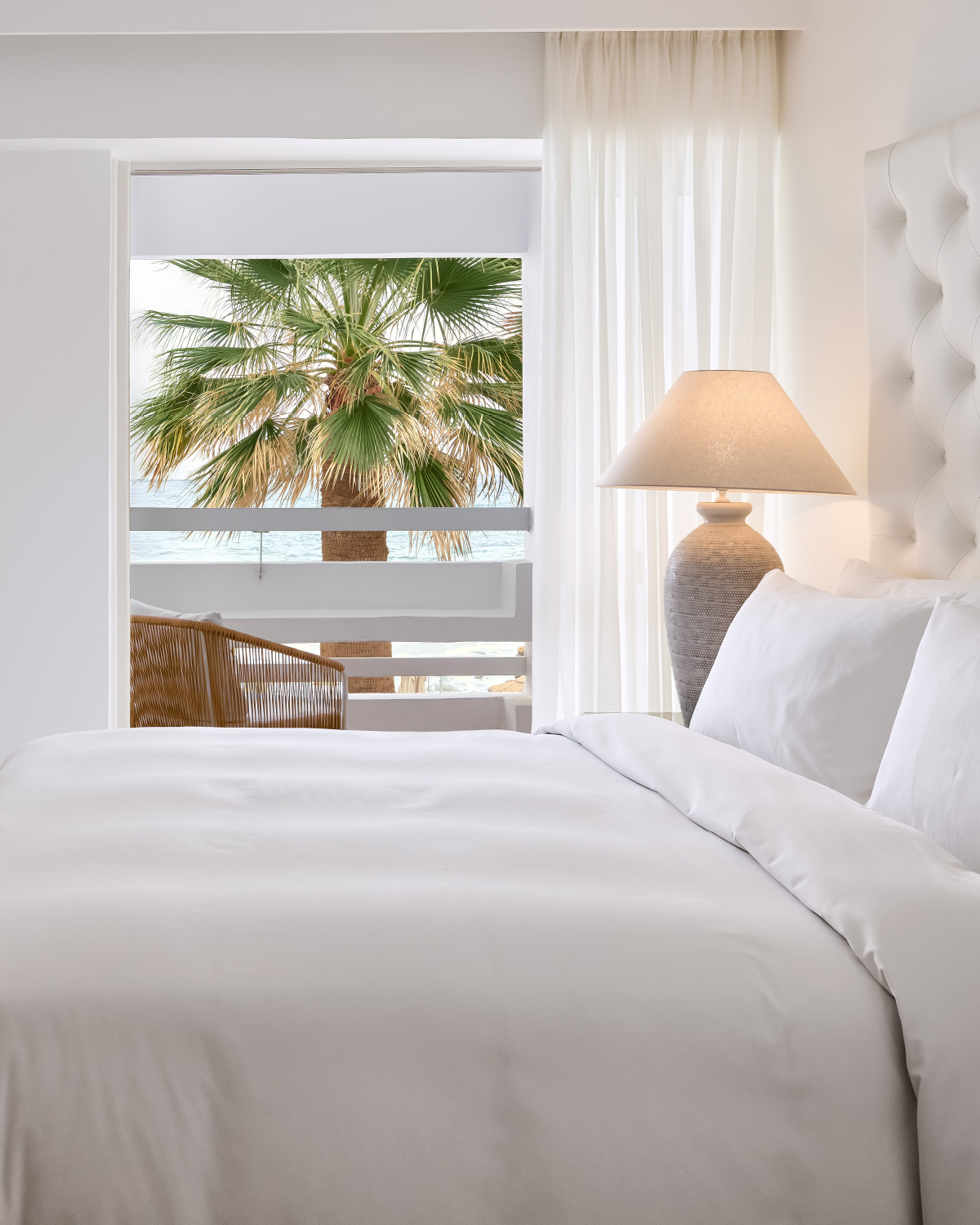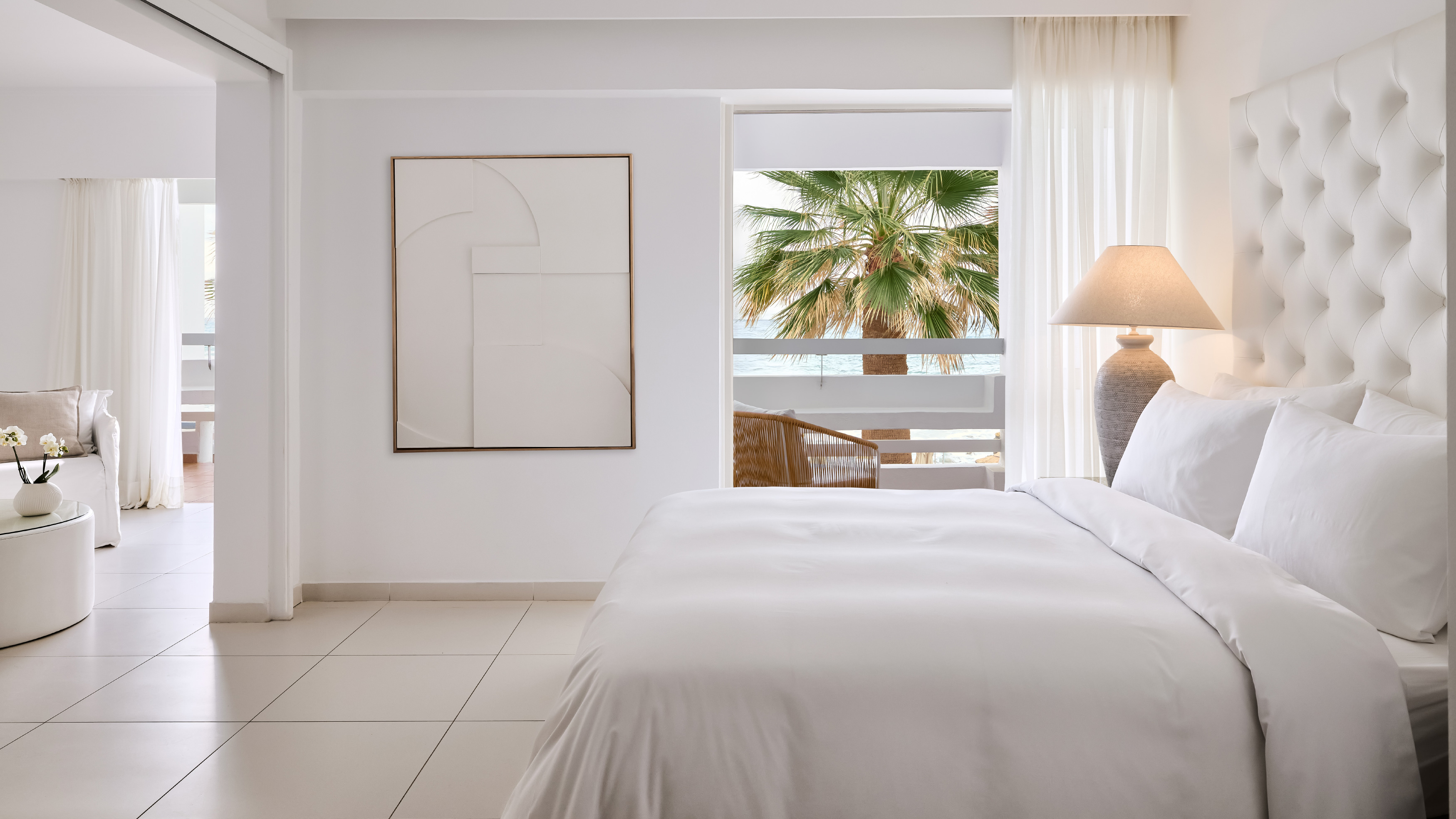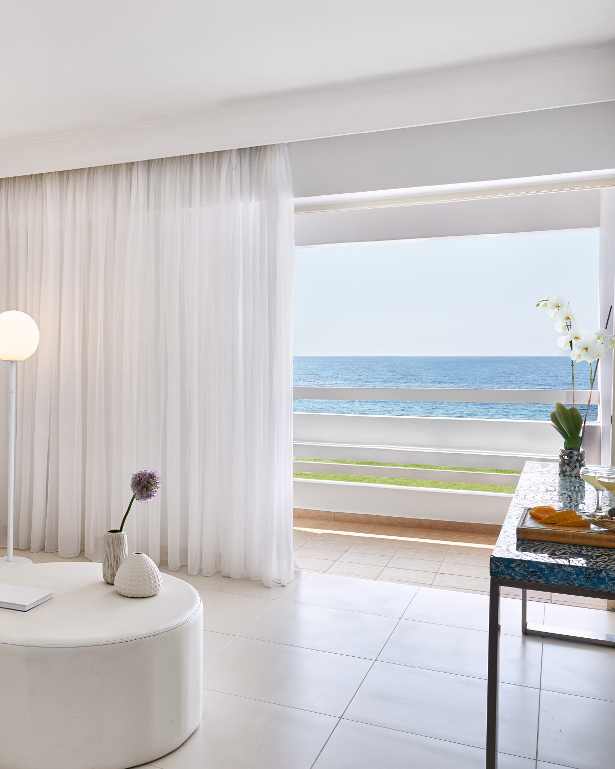 Perfect for families, this room is generously spacious, carefully furnished and gifted with a gorgeous view onto the twinkling Aegean Sea. With two large, separate balconies with plush outdoor furniture, the room has one bathroom and a separate walk-in shower in the master bedroom, and a sliding door that seals off the living area from the bedroom, the room ensures the comfort and peace of the entire family.