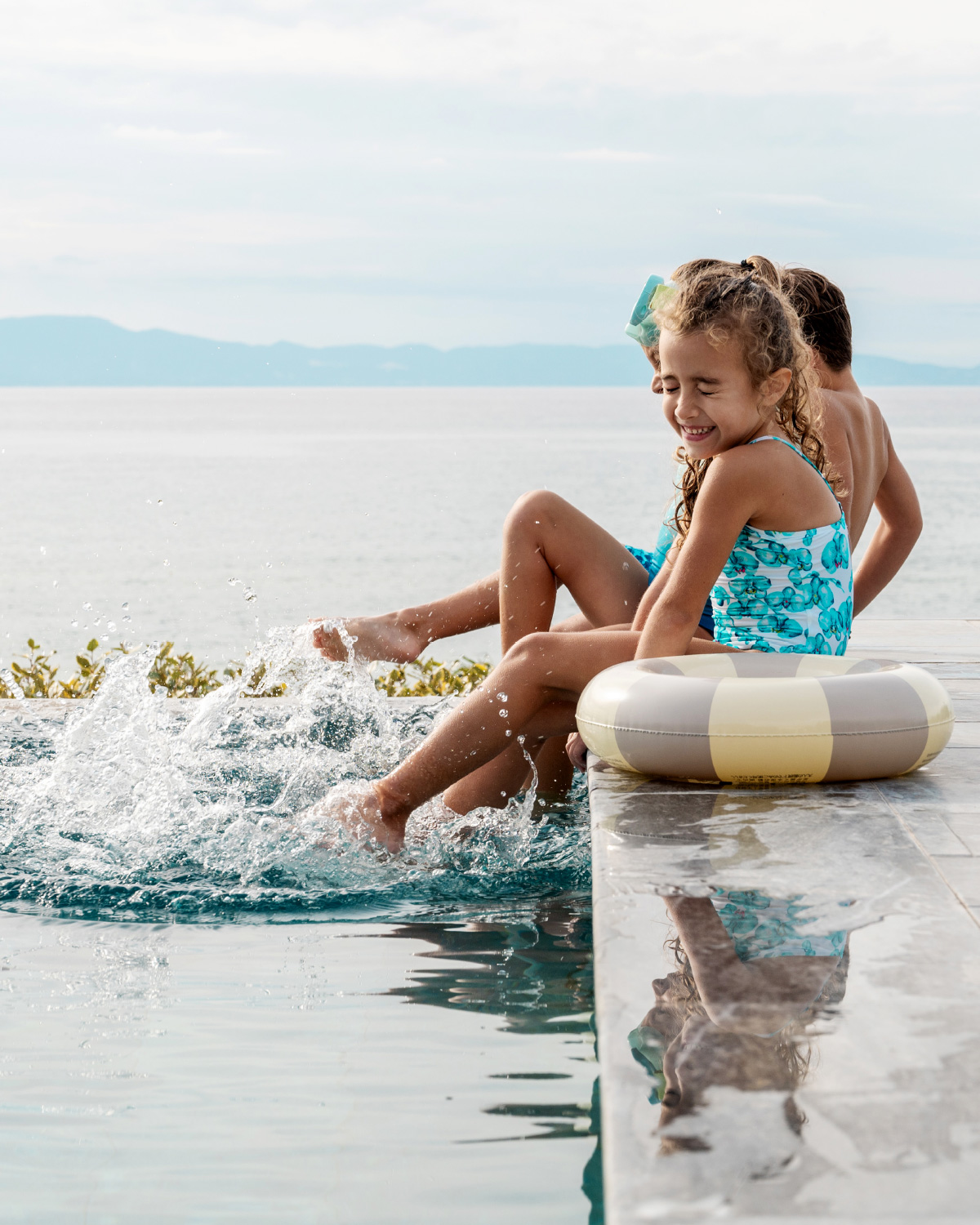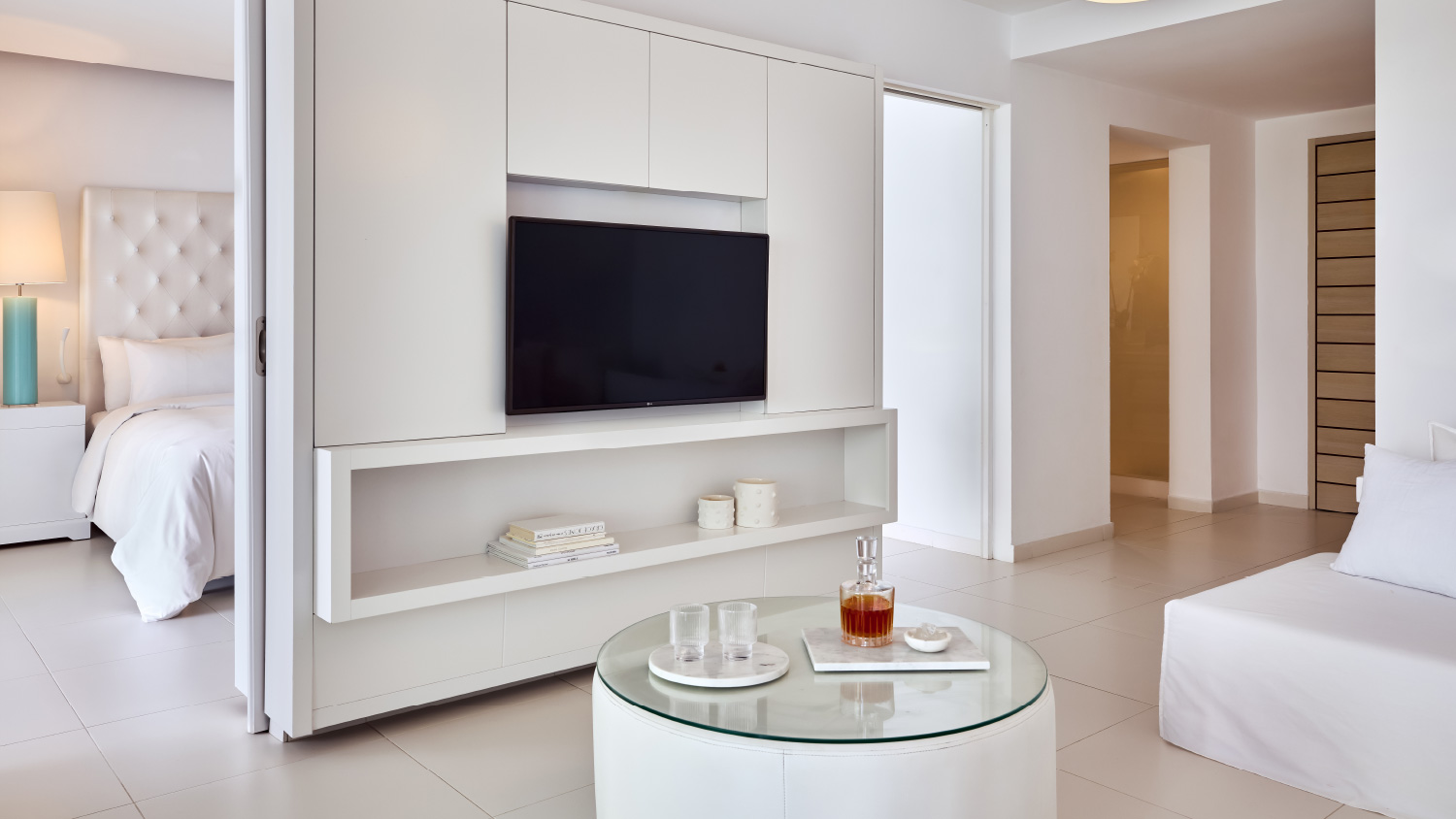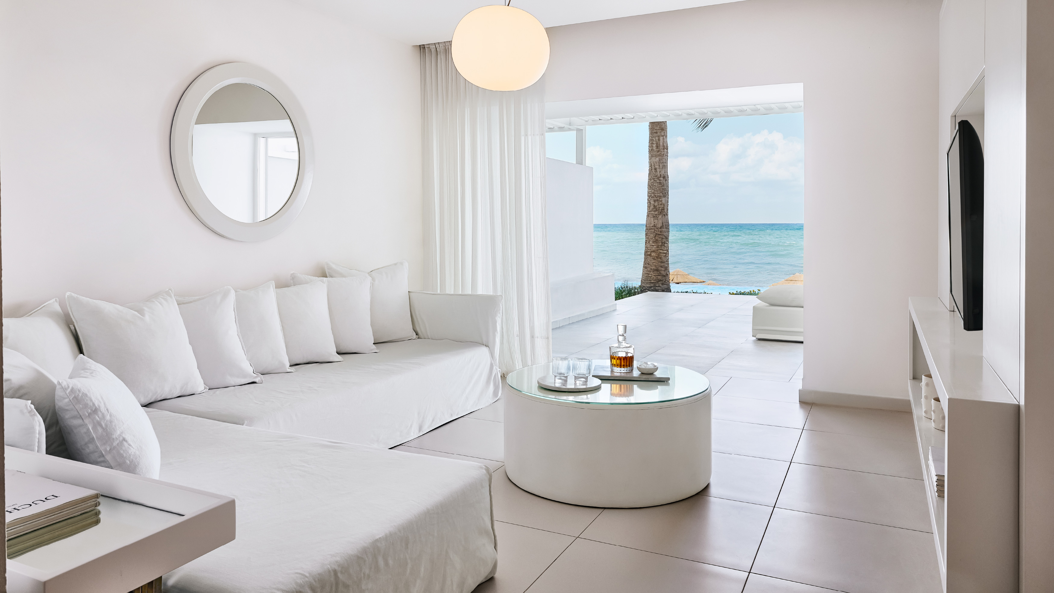 A sun terrace which seems to flow right into the exclusive access infinity pool, custom design furnishings, and an oversized patio a breath away from the Aegean Sea, are only a few of the ultra-luxury details of this suite. Relax like you have never relaxed before in your landscaped garden on a sunbed under an umbrella, choose between shower or bath in your ensuite bathroom, sink into your king size bed, and ensure that the kids are happy in the separate living area that turns into their sleeping area.