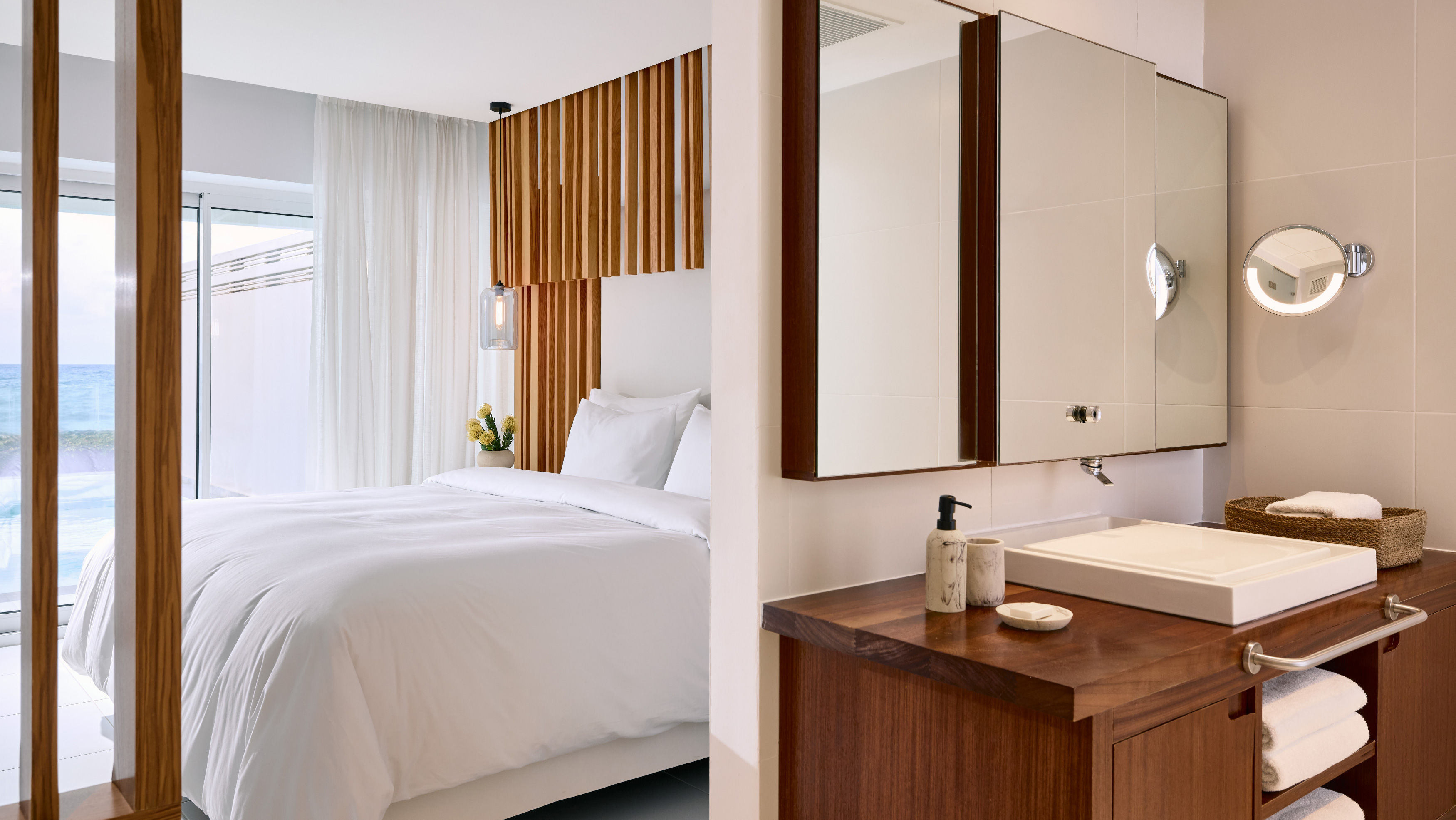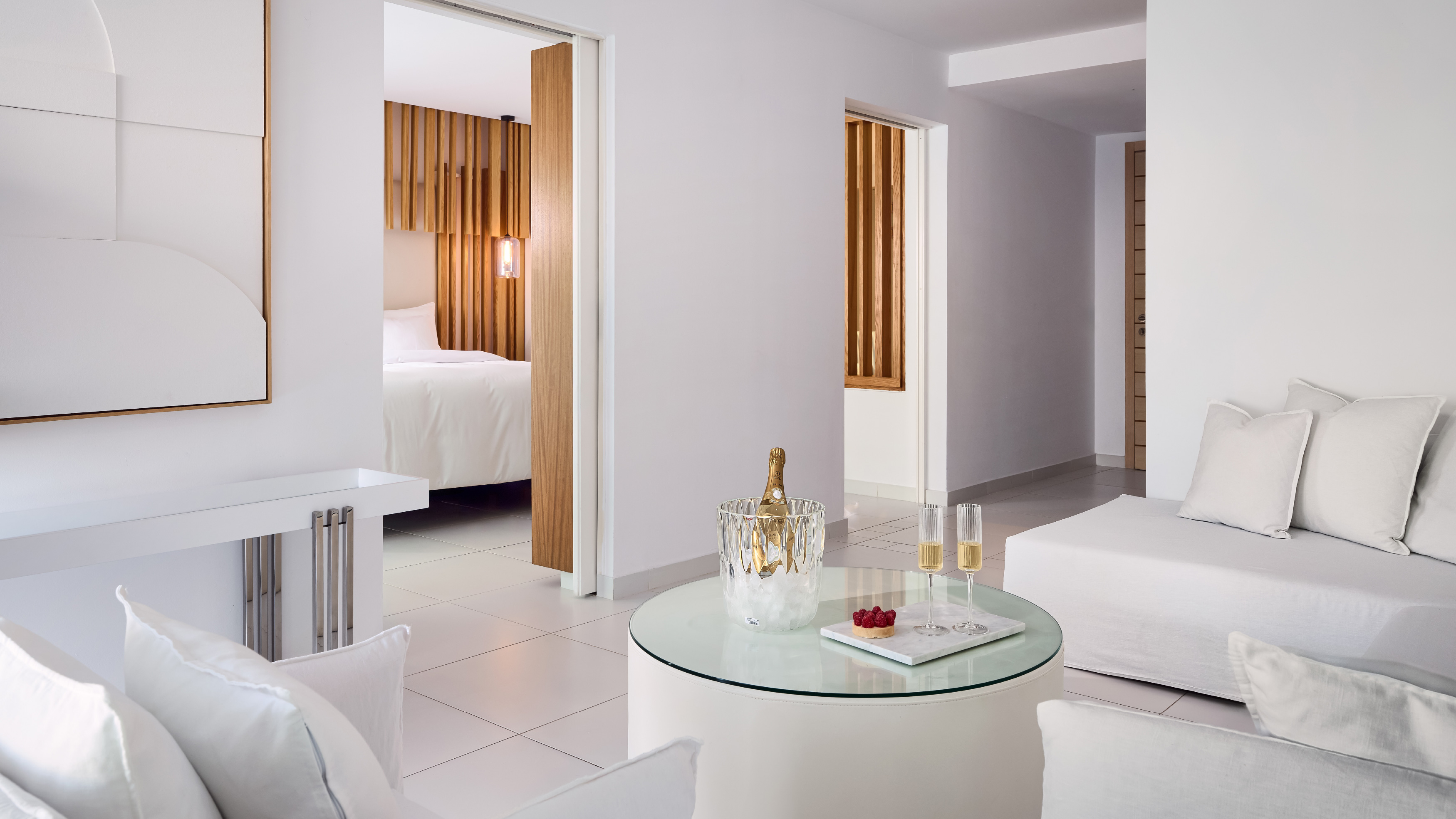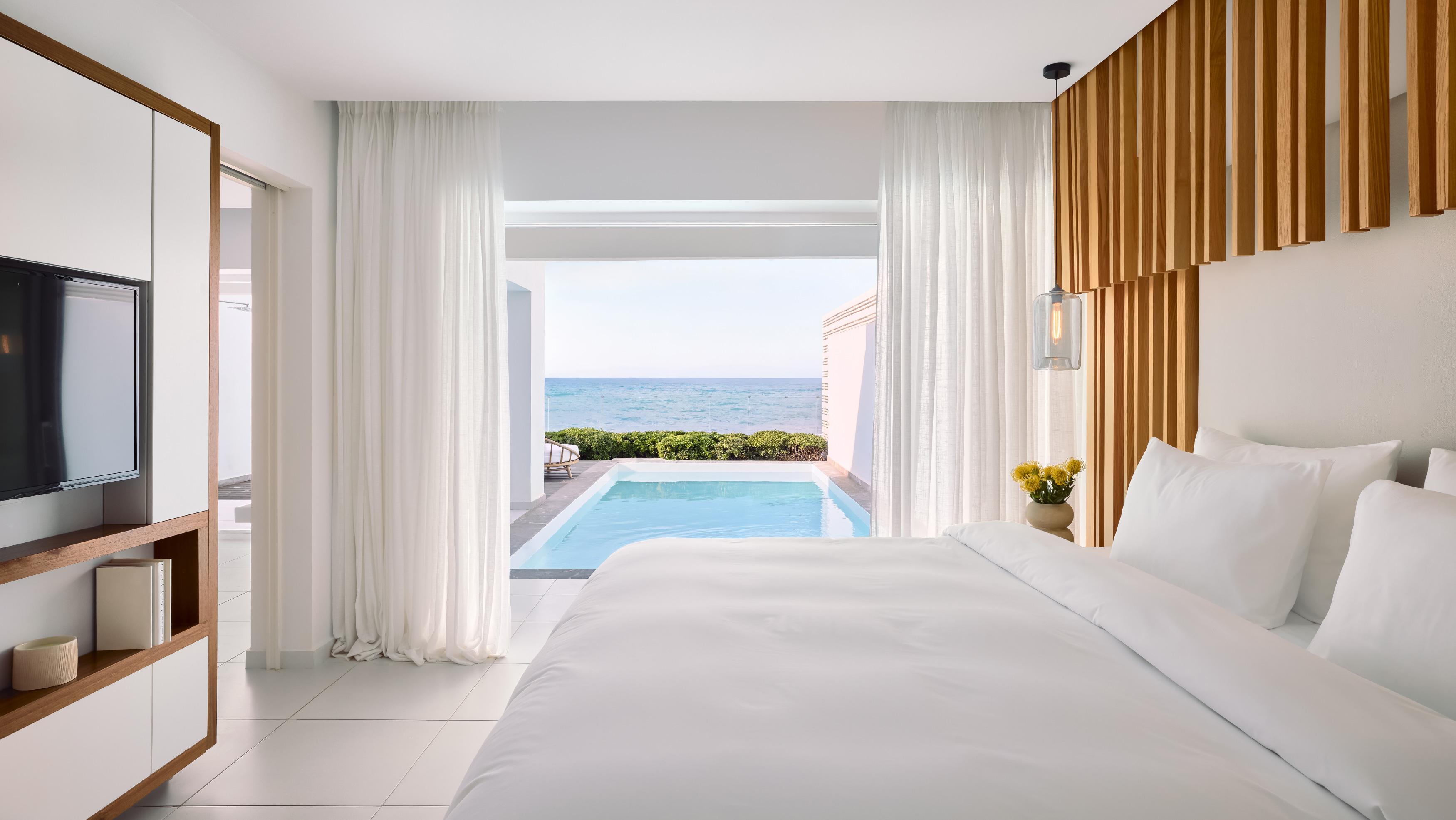 White details capture and reflect the famous Greek sunshine and the open-plan villa fills with the breeze and smell of the Aegean Sea right outside your sliding glass doors. A private pool with large sunken sunbeds (certain villas) awaits. The interior boasts a view of the sea from every room, whether you’re lying in your king size bed, lounging in the exquisite living room, or relaxing in the bathtub. Ultimate privacy and unparalleled comfort in a space that will make you feel pampered day and night.