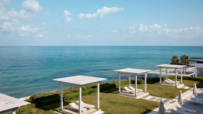 - BLICK: Weiße, raumhohe Glastüren mit Blick auf das Kretische Meer