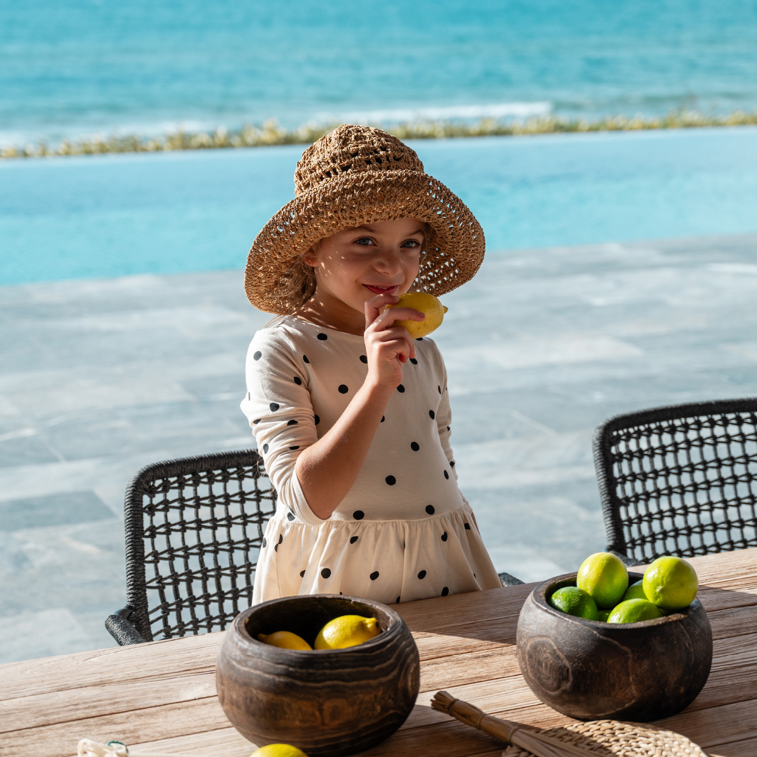 Sur une plage de sable et de galets de 1 000 m de long, labellisée « Pavillon bleu », avec une qualité d’eau exceptionnelle garantie par les vastes champs de posidonies à quelques kilomètres au large. La plage est équipée de parasols en bambou, de chaises longues équipées de matelas souples et d’une zone réservée aux adultes. Aventurez-vous lors de promenades au coucher du soleil ou de séances de yoga et prenez soin des petites tortues caretta-caretta.