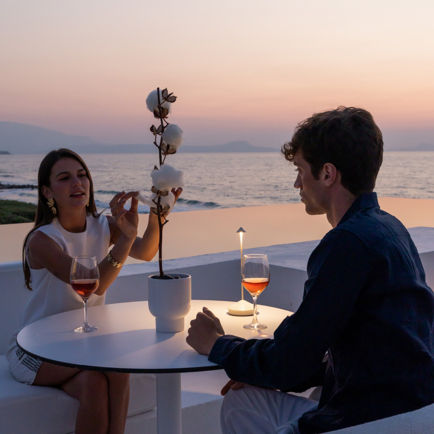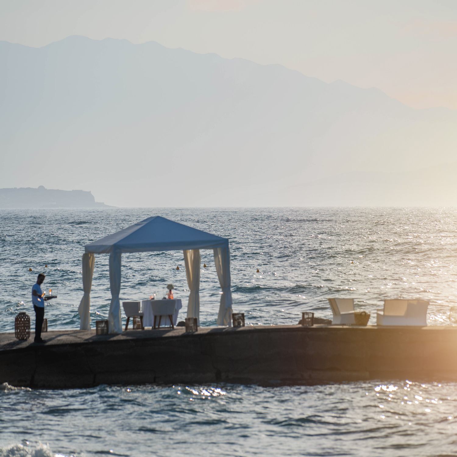 - DÎNER PRIVÉ (2 à 4 adultes) Dans le cadre de votre expérience, vous profiterez d’une soirée élégante au cours d’un dîner exquis au bord de la mer, à l’heure du coucher du soleil, accompagné du son des douces vagues de la paisible mer Égée.
