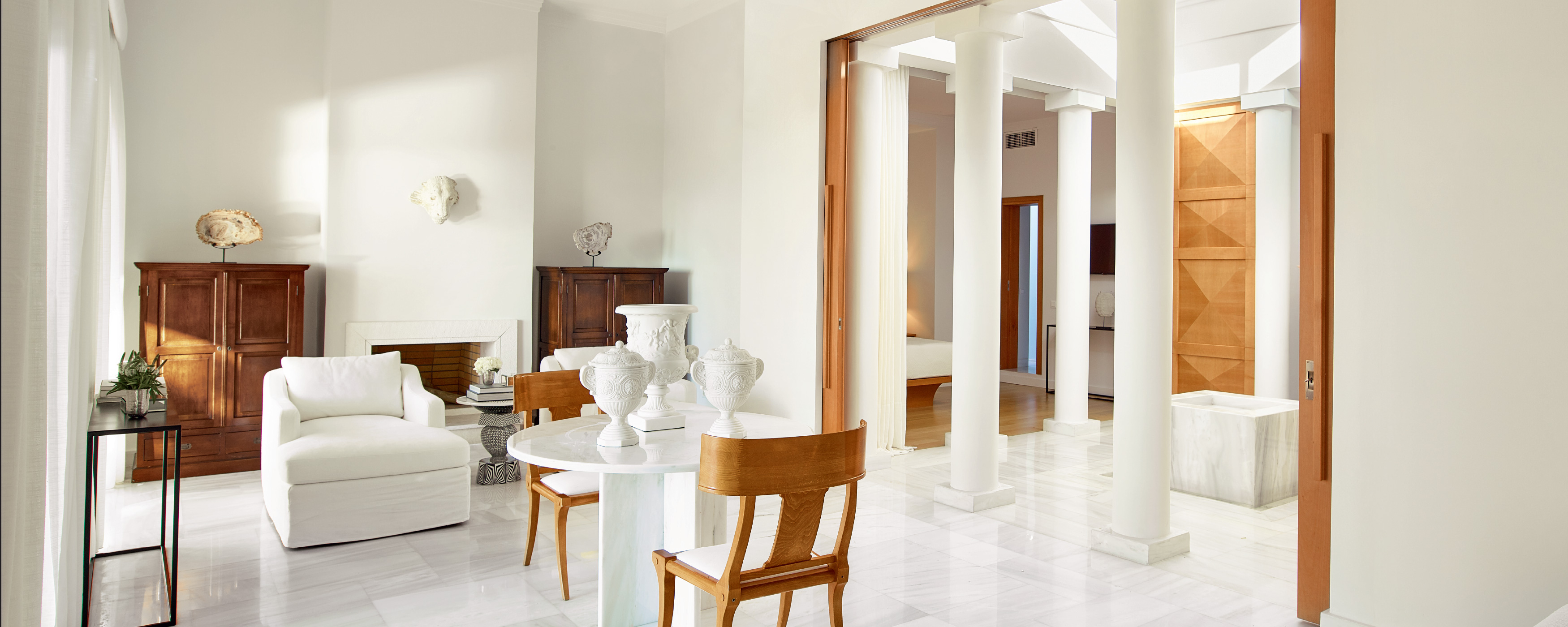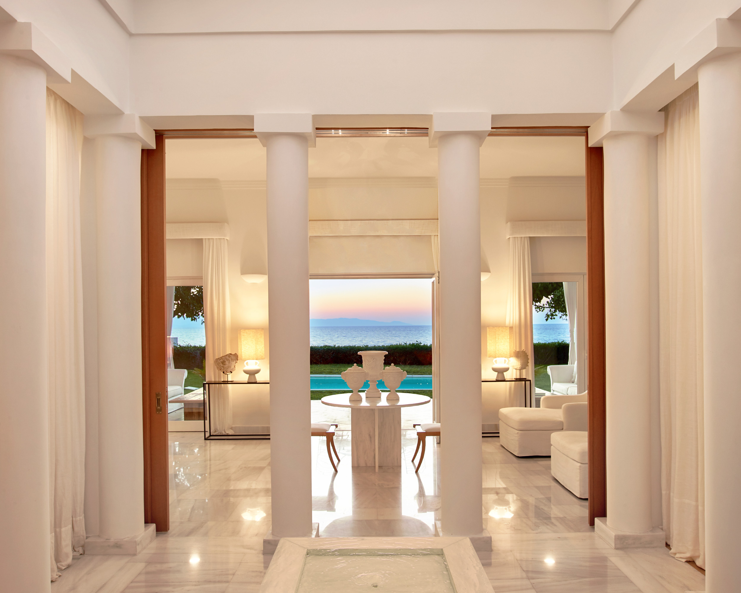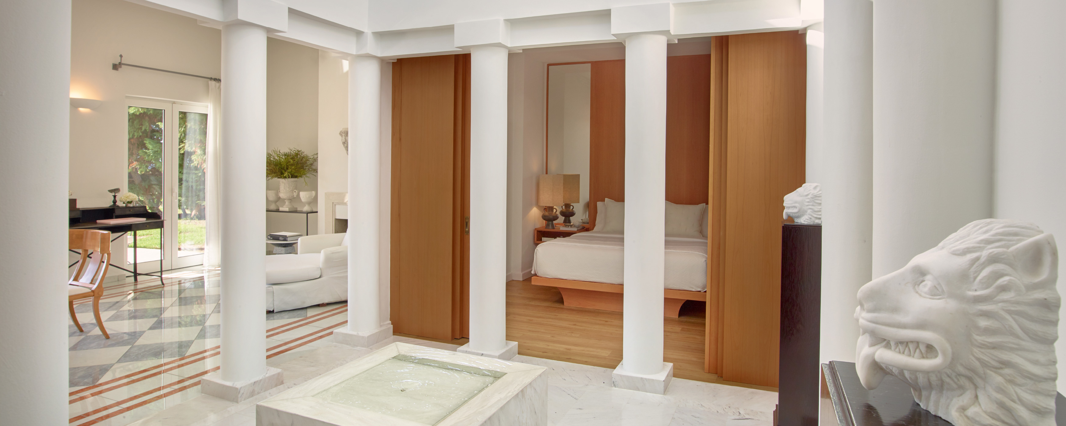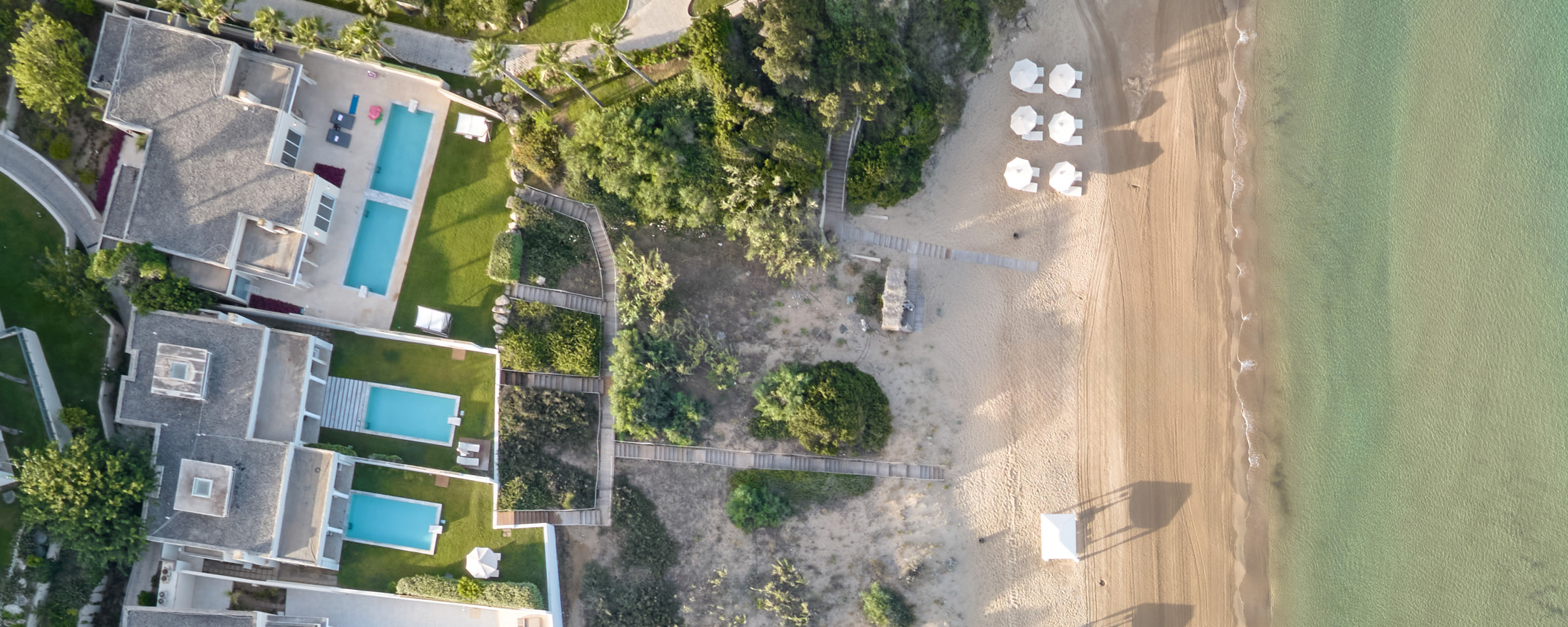 The Mandola Rosa building epitomizes the old-world begulling aristocratic flair. Rose coloured, after the almond trees that blossom in Ancient Olympia nearby, the intimate suites and delightful terraces reflect an exquisite aura and intricate aesthetic. The private villas capture the enticing freedom of the finest luxurious beachfront living with impeccable personalised service and exceptional comfort.