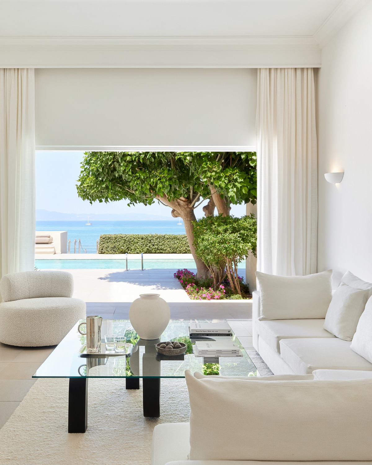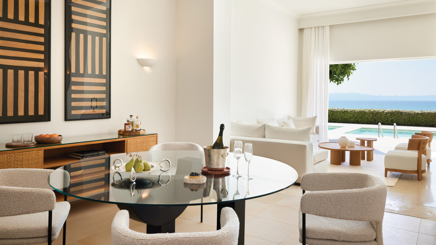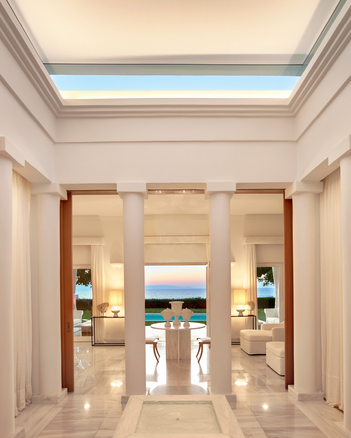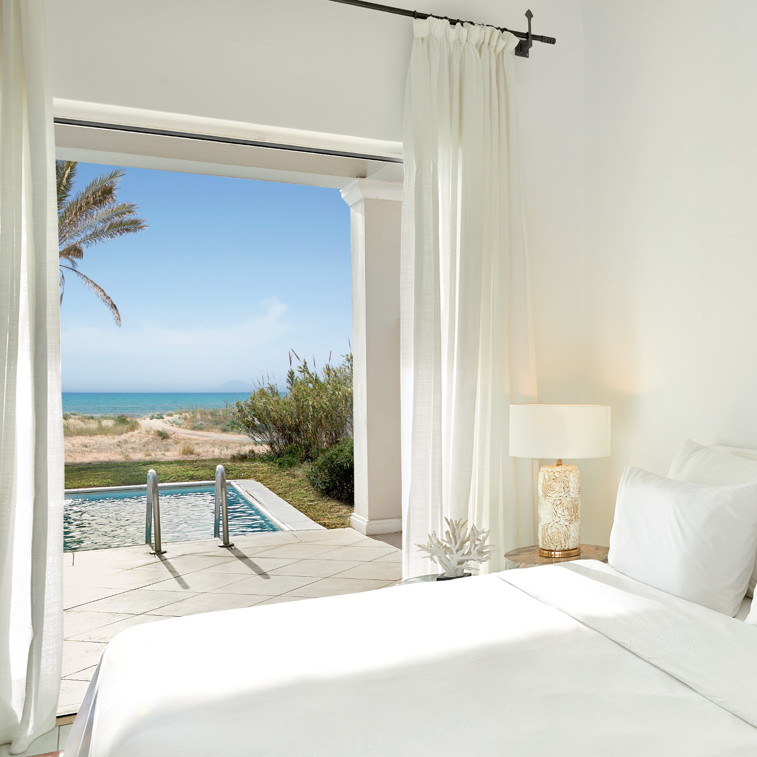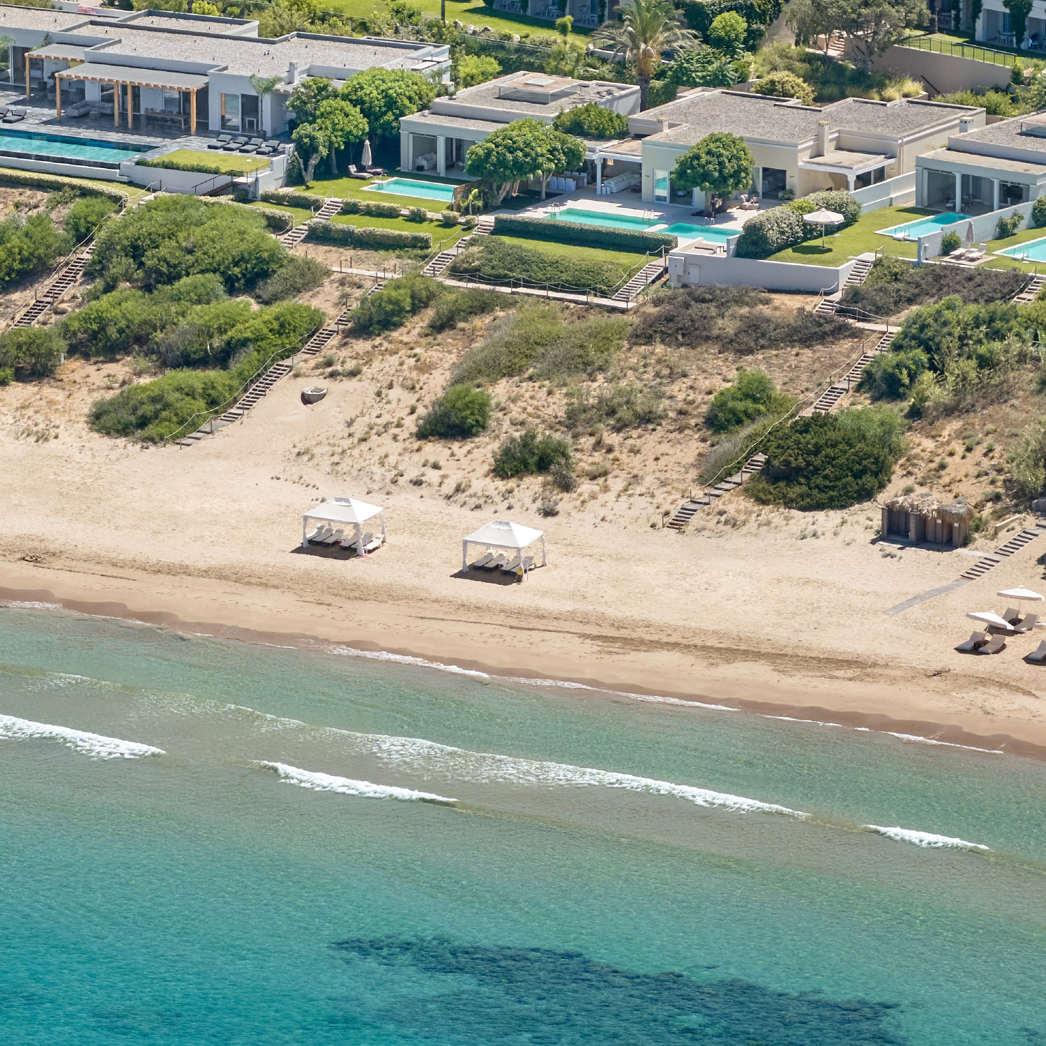 Located in the most exclusive section of Mandola Rosa Riviera, this Grand Sunset Residence offers the most extravagant beachfront setting in the resort with its own private beach cabana. The Residence is set out all in one level with amazing terraces, a grand marble pool and a more private master suite pool; all with infinity views to the sea. There are 5 bedrooms, all in crisp white cotton and linen decoration with luxurious bathrooms. The Grand Master suite is centered around a sparkling skylight with direct sea views, a cool veranda to relax or dine, a his & hers bathroom and a walk-in wardrobe room. The Salon opens to the covered and open air verandas with outdoor cozy cinema, ideal for family time together. Throughout the Residence the luxury of Greek marble, rich wood and works of Art creates a feeling of serenity, all in an amazing natural setting with the sounds of the sea.