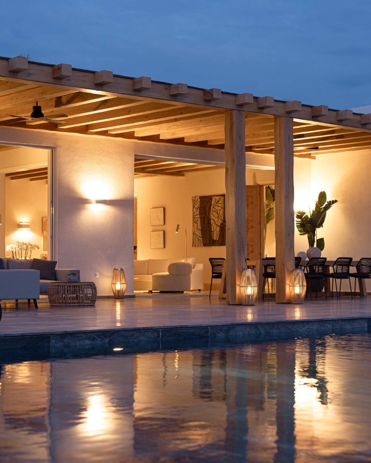- LAYOUT: Two Master Bedroom Suites. One bedroom with twin beds. Multiple separate living and dining areas with high wood beamed ceilings. Multiple separate outdoor shaded living areas. Kitchen. Indoor Pool with lounge beds. Private massage area. Two entrances.