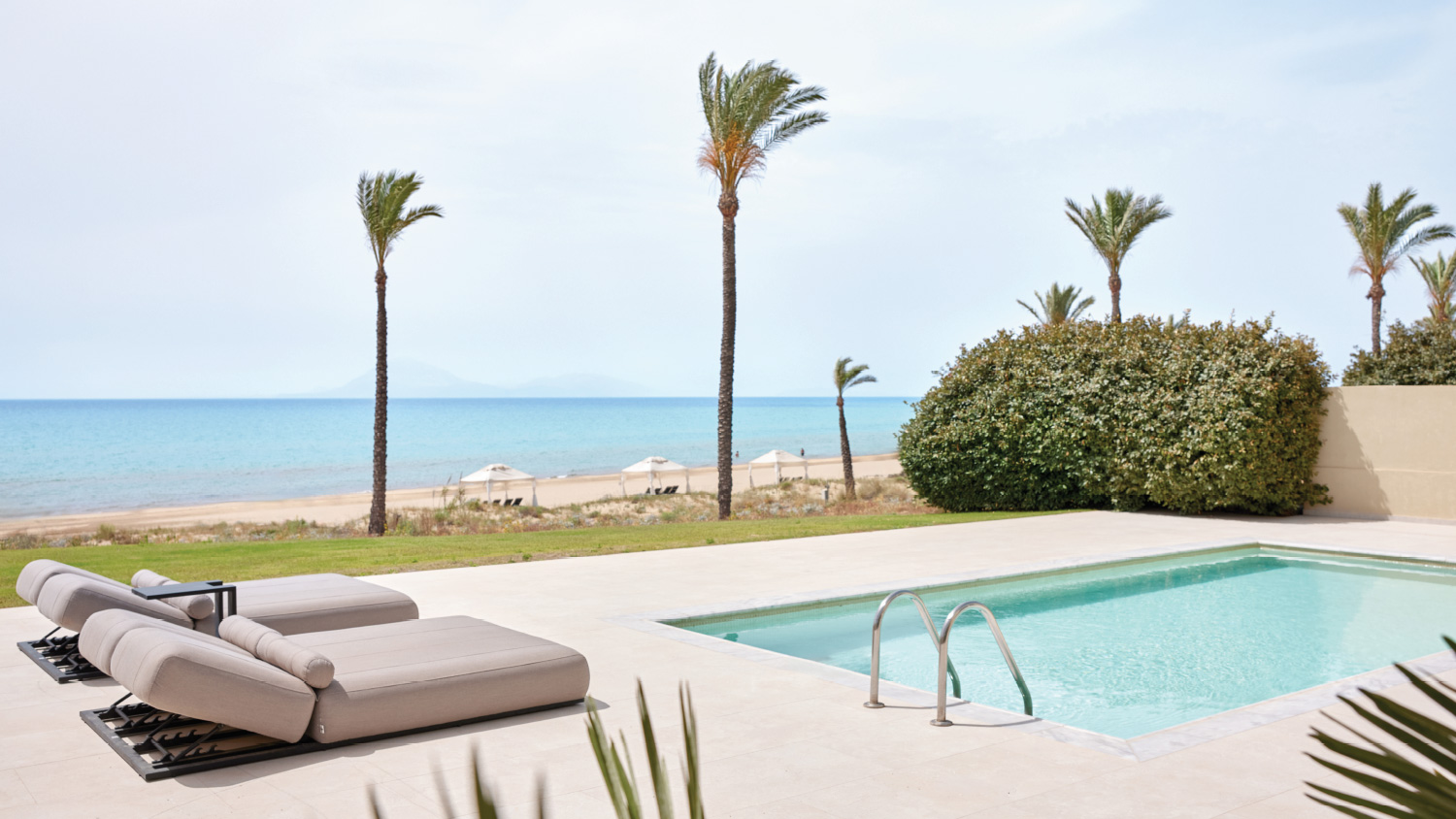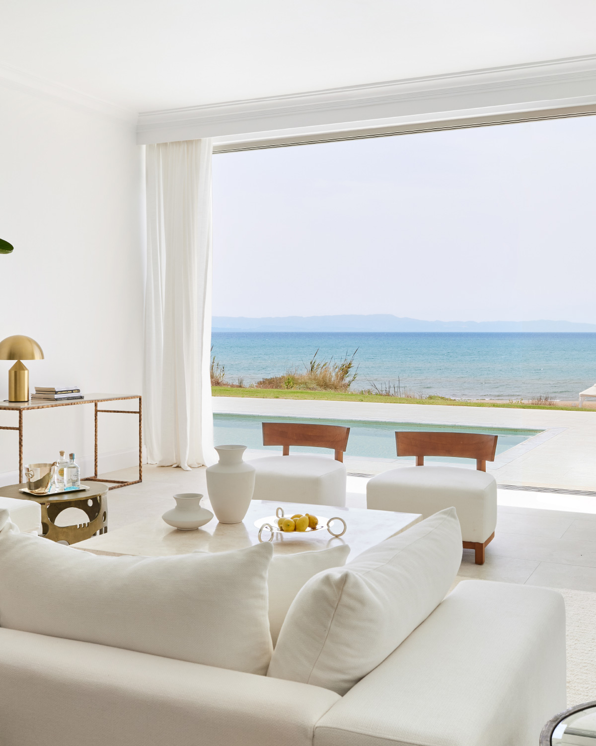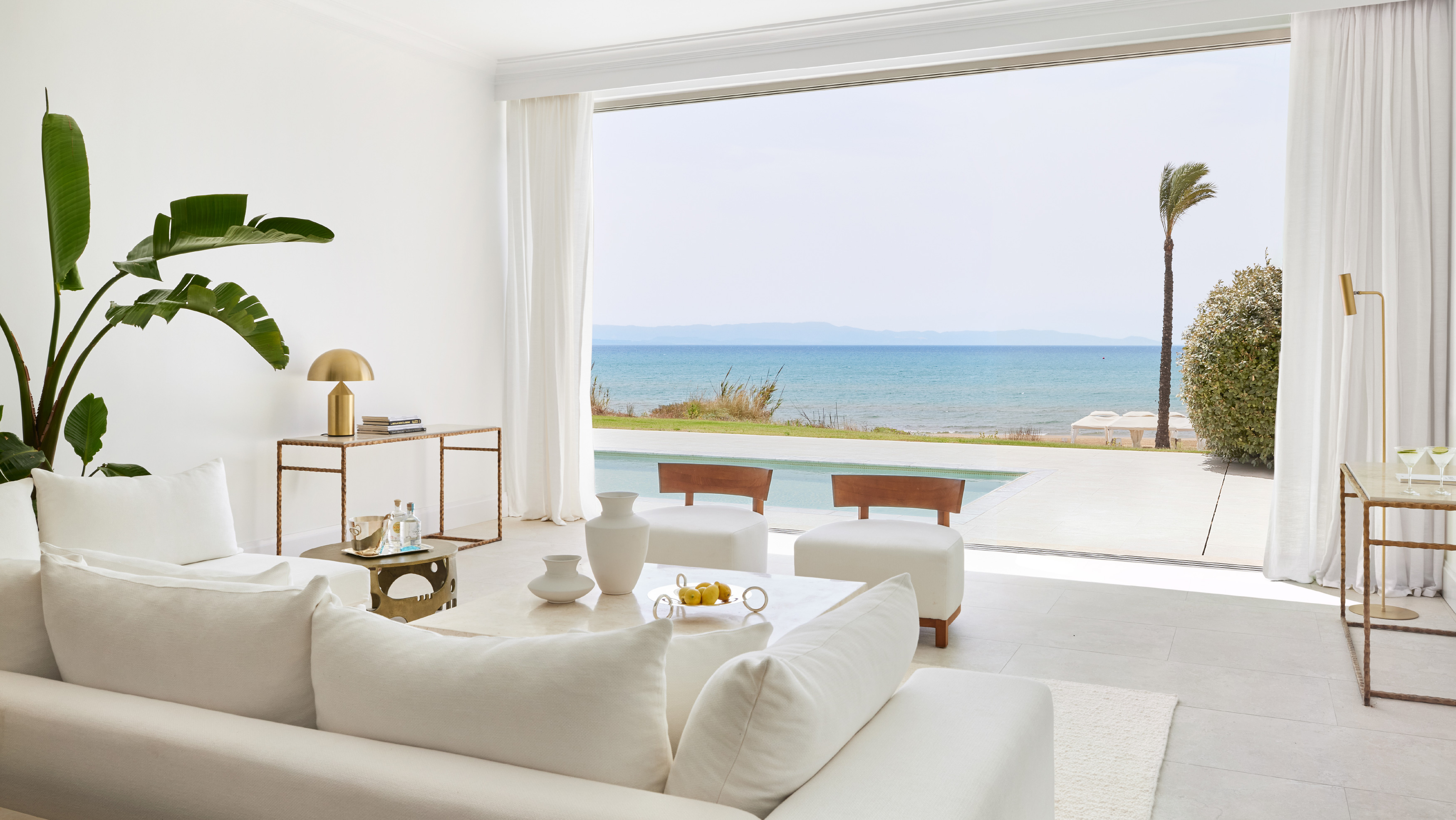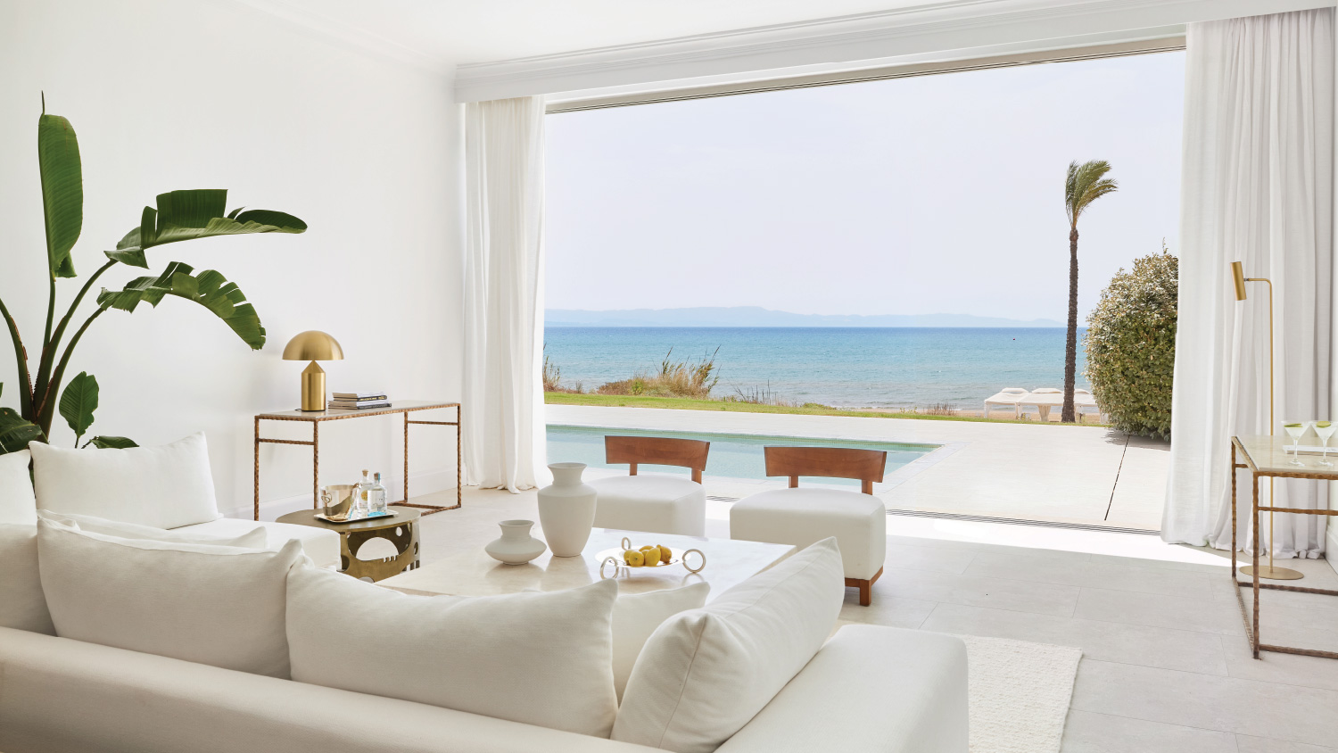 This exclusive residence is ideally secluded, with private swimming pool, garden and separate entrance. With the cool contemporary design reminiscent of a Mediterranean beach house, Royal Pavilion on the Beach is a supremely deluxe villa with bespoke furnishing, three master bedroom suites, a shaded stone-laid open-air salon with private pool showcasing stupendous views of the Ionian Sea.