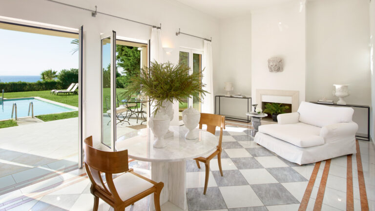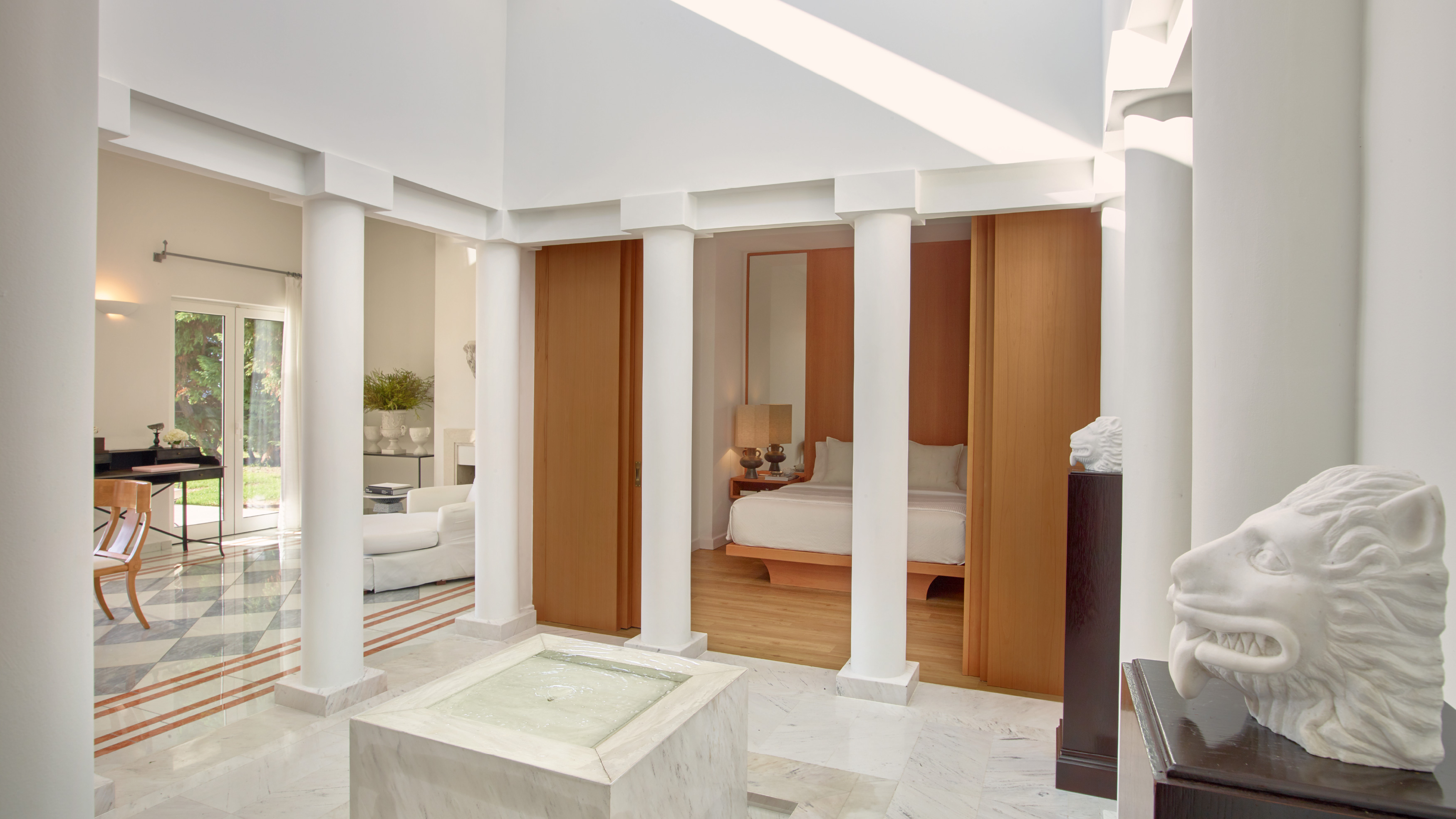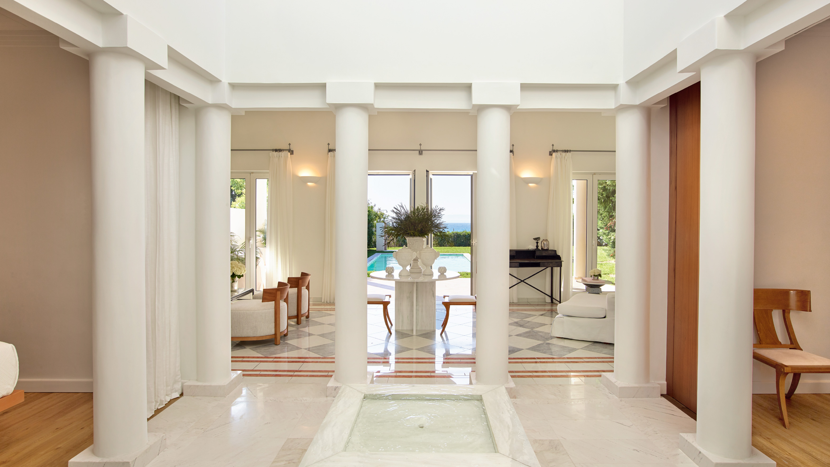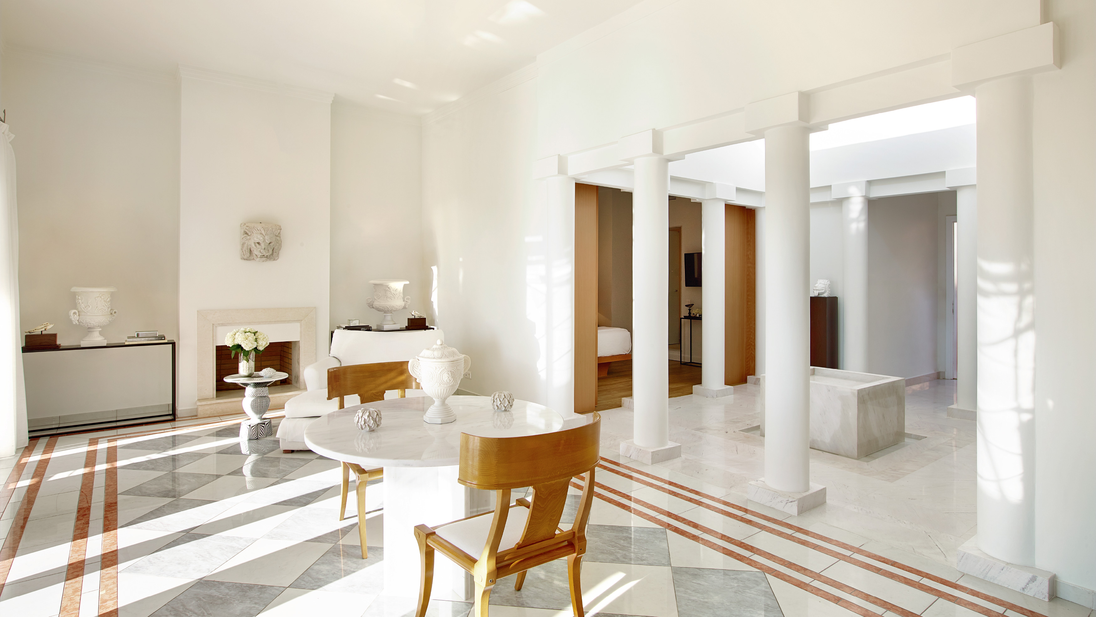 Enter a villa inspired by ancient Greece featuring a central tented atrium, two bedrooms with en suite bathrooms and a fabulous full sea view indoor lounge and dining area with an atmospheric fire place.