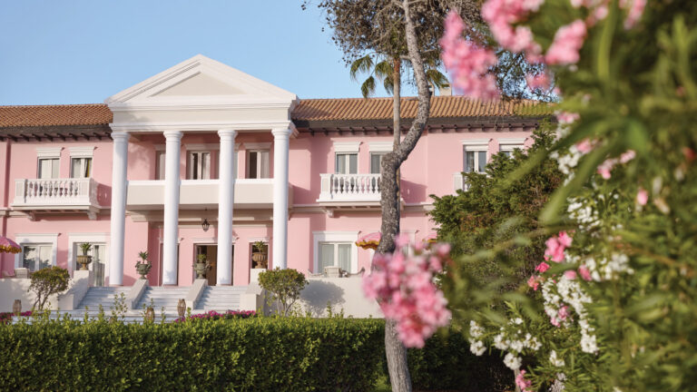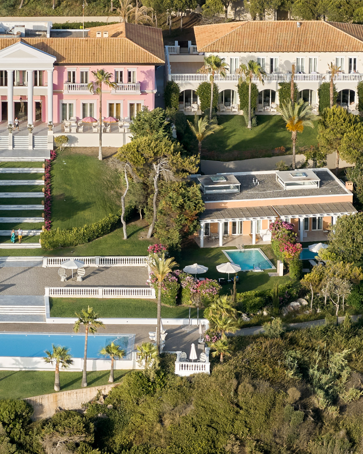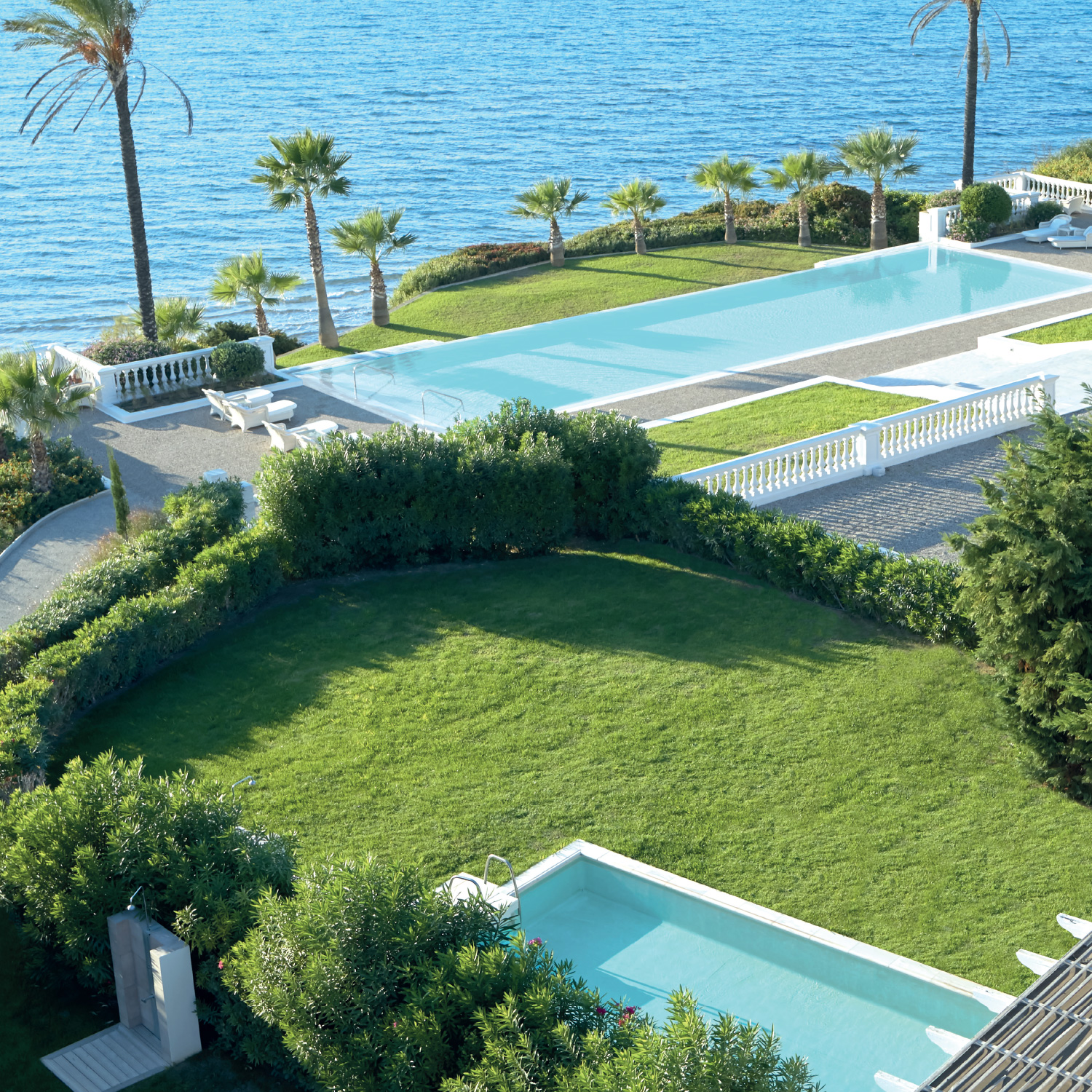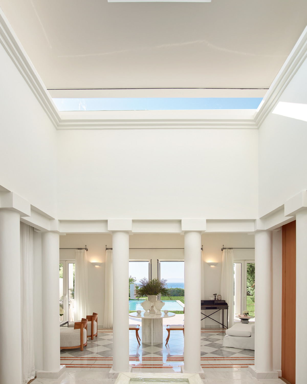 Enter a villa inspired by ancient Greece featuring a central tented atrium, two bedrooms with en suite bathrooms and a fabulous full sea view indoor lounge and dining area with an atmospheric fire place.