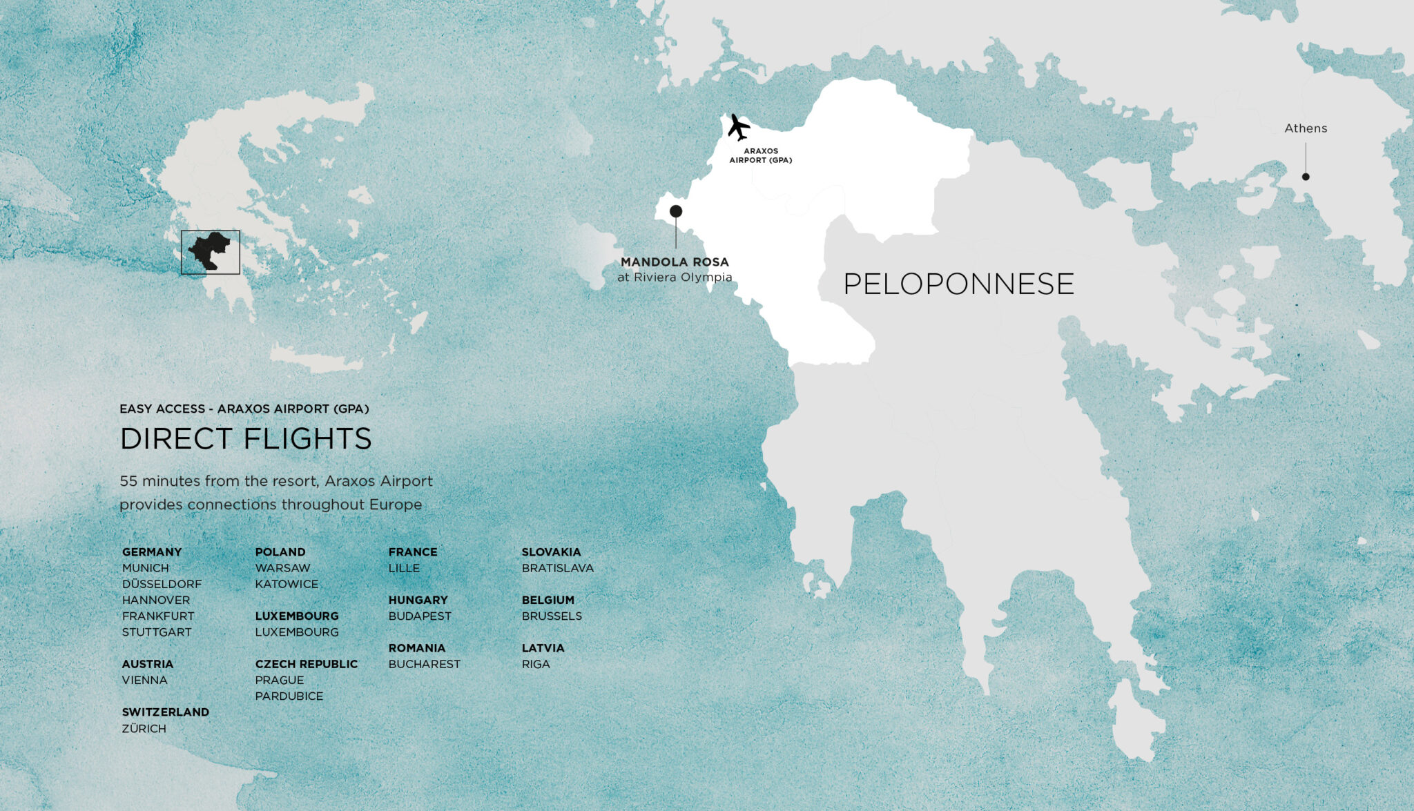 Located in West Peloponnese, Mandola Rosa enjoys a privileged seaside setting in Kyllini, within the region of Ilia. Ideally positioned just 45 minutes from Araxos Airport and 80km from the port of Patras, the resort offers easy access by road, air, and sea. Set along the golden beaches near Ancient Olympia, the area is steeped in history, nature, and myth, bordered by centuries-old forests and unspoiled landscapes. Guests are perfectly placed to explore the archaeological wonders of Olympia, the Ionian coastline, and the authentic charm of western Peloponnese, while enjoying a tranquil beachfront retreat and world-class resort experiences.