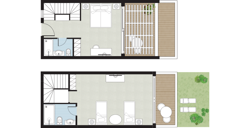 Die Casa Marina Familien-Maisonetten sind speziell für Familien konzipiert und bieten getrennte Schlafräume auf zwei Ebenen sowie eine geräumige, überdachte Außenterrasse mit privatem Garten für gemeinsame Momente unter freien Himmel.