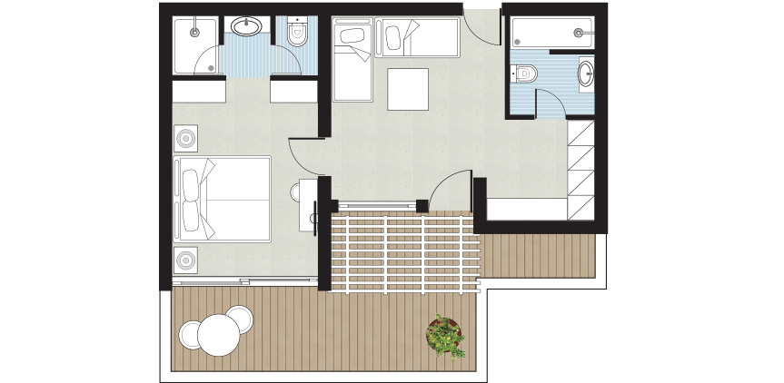 - BESONDERHEITEN: Große, möblierte Terrasse mit privatem Garten, In der Nähe des resorteigenen Aqua Parks