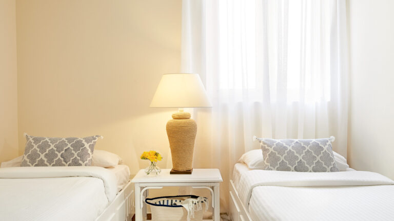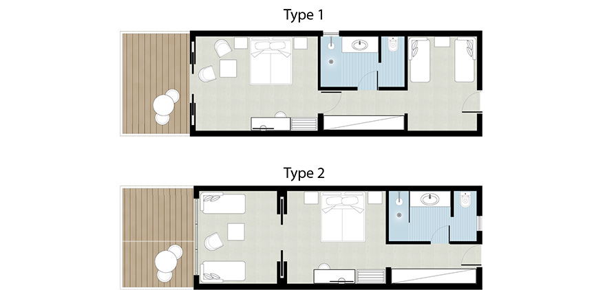 Diese geräumigen Familienbungalows sind in kühlen, frischen Farben gehalten, die an die farbenfrohen Gärten erinnern, und bieten zwei Schlafbereiche − perfekt für Familien mit Kindern.
