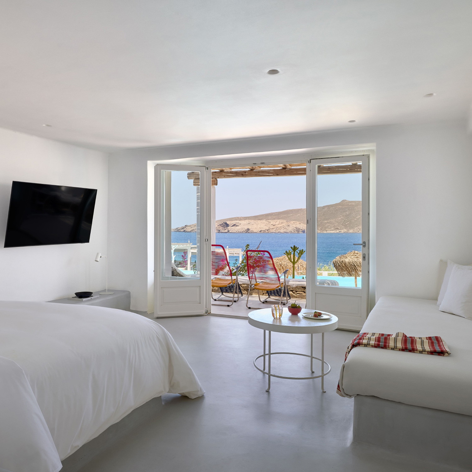 Junior Suites totally renovated, with sea view, pool view and view of Panormos Bay.
