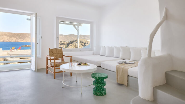 First floor 2 Bedroom Suite with one or two levels, with panoramic sea view and view of Panormos Bay.