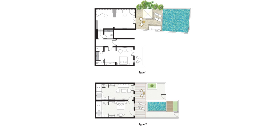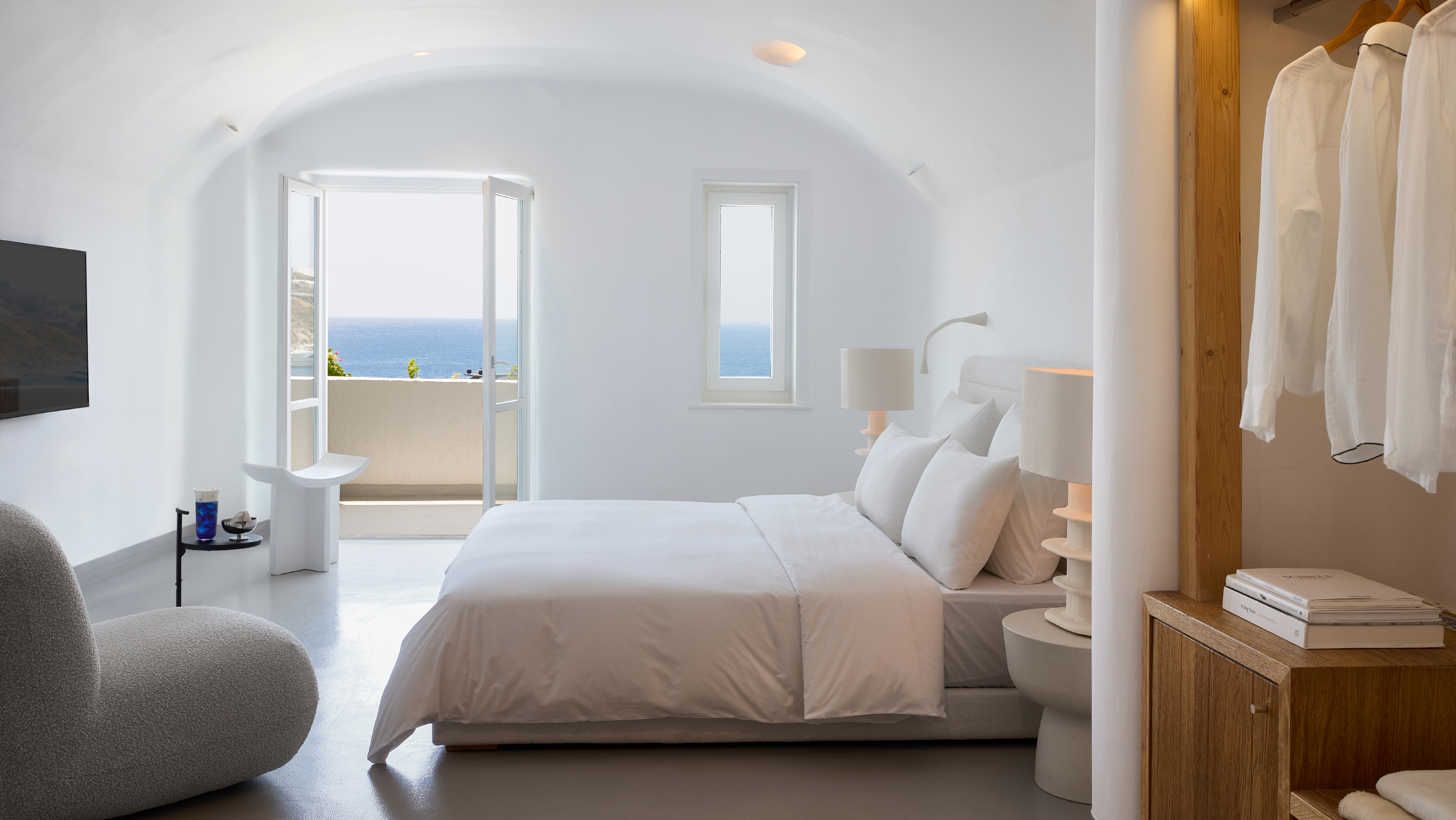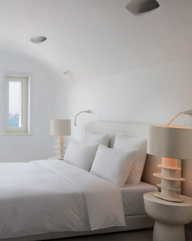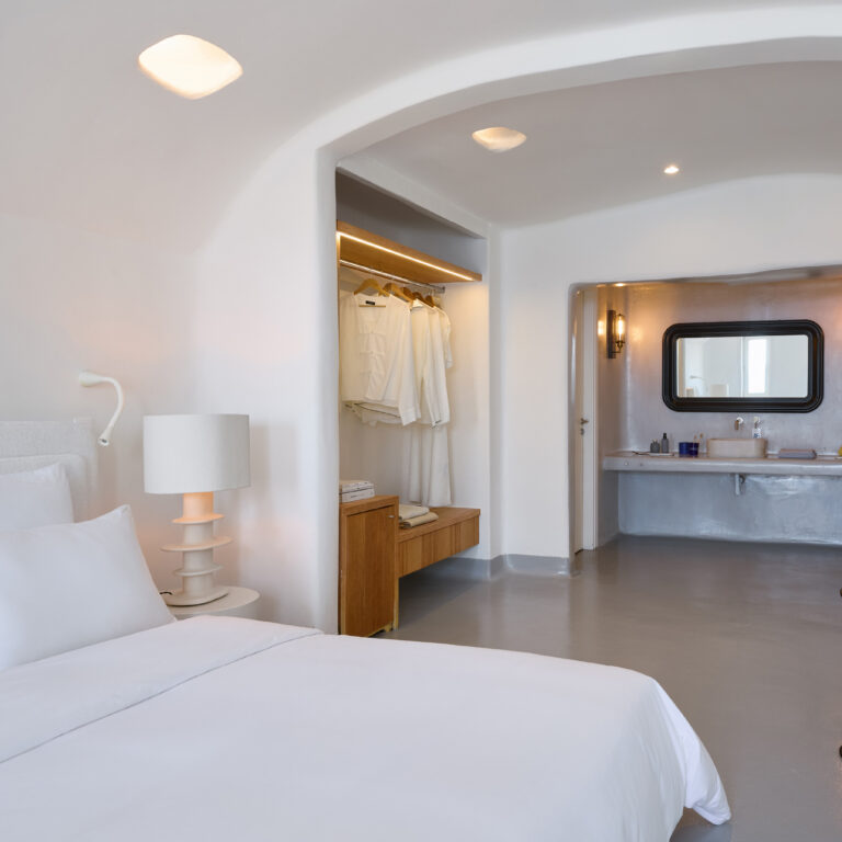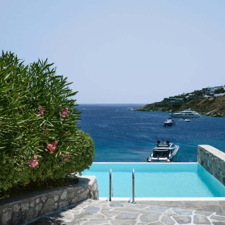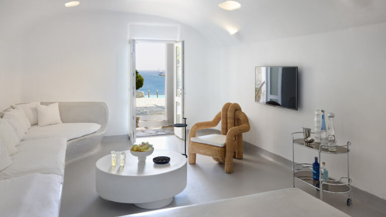 The remarkable setting inspires the unique decor. The Grand Blu Suite with a large private pool overlooking the famous Psarou Beach is the ultimate accommodation in Mykonos Blu.
