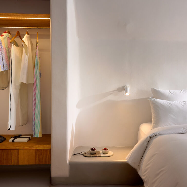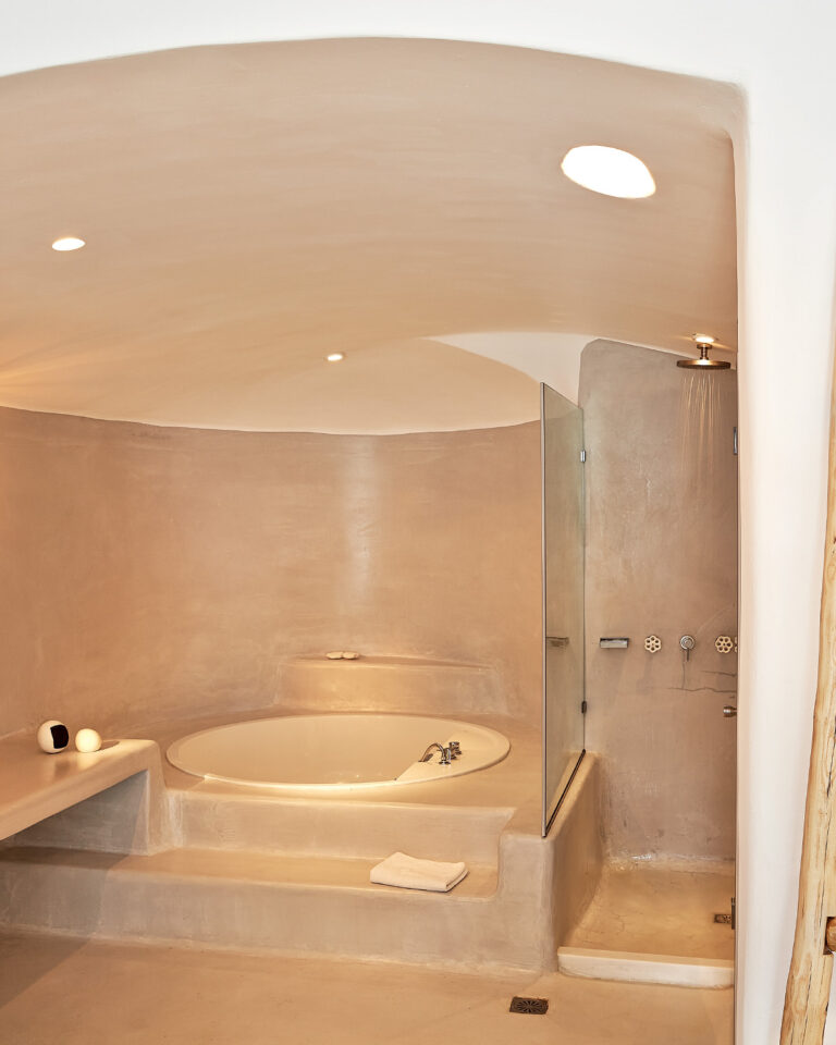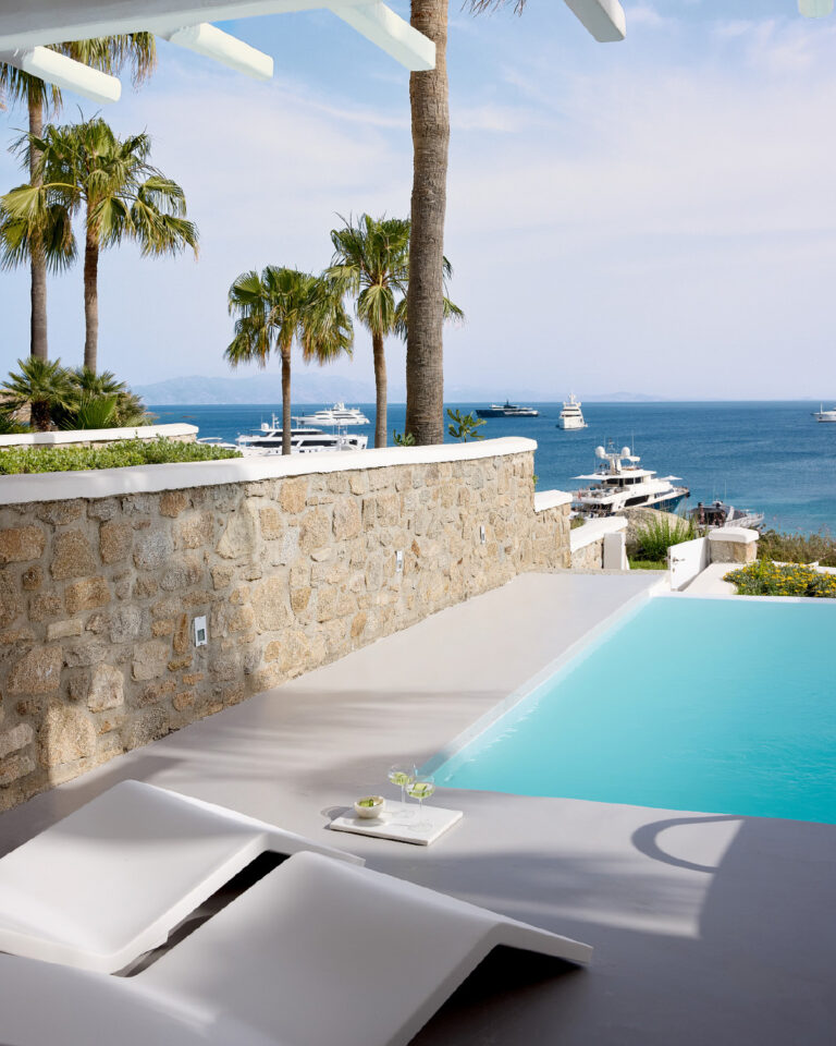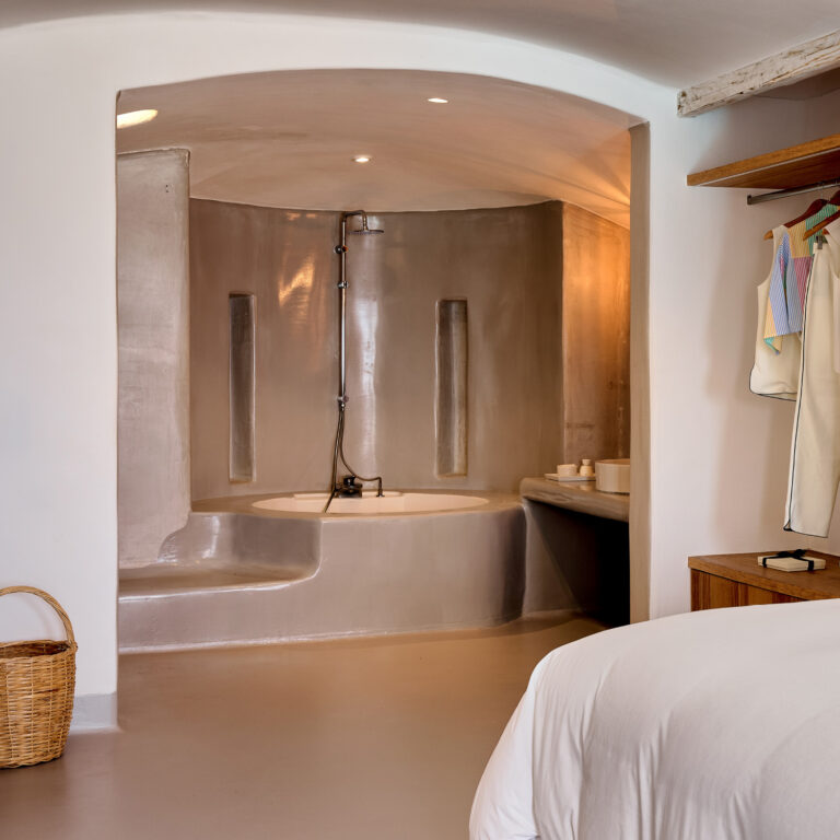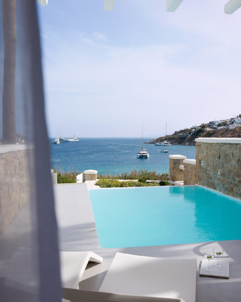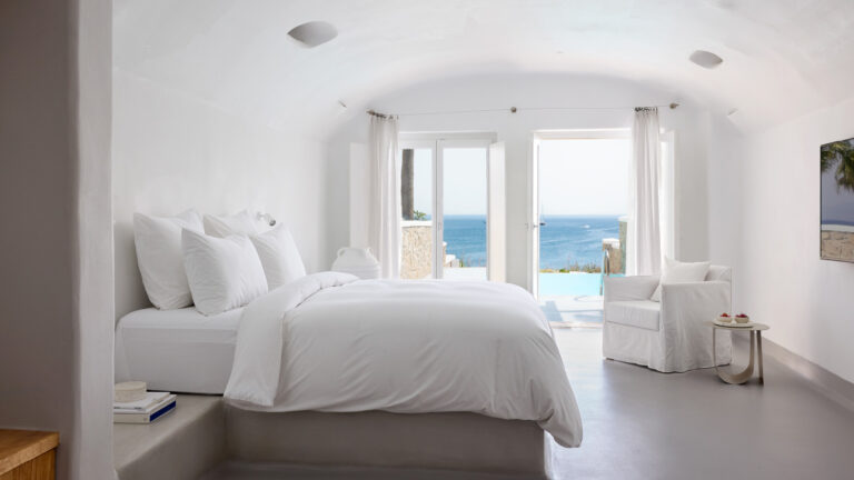 Open Plan Suites with private infinity pools are the ultimate extravagance in Mykonos Blu’s remarkable setting. Aegean-inspired romantic decor filters the sun’s rays through the half-open shutters.