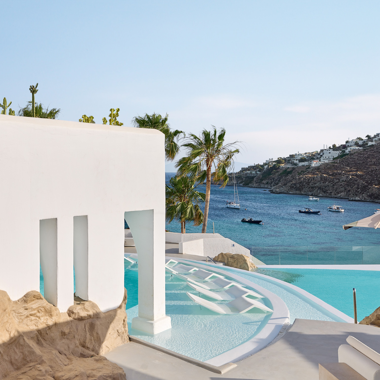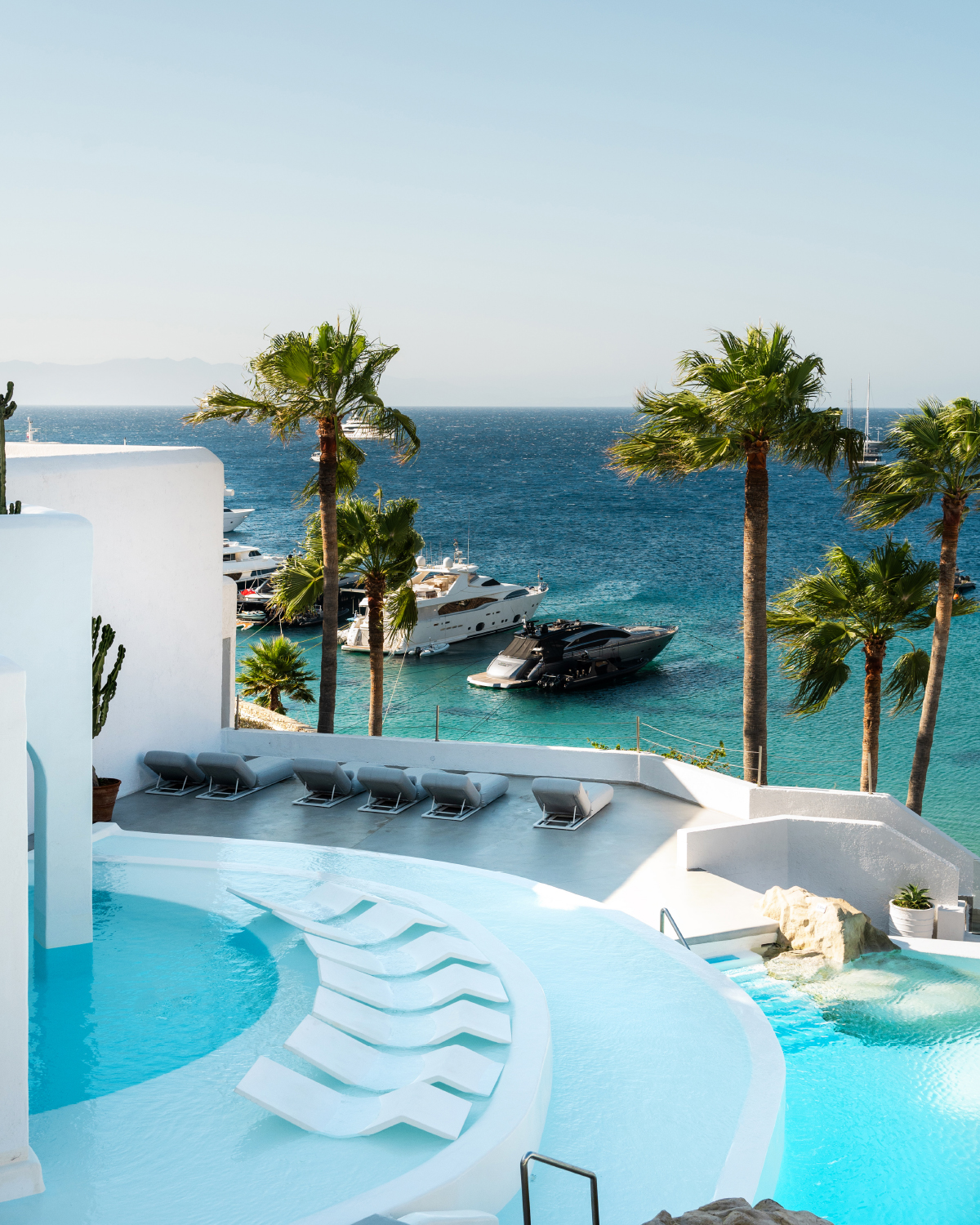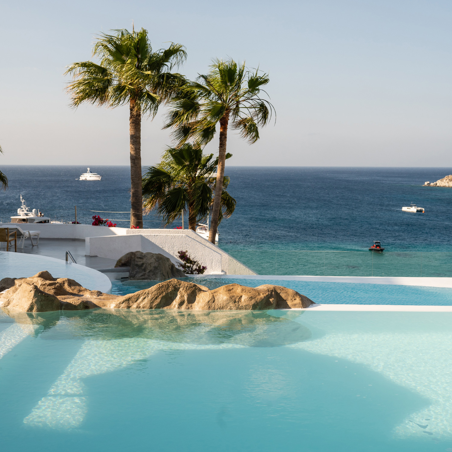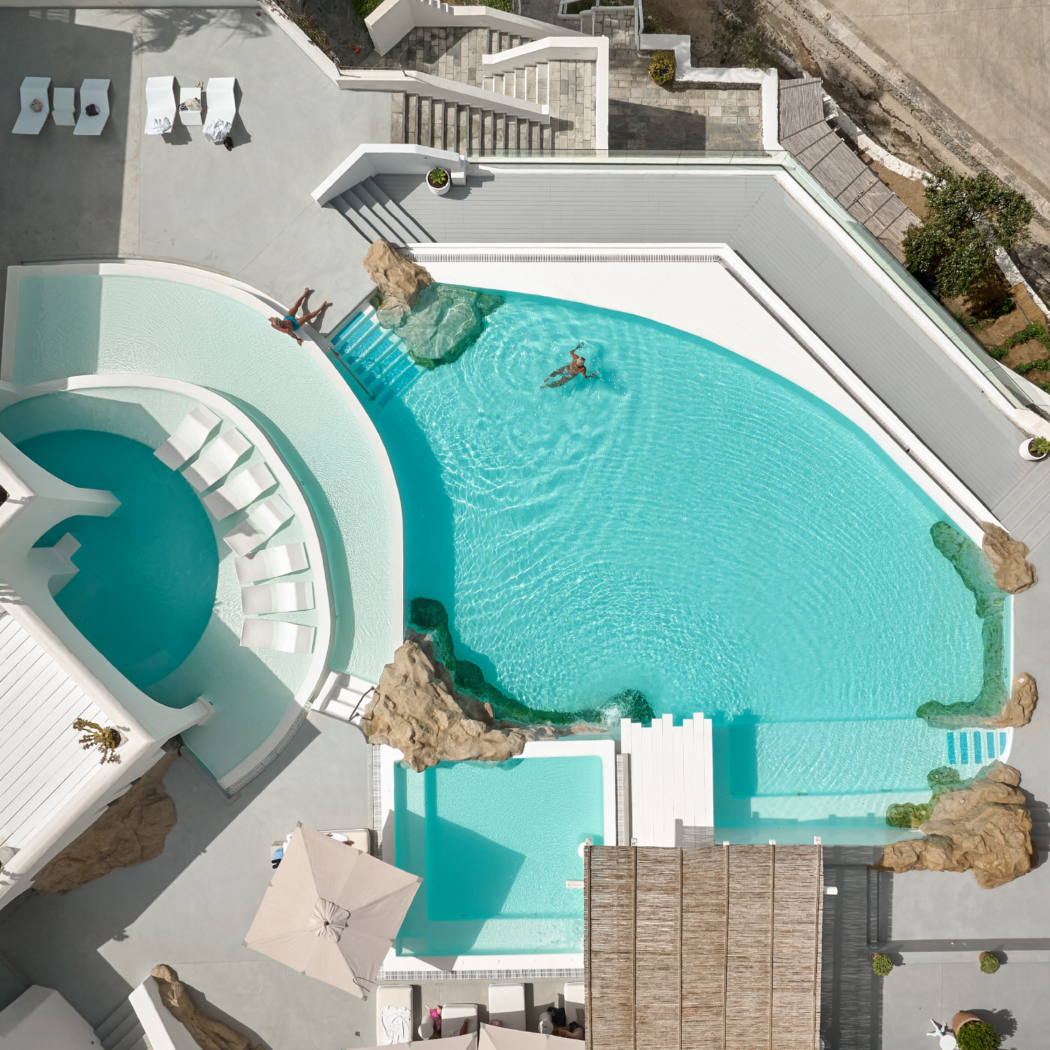 Psarou. Beach superstardom. A beach for people and yachts. Swim, shop, sunbathe, dance. Be among the summer jet set. Night lights in cobalt and turquoise blue. Resort highlight is its sleek white cave pool overlooking the sea. Shallow and deep interchange as light & shadow does. The private pools world count amounts to 20.