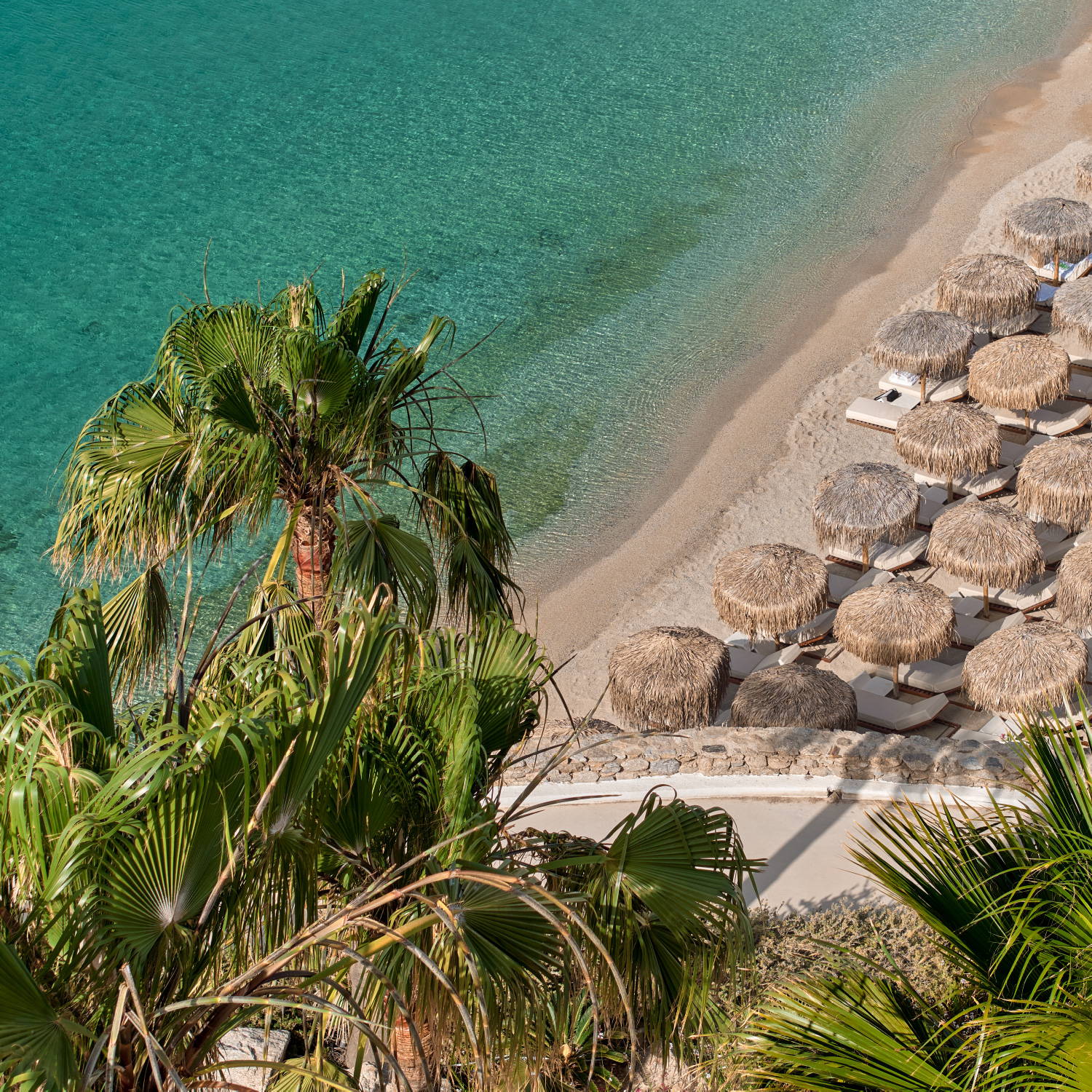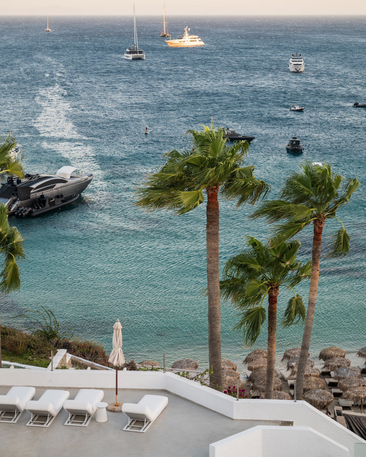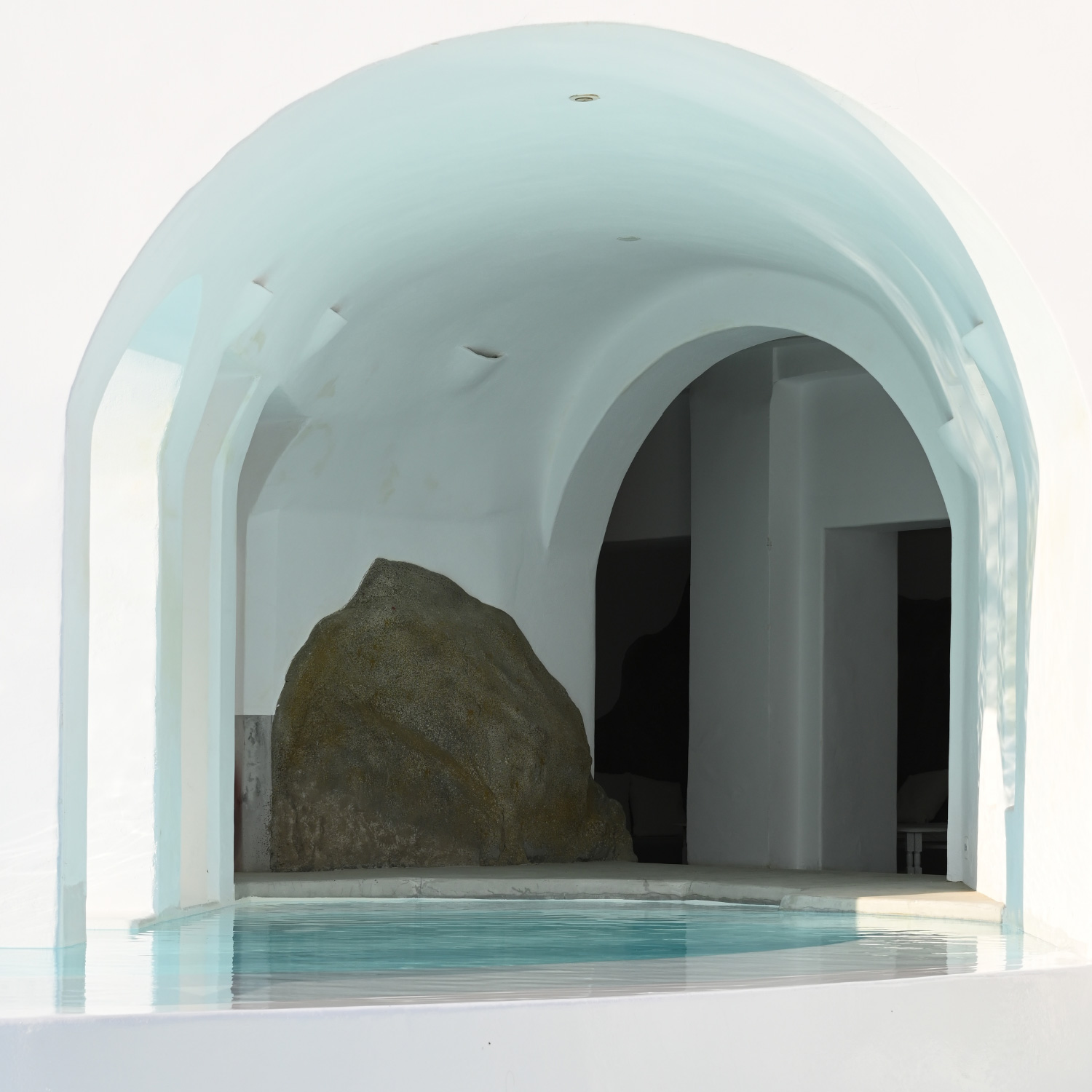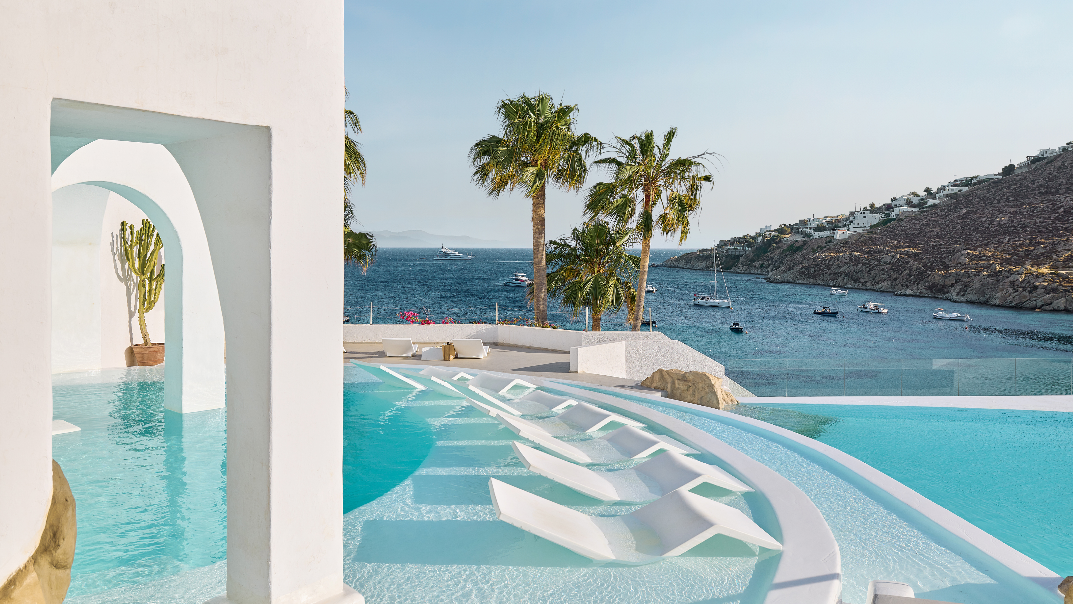 Psarou. Beach superstardom. A beach for people and yachts. Swim, shop, sunbathe, dance. Be among the summer jet set. Night lights in cobalt and turquoise blue. Resort highlight is its sleek white cave pool overlooking the sea. Shallow and deep interchange as light & shadow does. The private pools world count amounts to 20.