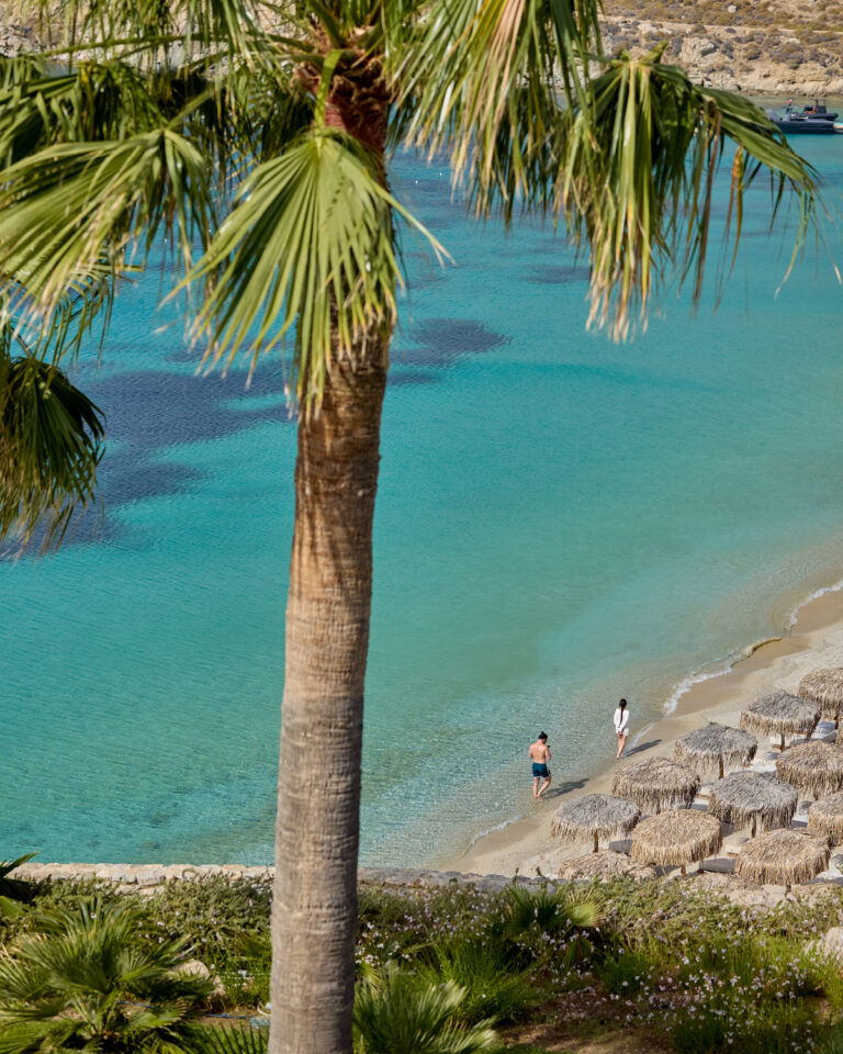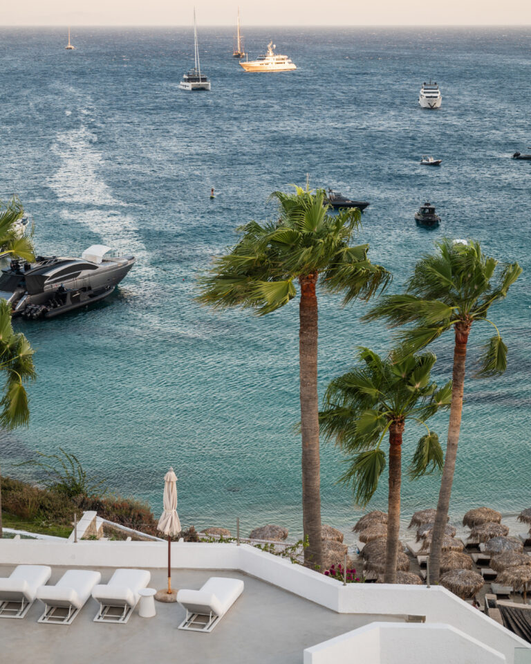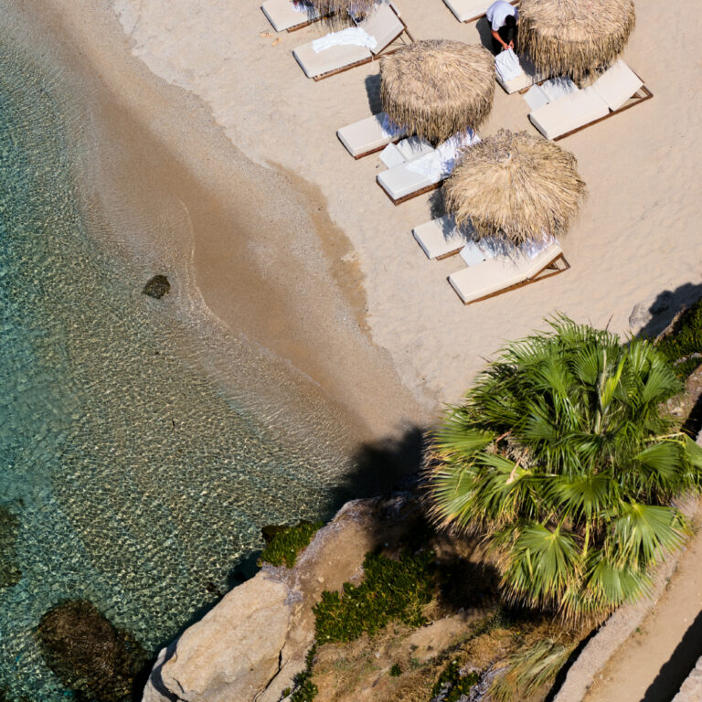 Dive in the crystal blue waters of Psarou and relax on the comfortable chaises longues under the Mykonian sun, enjoying an eclectic menu of light snacks, refreshing drinks, healthy juices and signature cocktails, available throughout the day.