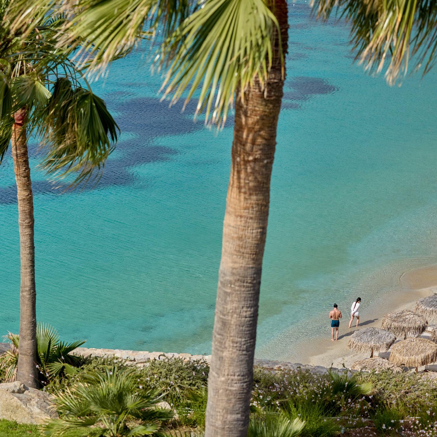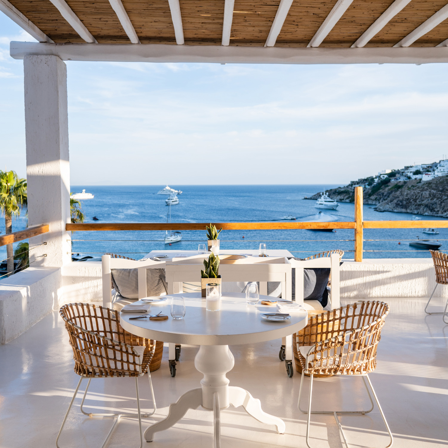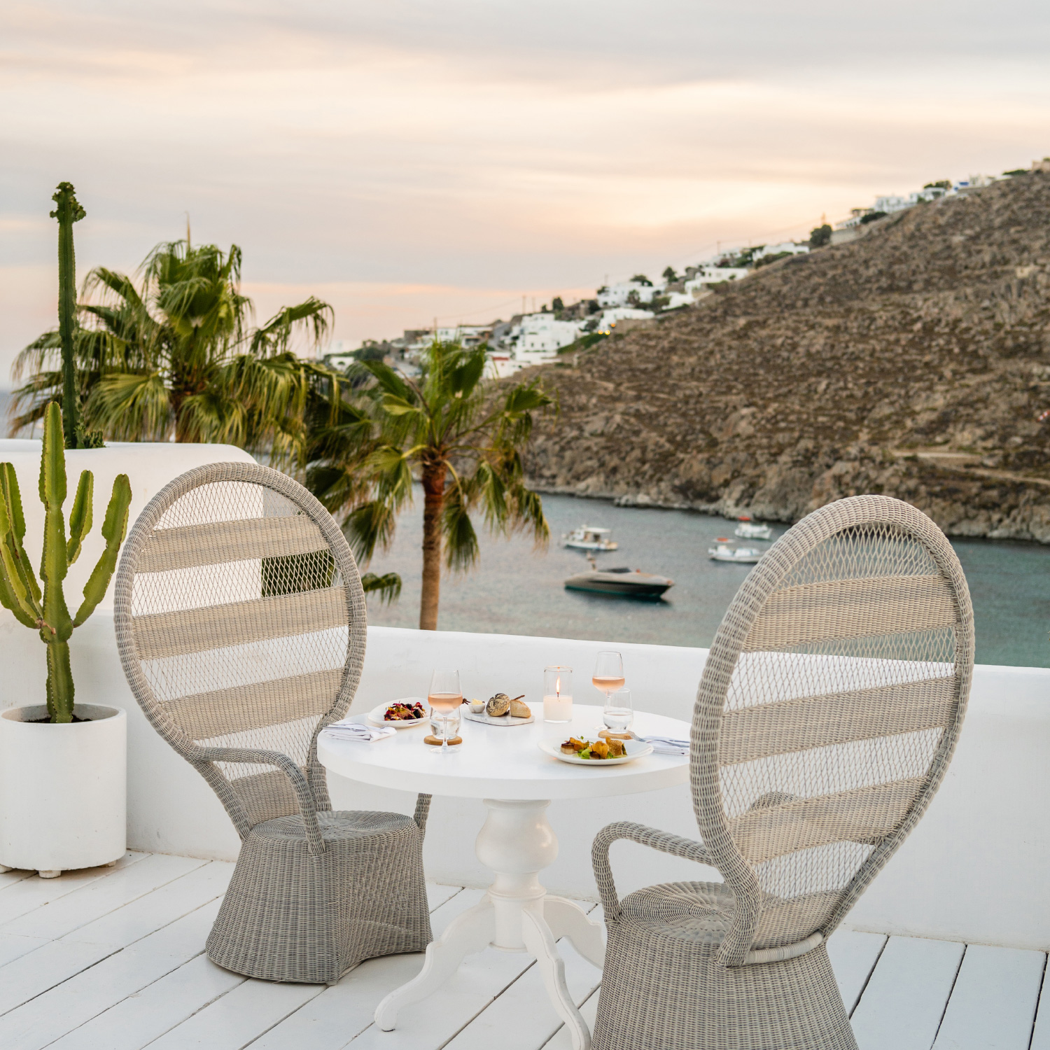 Treat yourself to a private, romantic dinner with stunning views of Psarou Beach. Savor exquisite, personalized dishes, and enjoy impeccable service in an intimate and unforgettable setting.